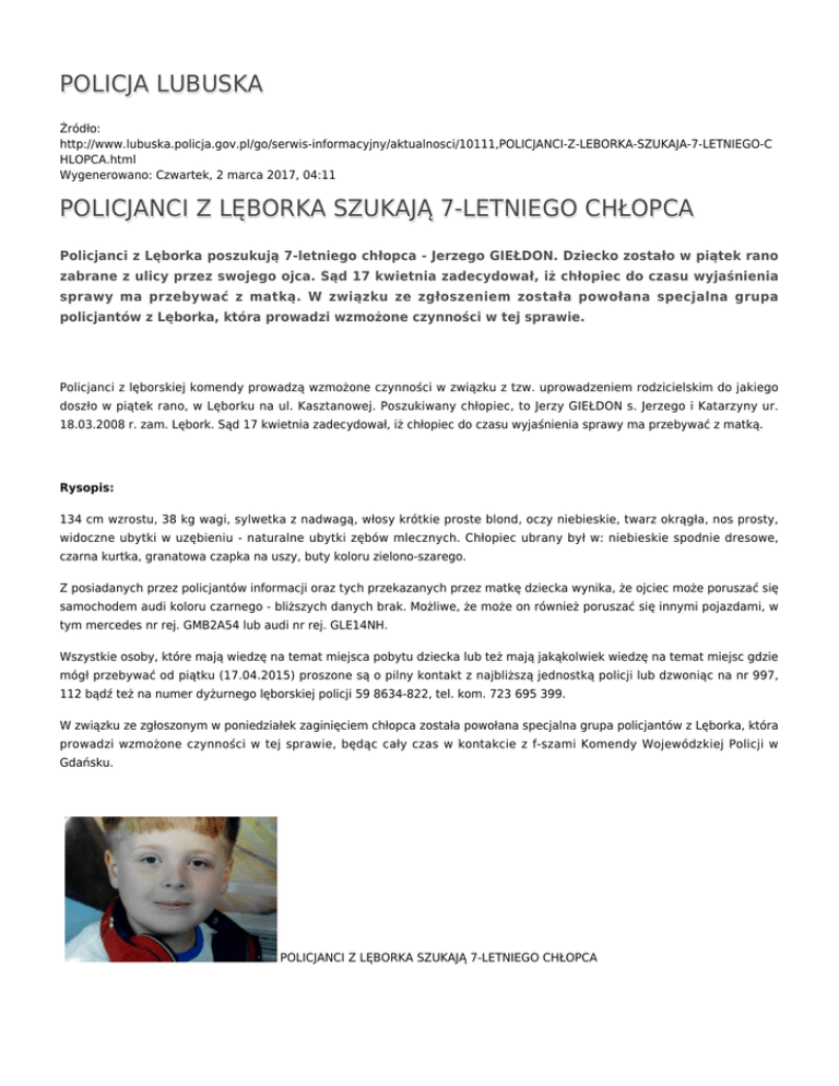 POLICJA LUBUSKA Źródło: http://www.lubuska.policja.gov.pl/go/serwis-informacyjny/aktualnosci/10111,POLICJANCI-Z-LEBORKA-SZUKAJA-7-LETNIEGO-C HLOPCA.html Wygenerowano: Czwartek, 2 marca 2017, 04:11 POLICJANCI Z LĘBORKA SZUKAJĄ 7-LETNIEGO CHŁOPCA Policjanci z Lęborka poszukują 7-letniego chłopca - Jerzego GIEŁDON. Dziecko zostało w piątek rano zabrane z ulicy przez swojego ojca. Sąd 17 kwietnia zadecydował, iż chłopiec do czasu wyjaśnienia sprawy ma przebywać z matką. W związku ze zgłoszeniem została powołana specjalna grupa policjantów z Lęborka, która prowadzi wzmożone czynności w tej sprawie. Policjanci z lęborskiej komendy prowadzą wzmożone czynności w związku z tzw. uprowadzeniem rodzicielskim do jakiego doszło w piątek rano, w Lęborku na ul. Kasztanowej. Poszukiwany chłopiec, to Jerzy GIEŁDON s. Jerzego i Katarzyny ur. 18.03.2008 r. zam. Lębork. Sąd 17 kwietnia zadecydował, iż chłopiec do czasu wyjaśnienia sprawy ma przebywać z matką. Rysopis: 134 cm wzrostu, 38 kg wagi, sylwetka z nadwagą, włosy krótkie proste blond, oczy niebieskie, twarz okrągła, nos prosty, widoczne ubytki w uzębieniu - naturalne ubytki zębów mlecznych. Chłopiec ubrany był w: niebieskie spodnie dresowe, czarna kurtka, granatowa czapka na uszy, buty koloru zielono-szarego. Z posiadanych przez policjantów informacji oraz tych przekazanych przez matkę dziecka wynika, że ojciec może poruszać się samochodem audi koloru czarnego - bliższych danych brak. Możliwe, że może on również poruszać się innymi pojazdami, w tym mercedes nr rej. GMB2A54 lub audi nr rej. GLE14NH. Wszystkie osoby, które mają wiedzę na temat miejsca pobytu dziecka lub też mają jakąkolwiek wiedzę na temat miejsc gdzie mógł przebywać od piątku (17.04.2015) proszone są o pilny kontakt z najbliższą jednostką policji lub dzwoniąc na nr 997, 112 bądź też na numer dyżurnego lęborskiej policji 59 8634-822, tel. kom. 723 695 399. W związku ze zgłoszonym w poniedziałek zaginięciem chłopca została powołana specjalna grupa policjantów z Lęborka, która prowadzi wzmożone czynności w tej sprawie, będąc cały czas w kontakcie z f-szami Komendy Wojewódzkiej Policji w Gdańsku. POLICJANCI Z LĘBORKA SZUKAJĄ 7-LETNIEGO CHŁOPCA POLICJANCI Z LĘBORKA SZUKAJĄ 7-LETNIEGO CHŁOPCA Ocena: 0/5 (0) Tweetnij