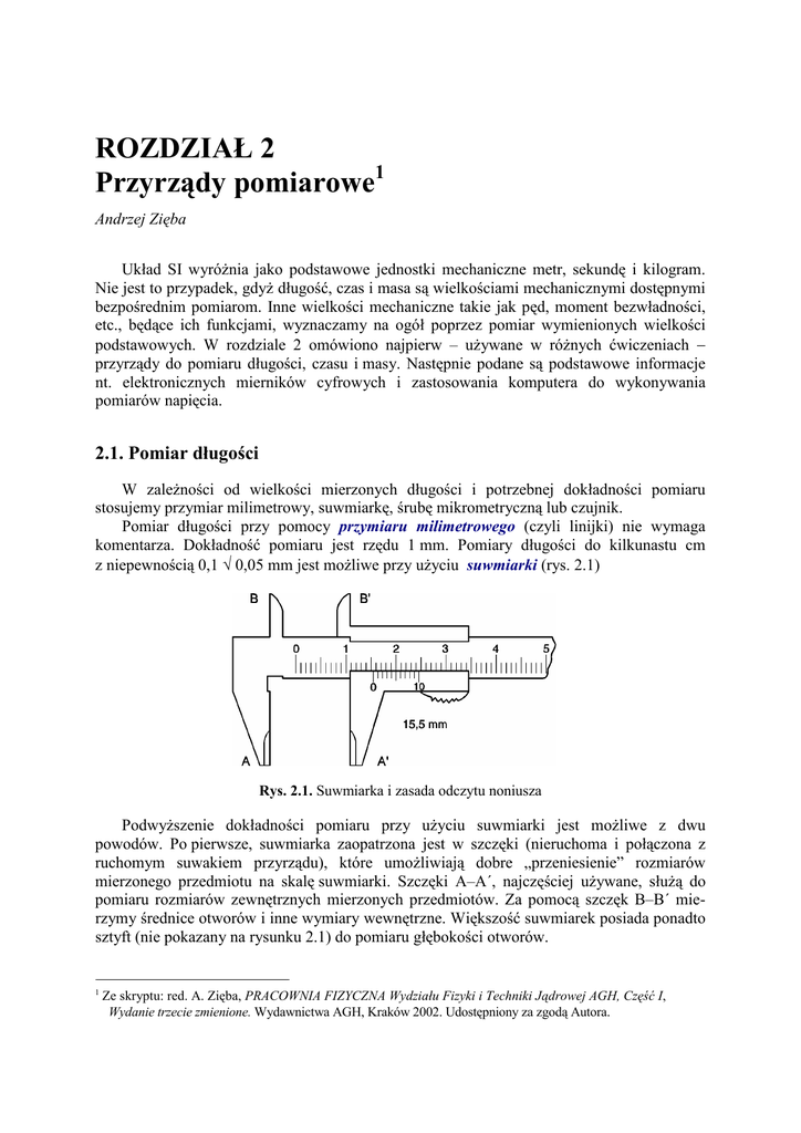 ROZDZIAŁ 2 Przyrządy pomiarowe1 Andrzej Zięba Układ SI wyróżnia jako podstawowe jednostki mechaniczne metr, sekundę i kilogram. Nie jest to przypadek, gdyż długość, czas i masa są wielkościami mechanicznymi dostępnymi bezpośrednim pomiarom. Inne wielkości mechaniczne takie jak pęd, moment bezwładności, etc., będące ich funkcjami, wyznaczamy na ogół poprzez pomiar wymienionych wielkości podstawowych. W rozdziale 2 omówiono najpierw – używane w różnych ćwiczeniach − przyrządy do pomiaru długości, czasu i masy. Następnie podane są podstawowe informacje nt. elektronicznych mierników cyfrowych i zastosowania komputera do wykonywania pomiarów napięcia. 2.1. Pomiar długości W zależności od wielkości mierzonych długości i potrzebnej dokładności pomiaru stosujemy przymiar milimetrowy, suwmiarkę, śrubę mikrometryczną lub czujnik. Pomiar długości przy pomocy przymiaru milimetrowego (czyli linijki) nie wymaga komentarza. Dokładność pomiaru jest rzędu 1 mm. Pomiary długości do kilkunastu cm z niepewnością 0,1 ÷ 0,05 mm jest możliwe przy użyciu suwmiarki (rys. 2.1) Rys. 2.1. Suwmiarka i zasada odczytu noniusza Podwyższenie dokładności pomiaru przy użyciu suwmiarki jest możliwe z dwu powodów. Po pierwsze, suwmiarka zaopatrzona jest w szczęki (nieruchoma i połączona z ruchomym suwakiem przyrządu), które umożliwiają dobre „przeniesienie” rozmiarów mierzonego przedmiotu na skalę suwmiarki. Szczęki A–A´, najczęściej używane, służą do pomiaru rozmiarów zewnętrznych mierzonych przedmiotów. Za pomocą szczęk B–B´ mierzymy średnice otworów i inne wymiary wewnętrzne. Większość suwmiarek posiada ponadto sztyft (nie pokazany na rysunku 2.1) do pomiaru głębokości otworów. 1 Ze skryptu: red. A. Zięba, PRACOWNIA FIZYCZNA Wydziału Fizyki i Techniki Jądrowej AGH, Część I, Wydanie trzecie zmienione. Wydawnictwa AGH, Kraków 2002. Udostępniony za zgodą Autora. Drugim elementem umożliwiającym zwiększenie dokładności jest noniusz. Jest to dodatkowa skala na suwaku suwmiarki. Skala noniusza suwmiarki pokazanej na rysunku 2.1 posiada długość 9 mm, podzieloną na 10 części – zatem każda działka noniusza jest o 0,1 mm mniejsza od działek skali głównej. Jeżeli suwmiarka nastawiona jest na dokładną wielokrotność milimetra, zerowa kreska noniusza przedłuża zerową kreskę skali milimetrowej. Po przesunięciu noniusza o np. 0,5 mm piąta kreska skali noniusza przedłuża jedną z kresek skali głównej (piątą). Zatem zerowa kreska noniusza wskazuje ilość całych milimetrów, a numer kreski skali noniusza przedłużającej jedną z kresek skali milimetrowej jest równy ilości dziesiętnych milimetra. Przedstawiony noniusz o 10 kreskach umożliwia odczyt z dokładnością 0,1 mm, w przypadku noniusza o 20 kreskach rozdzielczość wynosi 0,05 mm. Zasada noniusza bywa również stosowana do pomiaru kątów. W naszej pracowni spotyka się noniusz w spektrometrze z siatką dyfrakcyjną i w polarymetrze. Śruba mikrometryczna (rys. 2.2) pozwala mierzyć z dokładnością do 0,01 mm. Zgodnie z nazwą zasadniczym elementem przyrządu jest (niewidoczna z zewnątrz) precyzyjna śruba o skoku 0,5 mm. Rys. 2.2. Śruba mikrometryczna Mierzony przedmiot umieszcza się między nieruchomym i ruchomym kowadełkiem przyrządu i delikatnie dokręca śrubę. Dla zabezpieczenia śruby przed przesuwaniem się punktu zerowego na skutek zbyt mocnego dociskania szczęk, śruba jest zaopatrzona w sprzęgiełko (oznaczone przez S na rysunku 2.2) zapewniające zawsze ten sam nacisk. Zabezpiecza to również mierzony przedmiot przed zgnieceniem. Obrotu bębna z podziałką należy dokonywać obracając główkę sprzęgiełka. Wynik pomiaru odczytujemy przy użyciu dwu skal. Jedna − nieruchoma, ma podziałkę milimetrową z zaznaczonymi połówkami milimetrów. Druga skala znajduje się na bębnie mierzącym kąt obrotu śruby. Skala bębna jest podzielona na 50 działek. Ilość całych milimetrów i ewentualnie połówek milimetra mierzonej długości odczytuje się na skali nieruchomej. Do tej długości należy dodać wskazania bębna w zakresie od zera do 0,50 mm. Uwaga. Patrz rysunek 2.2 pokazujący pomiar długości 3,64 mm. Typowym błędem grubym przy pomiarze jest właśnie nieuwzględnienie połówki milimetra przy odczycie. Przed przystąpieniem do pomiarów należy sprawdzić, czy przy zetknięciu się kowadełek wskazanie skali jest zerowe. Jeśli nie, należy przy pomiarach uwzględnić odpowiednią poprawkę. Czujnik zegarowy (rys. 2.3) podobnie jak śruba mikrometryczna ma dokładność 0,01 mm. Pomiar przy pomocy czujnika jest szybki i wygodny, ale w praktyce czujnikiem można mierzyć tylko przesunięcie czyli zmianę długości, jak np. wydłużenie drutu pod wpływem przyłożonej siły. Przesunięcie suwaka czujnika za pomocą układu kół zębatych przenosi się na dwie wskazówki. Wskazówka duża wykonuje pełny obrót przy przesunięciu o 1 mm. Skala wskazówki dużej podzielona jest na 100 części, więc jednej działce odpowiada 0,01 mm. Wskazówka mała pokazuje liczbę całych milimetrów. Rys. 2.3. Czujnik zegarowy 2.2. Pomiar czasu Podstawową metodą pomiaru czasu jest porównanie badanego interwału czasu z liczbą okresów zjawisk periodycznych. Przykładowo, Galileusz mierzył czas w swoich doświadczeniach nad ruchem jednostajnie przyśpieszonym przez liczenie własnego pulsu. W zegarach mechanicznych tym zjawiskiem okresowym są oscylacje balansu zegara, zależne od momentu bezwładności balansu i momentu siły wytworzonego przez spiralną sprężynkę. Drgania balansu zliczane są przez układ kół zębatych sprzężonych ze wskazówkami. Obecnie prawie wszystkie pomiary czasu wykonuje się przy użyciu elektronicznych zegarów kwarcowych. Podstawą wysokiej dokładności czasomierzy kwarcowych jest też zjawisko mechaniczne – szybkie drgania małej płytki wycięte