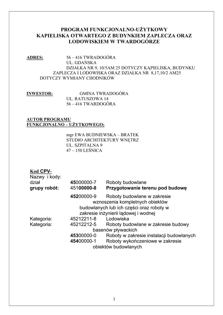 PROGRAM FUNKCJONALNO-UŻYTKOWY KAPIELISKA OTWARTEGO Z BUDYNKIEM ZAPLECZA ORAZ LODOWISKIEM W TWARDOGÓRZE ADRES: 56 – 416 TWRADOGÓRA UL. GDAŃSKA DZIAŁKA NR 9, 10/5AM 25 DOTYCZY KĄPIELISKA, BUDYNKU ZAPLECZA I LODOWISKA ORAZ DZIAŁKA NR 8,17,10/2 AM25 DOTYCZY WYMIANY CHODNIKÓW INWESTOR: GMINA TWRADOGÓRA UL. RATUSZOWA 14 56 – 416 TWARDOGÓRA AUTOR PROGRAMU FUNKCJONALNO – UŻYTKOWEGO; mgr EWA BUDNIEWSKA – BRATEK STUDIO ARCHITEKTURY WNĘTRZ UL. SZPITALNA 9 47 – 150 LEŚNICA Kod CPVNazwy i kody: dział grupy robót: Kategoria: Kategoria: 45000000-7 45100000-8 Roboty budowlane Przygotowanie terenu pod budowę 45200000-9 Roboty budowlane w zakresie wznoszenia kompletnych obiektów budowlanych lub ich części oraz roboty w zakresie inżynierii lądowej i wodnej 45212211-8 Lodowiska 45212212-5 Roboty budowlane w zakresie budowy basenów pływackich 45300000-0 Roboty w zakresie instalacji budowlanych 45400000-1 Roboty wykończeniowe w zakresie obiektów budowlanych 1 SPIS ZAWARTOŚCI PROGRAMU CZĘŚĆ OPISOWA PROGRAMU FUNKCJONALNO – UŻYTKOWEGO 1. OPIS OGÓLNY PRZEDMIOTU ZMAÓWIENIA Przedmiot zamówienia Zestawienie powierzchni Aktualne uwarunkowania wykonania przedmiotu zamówienia Ogólne właściwości funkcjonalno-użytkowe Właściwości geotechniczne podłoża Posadowienie - opis ogólny Założenia projektowe do części konstrukcyjnej 2. SZEGÓŁOWE WŁAŚCIWOŚCI FUNKCJONALNO-UŻYTKOWE Budynek zaplecza kąpieliska Zaplecze lodowiska Załącznik nr 1/1/10 zagospodarowanie terenu Technologia małej gastronomii Obsługa osób niepełnosprawnych Obsługa sezonowego lodowiska demontowanego Wskaźnik określający udział powierzchni ruchu w powierzchni netto Określenie wielkości możliwych przekroczeń lub pomniejszenia przyjętych parametrów powierzchni i kubatur lub wskaźników. 3. WYMAGANIA INWESTORA W STOSUNKU DO PRZEDMIOTU ZAMÓWIENIA Przygotowanie terenu budowy Wymagania dotyczące architektury i konstrukcji 4. WYMAGANIA DOTYCZĄCE INSTALACJI I SIECI Przyłącza i sieci wod-kan Instalacje wewnętrzne 5. OPIS TECHNICZNY WYTYCZNYCH DO PROJEKTU ZAGOSPODAROWANIA TERENU Istniejący stan zagospodarowania terenu Wymagania dotyczące zagospodarowania terenu 6. WYMAGANIA W STOSUNKU DO PRZEDMIOTU ZAMÓWIENIA 7. ZAŁ 1 ZAŁOŻENIA PROGRAMOWE CZĘŚCI BASENOWEJ Technologia, technika, konstrukcja, wyposażenie i eksploatacja) 8. Zestawienie urządzeń techniki basenowej CZĘŚĆ INFORMACYJNA PROGRAMU FUNKCJONALNO-UŻYTKOWEGO 9.1 Decyzja o warunkach zabudowy i zagospodarowania terenu 9.2 Mapa zasadnicza do celów projektowych w skali 1:500 9.3 Oświadczenie o posiadanym prawie do dysponowania nieruchomością na cele budowlane 9.4 Decyzja na lokalizację zjazdu 9.5 Wypis i wyrys z rejestru gruntów 9.6 Warunki techniczne podłączenia do sieci wod-kan 9.7 Zapewnienie dostawy wody odbioru ścieków 9.8 Warunki przyłączenia do sieci elektroenergetycznej – umowa zrealizowana 9.9 Rozporządzenie Rady Ministrów z 6 maja 1997r. w sprawie określenia warunków bezpieczeństwa osób przebywających w górach, pływających, kąpiących się i uprawiających sporty wodne CZĘŚĆ GRAFICZNA 10.1 Projekt zagospodarowania terenu 2 10.2 Projekt lokalizacji parkingów od ul. długiej 10.3 Wymiary niecek basenowych 10.4 Rzut Przyziemia w skali 1:100 zaplecze kąpieliska i lodowiska 10.5 Rzut dachu SPECYFIKACJE TECHNICZNE WYKONANIA I ODBIORU ROBÓT Załącznik Nr 1 ST - Branża architektoniczna. Załącznik Nr 2 ST - Branża drogowa. Załącznik Nr 3 ST - Roboty przygotowawcze. Załącznik Nr 4 ST - Roboty ziemne. Załącznik Nr 5 ST - Mury oporowe. Załącznik Nr 6 ST - Przyłącza wodociągowe, kanalizacyjne i gazowe. Załącznik Nr 7 ST - Instalacja pompy ciepła. Załącznik Nr 8 ST - Kanalizacja deszczowa. Załącznik Nr 9 ST - Lodowiska. Załącznik Nr 10 ST - Roboty murowe: Załącznik Nr 11.1. ST Załącznik Nr 11.2. ST Załącznik Nr 11.3. ST Załącznik Nr 11.4. ST Załącznik Nr 11.5. ST Załącznik Nr 11.6. ST - Załącznik Nr 11.7. ST - Załącznik Nr 11.8. ST Załącznik Nr 11.9. ST Załącznik Nr 11.10. ST Załącznik Nr 11.11. ST Załącznik Nr 11.12. ST - Załącznik Nr 11.13. ST Załącznik Nr 11.14. ST - Roboty ziemne. Roboty betonowe i żelbetowe. Roboty murarskie. Kominy z cegły pełnej. Izolacje. Wewnętrzna instalacja elektryczna. Wewnętrzna instalacje sanitarna, wody zimnej ciepłej, centralnego ogrzewania i gazowa. Instalacja sygnalizacji wykrywania pożaru. Instalacja centralnego ogrzewania. Posadzki. Stolarka budowlana. Tynki zewnętrzne elewacji. Roboty wykończeniowe-powłoki malarskie zewnętrzne i wewnętrzne. Tynki zewnętrzne elewacji. Załącznik Nr 12 ST - System monitoringu wizyjnego. Załącznik Nr 13 ST - Schody. Załącznik Nr 14 ST - Zieleń drogowa. 3 CZĘŚĆ OPISOWA DO PROGRAMU FUNKCJONALNO-UŻYTKOWEGO KĄPIELISKA OTWARTEGO Z BUDYNKIEM ZAPLECZA ORAZ LODOWISKIEM W TWARDOGÓRZE I. OPIS OGÓLNY PRZEDMIOTU ZAMÓWIENIA. 1. Przedmiotem zamówienia jest opracowanie i realizacja dokumentacji projektowej kąpieliska otwartego w sezonie letnim z budynkiem zaplecza oraz sezonowego lodowiska demontowanego działającego w sezonie zimowym. Kąpielisko przeznaczone jest do celów rekreacyjnych i sportowych głównie dla mieszkańców Gminy Twardogóra oraz innych okolicznych miejscowości. 1.1. ZESTAWIENIE POWIERZCHNI. POWIERZCHNIA ZABUDOWY: • budynek zaplecza kąpieliska – 302,45 m2; • niecka basenowa – 723 m2 POWIERZCHNIA BOISKA I LODOWISKA WRAZ Z ZAPLECZEM: 1063 m2 POWIERZCHNIA UTWARDZONEJ PLAŻY, DRÓG I PARKINGÓW: 2745,75 m2 1.2. AKTUALNE UWARUNKOWANIA WYKONANIA PRZEDMIOTU ZAMÓWIENIA. 1.3. WŁAŚCIWOŚCI GEOTECHNICZNE PODŁOŻA. W październiku 2002r. firma „Geostandard” z Wrocławia, ul. Biała 22 opracowała dokumentację geologiczna, która stanowi podstawę do założeń projektowych podłoża budowlanego. W podłożu występują grunty zróżnicowane litologicznie, o dużej zmienności parametrów geotechnicznych. Dominują grunty w stan