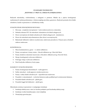 STANDARD TECHNICZNY „BUDYNKU A” PRZY UL. EMILII PLATER/RAGINISA Budynek mieszkalny, wielorodzinny z usługami w parterze. Składa się z pięciu kondygnacji nadziemnych i jednej podziemnej, w której znajdują się boksy garażowe. Budynek posiada dwie klatki schodowe, każda wyposażona w cichobieżną windę. WYKOŃCZENIE ZEWNĘTRZNE BUDYNKU: 1. Elewacja - ocieplenie styropianem + tynk cienkowarstwowy mineralny. 2. Stolarka okienna PCV do mieszkań i aluminiowa do lokali usługowych. 3. Drzwi zewnętrzne do klatek schodowych i lokali usługowych - aluminiowe. 4. Drzwi do mieszkań antywłamaniowe (bez drzwi wewnętrznych). 5. Balustrady balkonów stalowe ocynkowane, malowane proszkowo. Poręcze przy schodach stalowe malowane. KONSTRUKCJA: 1. Płyta fundamentowa, garaż - w całości żelbetowe. 2. Ściany zewnętrzne i ściany nośne – bloczki silikatowe gr. 18cm lub 24cm. 3. Ściany działowe mieszkań murowane z bloczków silikatowych gr. 8cm lub 12cm. 4. Stropy kondygnacji wylewane żelbetowe. 5. Podciągi i słupy wylewane żelbetowe. 6. Dach budynku żelbetowy kryty papą. ELEMENTY WYKOŃCZENIOWE: 1. Ściany kondygnacji mieszkalnych – tynki gipsowe. 2. Sufity mieszkań – tynki gipsowe cienkowarstwowe. 3. Ściany i sufity klatek schodowych – szpachlowane malowane. 4. Posadzki w mieszkaniach – wylewka betonowa jako podkład pod wykończenie lokatora. 5. Posadzki klatek schodowych – płytki gres. 6. Posadzki loggii lub balkonów – płytki gres. Mieszkania zostaną wyposażone w następujące instalacje: 1. Instalacja elektryczna z sieci (w kuchni podejście pod kuchenkę elektryczną). 2. Instalacja wodno-kanalizacyjna z sieci miejskiej. 3. Wentylacja grawitacyjna. 1 4. Ogrzewanie, woda c.w.u. i z.w.u z sieci miejskiej poprzez indywidualne centrale ciepła logotermy. W instalacji wykorzystane będą grzejniki płytowe w pokojach i drabinkowe lub panelowe w łazienkach. 5. Instalacje wewnętrzne. Przewiduje się następujące instalacje wewnętrzne: a. Ogólne oświetlenie i gniazda b. Siłowe zasilenie kuchenki elektrycznej c. Sygnalizacyjna domofonowa d. RTV e. 6. Telefoniczna Łazienki i kuchnie będą wyposażone w podejścia (bez armatury tj. baterii, wanny, zlewozmywaka, kuchenki). BOKSY GARAŻOWE 1. Ściany z bloczków wapienno-piaskowych gr.8cm, nietynkowane. 2. Bramy uchylne pełne. 3. Wentylacja mechaniczna wyciągowa z każdego boksu, nawiewna z ciągów komunikacyjnych garażu poprzez ażurową kratę nad bramą. 4. Instalacja elektryczna układana w korytkach instalacyjnych, oprawy świetlówkowe szczelne, włącznik pojedynczy po lewej stronie na wjeździe do garażu, opomiarowanie – podliczniki do każdego boksu. 5. Posadzka - beton zacierany na gładko. 2
