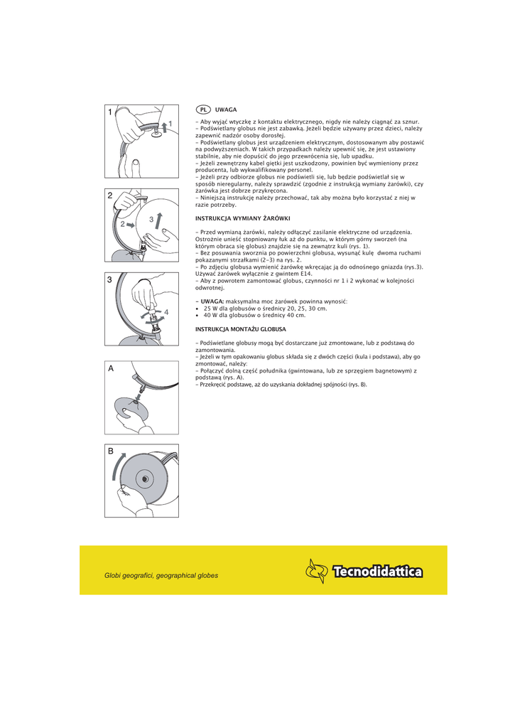 PL UWAGA - Aby wyjąć wtyczkę z kontaktu elektrycznego, nigdy nie należy ciągnąć za sznur. - Podświetlany globus nie jest zabawką. Jeżeli będzie używany przez dzieci, należy zapewnić nadzór osoby dorosłej. - Podświetlany globus jest urządzeniem elektrycznym, dostosowanym aby postawić na podwyższeniach. W takich przypadkach należy upewnić się, że jest ustawiony stabilnie, aby nie dopuścić do jego przewrócenia się, lub upadku. - Jeżeli zewnętrzny kabel giętki jest uszkodzony, powinien być wymieniony przez producenta, lub wykwalifikowany personel. - Jeżeli przy odbiorze globus nie podświetli się, lub będzie podświetlał się w sposób nieregularny, należy sprawdzić (zgodnie z instrukcją wymiany żarówki), czy żarówka jest dobrze przykręcona. - Niniejszą instrukcję należy przechować, tak aby można było korzystać z niej w razie potrzeby. INSTRUKCJA WYMIANY ŻARÓWKI - Przed wymianą żarówki, należy odłączyć zasilanie elektryczne od urządzenia. Ostrożnie unieść stopniowany łuk aż do punktu, w którym górny sworzeń (na którym obraca się globus) znajdzie się na zewnątrz kuli (rys. 1). - Bez posuwania sworznia po powierzchni globusa, wysunąć kulę dwoma ruchami pokazanymi strzałkami (2-3) na rys. 2. - Po zdjęciu globusa wymienić żarówkę wkręcając ją do odnośnego gniazda (rys.3). Używać żarówek wyłącznie z gwintem E14. - Aby z powrotem zamontować globus, czynności nr 1 i 2 wykonać w kolejności odwrotnej. - UWAGA: maksymalna moc żarówek powinna wynosić: • 25 W dla globusów o średnicy 20, 25, 30 cm. • 40 W dla globusów o średnicy 40 cm. INSTRUKCJA MONTAŻU GLOBUSA - Podświetlane globusy mogą być dostarczane już zmontowane, lub z podstawą do zamontowania. - Jeżeli w tym opakowaniu globus składa się z dwóch części (kula i podstawa), aby go zmontować, należy: - Połączyć dolną część południka (gwintowana, lub ze sprzęgiem bagnetowym) z podstawą (rys. A). - Przekręcić podstawę, aż do uzyskania dokładnej spójności (rys. B). Globi geografici, geographical globes