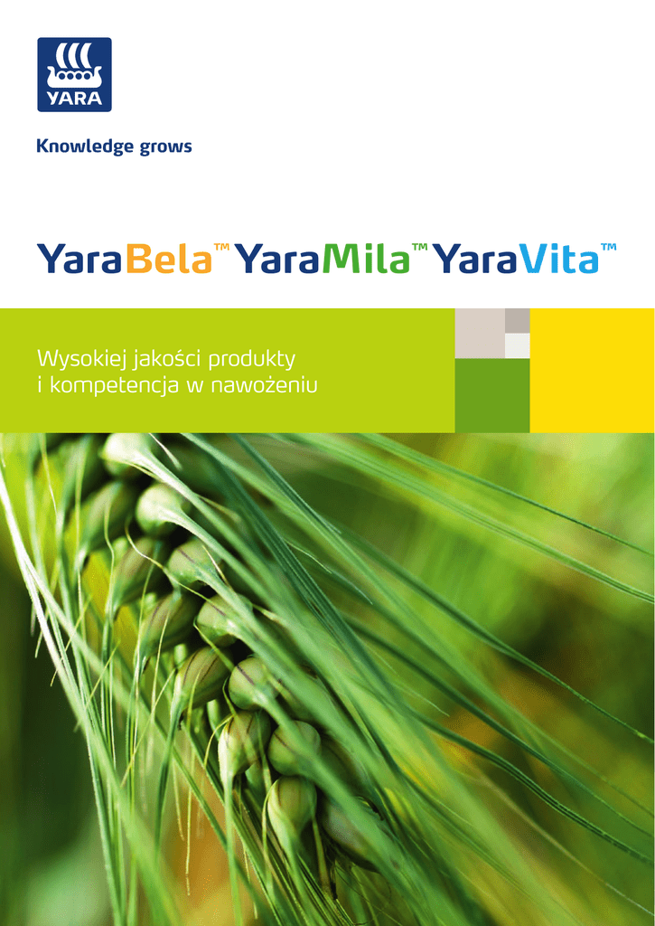 YaraBela YaraMila YaraVita ™ Wysokiej jakości produkty i kompetencja w nawożeniu ™ ™ YaraBela™ – nawozy azotowe Zawartość składników pokarmowych w nawozach Yara [%] Nawóz N ogółem N-NO3 N-NH4 N-NH2 P2O5 K2O MgO CaO SO3 27,0 13,5 13,5 — — — 4,0 7,0 — 24,0 12,0 12,0 — — — 1,5 12,0 15,0 33,5 16,9 16,6 — — — — — — 34,5 17,3 17,2 — — — — — — 34 5,8 0,5 27,7 — — — 10,6 — YaraBela™ EXTRAN 27 (CAN) Saletra wapniowo-amonowa 27 N + 4 MgO + 7 CaO YaraBela™ SULFAN 24 Saletra wapniowo-amonowa 24 N + 6 S + 12 CaO YaraBela™ EXTRAN 33,5 Saletra amonowa granulowana 33,5 N YaraBela™ Prilled N 34,5 Saletra amonowa 34,5 N Yara SuperStart Saletra wapniowa z mocznikiem 34 N+ 10,6 CaO 2 | YaraMila™ – nawozy wieloskładnikowe pogłówne lub przedsiewne typu Nitrofoska – koncepcja ACTYVA Zawartość składników pokarmowych w nawozach Yara [%] Nawóz N ogółem N-NO3 N-NH4 P2O5 K2O MgO CaO SO3 B Mn — Na 14,0 6,0 8,0 14,0 21,0 0,7 4,3 — 0,02 — 15,0 6,3 8,7 8,0 10,0 1,5 — 5,0 0,1 0,6 8,0 16,0 6,5 9,5 16,0 16,0 — 4,9 — — — — 16,0 6,2 9,8 8,0 16,0 1,7 — 12,5 0,1 — — 20,0 7,8 12,2 7,0 10,0 2,0 — 10,0 — — — 21,0 9,0 12,0 6,0 12,0 0,85 — 9,0 0,02 — — YaraMila™ Viking NPK 14-14-21 YaraMila™ ProBeta NPK 15-8-10 YaraMila™ NPK 16-16-16 NOWOŚĆ! YaraMila™ RapsNPK 16-8-16 YaraMila™ NPK 20-7-10 YaraMila™ NPK 21-6-12 | 3 YaraMila™ – nawozy wieloskładnikowe pogłówne lub przedsiewne typu Nitrofoska – koncepcja ACTYVA Zawartość składników pokarmowych w nawozach Yara [%] Nawóz N ogółem N-NO3 N-NH4 P2O5 K2O MgO CaO SO3 B Mn Na 23,0 10,0 13,0 7,0 10,0 — — 7,5 0,02 — — 27,0 11,8 15,2 5,0 5,0 — — 8,0 — — — YaraMila™ NPK 23-7-10 YaraMila™ SUPERCAN NPK 27-5-5 4 | YaraMila™ – nawozy fosforowo-azotowe Zawartość składników pokarmowych w nawozach Yara [%] Nawóz N ogółem N-NO3 N-NH4 P2O5 K2O MgO CaO SO3 Zn B Fe Mn 10,0 — 10,0 47,0 — — — — 1,8 0,1 — — 19,0 7,0 12,0 17,0 — 4,0 — 15,0 0,1 0,15 — — YaraMila™ Starter NP 10-47 Nawóz typu mikrogranulat YaraMila™ Mais NP 19-17 | 5 YaraMila™ – nawozy wieloskładnikowe niskoazotowe i bezazotowe Yara Zawartość składników pokarmowych w nawozach Yara [%] Nawóz N ogółem N-NO3 N-NH4 P2O5 K2O MgO CaO SO3 Zn B Fe Mn 7,0 0,9 6,1 20,0 28,0 2,0 — 7,5 0,02 0,02 0,1 0,03 9,0 2,6 6,4 12,0 25,0 2,0 — 6,5 — 0,02 — — 8,0 1,0 7,0 24,0 24,0 — — 7,0 0,01 0,1 0,1 0,01 10,0 2,3 7,7 20,0 20,0 — — — — — — — 6,0 — 6,0 12,0 24,0 — 3,0 19,2 — — — — 5,0 — 5,0 10,0 20,0 — 6,0 23,0 0,2 — — — YaraMila™ Corn NPK 7-20-28 YaraMila™ NPK 9-12-25 YaraMila™ Crop NPK 8-24-24 Yara NPK 10-20-20 Yara NPK 6-12-24 Yara NPK 5-10-20 6 | YaraMila™ – nawozy wieloskładnikowe niskoazotowe i bezazotowe Yara Zawartość składników pokarmowych w nawozach Yara [%] Nawóz N ogółem N-NO3 N-NH4 P2O5 K2O MgO CaO SO3 Zn B Fe Mn 5,0 — 5,0 10,0 25,0 — 5,0 18,0 — — — — 5,0 — 5,9 14,0 28,0 — 3,0 12,5 — — — — — — — 15,0 30,0 — 7,0 10,5 0,5 — — — — — — 18,0 30,0 — 6,0 6,5 0,3 — — 0,2 — — — 20,0 30,0 — 6,5 5,0 — — — — Yara NPK 5-10-25 Yara NPK 5-14-28 Yara PK 15-30 Yara PK 18-30 Yara PK 20-30 | 7 YaraVita™ – mikroelementowe nawozy dolistne o wysokiej koncentracji Zawartość składników pokarmowych w nawozach Yara [%] Nawóz YaraVita™ ZBOŻE Kanister 10 litrów – masa netto 16,46 kg Jesień: 0,5–1 l/ha od fazy 12 BBCH, tj. od 2 liścia*. Wiosna: 1–2 l/ha od 21–37 BBCH, tj. od fazy krzewienia do ukazania się liścia flagowego*. 0,5–1 l/ha od 39–49 BBCH, tj. od fazy liścia flagowego do początku kłoszenia*. * łączna zalecana dawka do 2 l/ha. N MgO Cu Mn Zn 64 g/l 250 g/l 50 g/l 150 g/l 80 g/l YaraVita™ Brassitrel Pro Kanister 10 litrów – masa netto 15,37 kg Rzepak ozimy: Jesień: 1–2 l/ha od fazy 4–6 liści. Wiosna: 2–4 l/ha po ruszeniu wegetacji do fazy zielonego pąka. Rzepak jary: 2–4 l/ha w fazie 4–9 liści. N MgO CaO B Mn Mo 69 g/l 118 g/l 125 g/l 60 g/l 70 g/l 4 g/l YaraVita™ KombiPhos Kanister 10 litrów – masa netto 14,75 kg Ziemniaki: 3–5 l/ha podczas inicjacji bulw, 3–5 l/ha od początku powiększania bulw. Zboża: 3–5 l/ha w fazie krzewienia. W razie potrzeby zabieg można powtórzyć po 10–14 dniach. Kukurydza: 5 l/ha w fazie 4–8 liści. W razie potrzeby zabieg można powtórzyć po 10–14 dniach. Rzepak: 3–5 l/ha w fazie 4–6 liści i ponownie w fazie wydłużania się łodygi. Unikać zabiegów podczas kwitnienia. Buraki cukrowe: 5 l/ha w fazie 4–6 liści. W razie potrzeby zabieg można powtórzyć po 10–14 dniach. P2O5 K2O MgO Mn Zn 440 g/l 75 g/l 67 g/l 10 g/l 5 g/l 3–5 kg/ha od fazy 4–6 liści. W razie potrzeby zabieg można powtórzyć po 10–14 dniach. MgO S Na B Mn 166 g/kg 68 g/kg 100 g/kg 40 g/kg 40 g/kg YaraVita™ KUKURYDZA Kanister 10 litrów – masa netto 14,9 kg 3–5 l/ha w fazie 4–6 liści. P2O5 K2O MgO Zn 440 g/l 75 g/l 66,7 g/l 46 g/l YaraVita™ Bortrac™ Kanister 10 litrów – masa netto 13,53 kg Rzepak ozimy: Jesień: 1–2 l/ha od fazy 4–6 liści. Wiosna: 2–3 l/ha po ruszeniu wegetacji do fazy zielonego pąka. Rzepak jary: 2–3 l/ha od fazy 4–6 liści. Buraki cukrowe: 2–3 l/ha w fazie 4–6 liści. W razie potrzeby zabieg można powtórzyć po upływie 10–14 dni. Kukurydza: 2–3 l/ha w fazie 6–8 liści. W razie potrzeby zabieg można powtórzyć po upływie 10–14 dni. Ziemniaki: 1–2 l/ha tydzień po pełnych wschodach. W razie potrzeby zabieg można powtórzyć po upływie 10–14 dni. Zboża: 1 l/ha w fazie 14–32 BBCH. B 150 g/l YaraVita™ BETATREL DF Kanister – masa netto 6 kg (mikrogranule) 8 | Gwarantowana zawartość Rekomendacja N-Sensor N-Tester Wyłączny dystrybutor: BAG Precision Farming Sp. z o.o. ul. Leśna 10 64-120 Krzemieniewo www.bagpolska.pl tel. +48 61 651 01 03, +48 61 651 40 71 K
