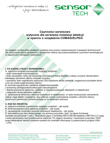 Czynności serwisowe wytyczne dla serwisów instalacji detekcji w oparciu o urządzenia COMAG/ELPEG Ze względu na specyfikę działania instalacji oraz poziom zastosowanych rozwiązań technicznych dla utrzymania pełnej sprawności i wydajności zaleca się przeprowadzanie czynności serwisujących w regularnych odstępach czasowych: I. PO KAŻDEJ PRACY SERWISOWEJ : A. optyczna kontrola poprawności wyglądu urządzeń, • brak uszkodzeń mechanicznych, • brak zarysowań, farby na obudowie, pochlapane farbą detektory należy oczyścić denaturatem zaklejając uprzednio otwory wlotowe czujnika • poprawny stan sygnalizacji optycznej LED (zapalona dioda zasilania, wygaszone pozostałe diody o ile nie został wygenerowany alarm), B. kontrola poprawności zasilania detektorów/centralki • przewody zasilające/komunikacyjne nieuszkodzone • dławiki poprawnie skręcone, zaślepki w niewykorzystanych dławikach w detektorach • załączona dioda zasilania (zielona) C. sprawdzenie drożności otworów wlotowych w detektorach, w razie konieczności udrożnienia należy zdjąć dekiel urządzenia, aby uniknąć ryzyka uszkodzenia czujnika i udrożnić otwory sprężonym powietrzem przedmuchując je od wewnątrz pokrywy. II. RAZ NA KWARTAŁ A. optyczna kontrola poprawności wyglądu urządzeń – jak wyżej B. kontrola poprawności zasilania urządzeń – jak wyżej C. sprawdzenie drożności otworów wlotowych detektorów – jak wyżej D. test elektryczny toru detekcyjnego (za pomocą przycisku „test” na płycie frontowej centralki (przytrzymać 3 sek.). Współpracujące z centralką DETCOM.3M detektory METAG.3.3 mają z kolei wbudowany test przekroczenia stężenia. Po zdjęciu obudowy i naciśnięciu przycisku TEST przez kilkanaście sekund zostanie wysłana do centralki informacja o przekroczeniu progów CNG i LPG. UWAGA ! Zaleca się przeprowadzać test w momencie najmniejszego natężenia ruchu w garażu, aby nie wywoływać nadmiernego zaniepokojenia wśród jego użytkowników (uruchomienie sygnalizacji ostrzegawczej). Załączanie toru alarmowego detektora powoduje załączenie wentylatorów w danej sekcji. Testy należy przeprowadzać z należytą ostrożnością, aby nie narazić wentylatorów na przeciążenia. III. RAZ NA ROK –coroczna kontrola stanu instalacji przez certyfikowany serwis producenta jest wymagana dla utrzymania warunków gwarancji A. optyczna kontrola poprawności wyglądu urządzeń – jak wyżej B. kontrola poprawności zasilania urządzeń – jak wyżej C. sprawdzenie drożności otworów wlotowych detektorów – jak wyżej D. test elektryczny toru detekcyjnego – jak wyżej E. prosty test gazowy toru detekcyjnego (np. źródło CNG, zapalniczka dla LPG).Poziomy reakcji można sprawdzić za pomocą urządzenia diagnozująco-programującego TURBOPROG/ESPROG F. Aktualizacja oprogramowania IV. RAZ NA 3 LATA A. optyczna kontrola poprawności wyglądu urządzeń – jak wyżej B. kontrola poprawności zasilania urządzeń – jak wyżej C. sprawdzenie drożności otworów wlotowych detektorów – jak wyżej D. rekalibracja głowic (termin rekalibracji oznaczony jest na panelu centralki, a upływ terminu sygnalizowany lokalnie pulsującą diodą AWARIA w detektorach i centralce. E. test elektryczny toru detekcyjnego – jak wyżej F. prosty test gazowy toru detekcyjnego – jak wyżej. Przeprowadzone czynności konserwacyjne i serwisowe należy udokumentować protokołem. Brak przeprowadzenia takich czynności skutkuje utratą ochrony gwarancyjnej. UWAGA! Kalibracja sensorów jest czynnością serwisową nie objętą gwarancją.