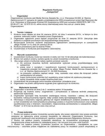 Regulamin Konkursu „Autoportret” Organizator Organizatorem konkursu jest Media Service Zawada Sp. z o.o. Warszawa 04-028, al. Stanów Zjednoczonych 51 wpisana do rejestru przedsiębiorców KRS prowadzonym przez Sąd Rejonowy dla m.st. Warszawy w Warszawie Wydział XIII Gospodarczy KRS pod numerem 000027679, NIP 11300-94-477, tel. 22 870 53 43, adres strony internetowej www.msz.com.pl zwana dalej Organizatorem. I. II. Termin i miejsce 1. Konkurs trwać będzie od dnia 24 czerwca 2013r. do dnia 3 września 2013r., w którym to dniu zostanie dokonany wybór laureatów przez Organizatora. 2. Organizator zgłoszone prace będzie przyjmował do dnia 31 sierpnia 2013r. (decyduje data nadania w urzędzie pocztowym lub bezpośredniego doręczenia). 3. Rozpoczęcie konkursu zostanie poprzedzone ogłoszeniem zamieszczonym w czasopiśmie „Magic Pocket” nr 4 z dnia 24 czerwca 2013r. 4. Konkurs prowadzony jest na terenie Polski. 5. Uczestnictwo w Konkursie jest bezpłatne i dobrowolne. III. Warunki uczestnictwa 1. Uczestnikiem konkursu może być dziecko w wieku od 3 do 12 lat (decyduje rok kalendarzowy). 2. Rodzic lub opiekun prawny wyraża zgodę na udział Uczestnika w konkursie. 3. Aby wziąć udział w konkursie należy spełnić poniższe warunki: a) Za pomocą dowolnej techniki samodzielnie wykonać pracę przedstawiającą swój autoportret, b) pracę wraz z wyciętym i wypełnionym kuponem konkursowym zamieszczonym w magazynie przesłać lub doręczyć na adres: Magic Pocket, Media Service Zawada Sp. z o.o., al. Stanów Zjednoczonych 51, 04-028 Warszawa, c) na przesyłce czytelnie napisać swoje imię, nazwisko oraz adres dla doręczeń (adres zamieszkania lub pobytu), d) kupon konkursowy powinien być wypełniony przez rodzica lub opiekuna prawnego. e) każdy Uczestnik może wysłać dowolną ilość prac. 4. Uczestnikowi nie przysługuje zwrot kosztów wykonania i przesłania prac. 5. Organizator ma prawo zatrzymania oryginału prac zgłoszonych do konkursu. IV. Wyłonienie laureata 1. Organizator w terminie od dnia 2 do 3 września wyłoni 16 laureatów. 2. Przyjmuje się kryteria oceny: oryginalność i pomysłowość w doborze techniki plastycznej, staranność wykonania. 3. Organizator sporządzi listę laureatów zawierającą imiona, nazwiska i adresy dla doręczeń laureatów, rodzaj przyznanej nagrody, datę i podpis osoby sporządzającej listę. 4. Informacja o otrzymaniu nagrody głównej lub nagród dodatkowych zostanie przesłana na adres e-mail Uczestnika lub rodzica/opiekuna prawnego podany w kuponie konkursowym oraz zostanie opublikowana wraz z imieniem, nazwiskiem, miejscowością zamieszkania w czasopiśmie „Magic Pocket ” nr 5/13 lub na stronie www.msz.com.pl V. Prawa autorskie 1. Rodzic lub opiekun prawny Uczestnika wyraża zgodę, aby prawo własności oraz prawa autorskie związane ze zgłoszoną pracą przeszły bezpłatnie na własność Organizatora Konkursu, bez ograniczeń czasowych oraz terytorialnych, zgodnie z postanowieniami Regulaminu Konkursu. 2. Rodzic lub opiekun prawny Uczestnika oświadcza, że Uczestnikowi przysługują wszelkie nieograniczone prawa autorskie do nadesłanej pracy i nie narusza ona praw osób trzecich. 3. Rodzic lub opiekun prawny Uczestnika przenosi na Organizatora - nieodpłatnie na czas nieoznaczony – autorskie prawa majątkowe do nadesłanej pracy na wszelkich polach eksploatacji w szczególności wymienionych w art. 50 ustawy z dnia 4 lutego 1994 r. o prawie autorskim i prawach pokrewnych (Dz. U. z 2006r. Nr 90, poz. 631 z późn. zm.), w tym m.in. do: utrwalenia, powielenia, rozpowszechnia , publikowania na stronach internetowych oraz w innych publikacjach wydawanych przez Organizatora we wszystkich technikach znanych w dniu złożenia oświadczenia – uprawnienie to dotyczy wielokrotnego publikowania i nie jest ograniczone w czasie i co do terytorium. Przeniesienie praw autorskich następuje w dniu wyłonienia laureatów. VI. Nagrody 1. Laureaci konkursu otrzymają nagrody w postaci: a) 1 Domek Monster Beads ufundowany przez firmę OmniPro Sp. z o.o. o wartości jednostkowej 86 zł brutto (69,91 zł netto + 0,23 zł VAT), b) 7 zestawów biżuterii Monster Beads ufundowane przez firmę OmniPro Sp. z o.o. o wartości jednostkowej 77 zł brutto (62,60 zł netto + 0,23 zł VAT), e) 8 zestawów Boingo ufundowanych przez firmę Epee Polska Sp. z o.o. o wartości jednostkowej 20 zł brutto (16,26 zł netto + 0,23 zł podatek VAT). 2. Nagroda nie może zostać zamieniona na ekwiwalent pieniężny lub inną rzeczową. 3. Jeden Uczestnik może otrzymać tylko jedną nagrodę. 4. Laureat nie ponosi jakichkolwiek opłat z tytułu otrzymania nagrody, w tym kosztów doręczenia lub podatków. 5. Odbiór nagrody: nagroda zostanie przesłana pocztą – listem poleconym w terminie 6 tygodni od daty opublikowania listy laureatów w numerze 5/2013 na podany adres dla doręczeń. VII. Reklamacje 1. Każdemu Uczestnikowi przysługuje prawo wniesienia reklamacji związanej z niniejszym Konkursem w terminie do 15 dni roboczych po zakończeniu konkursu. 2. Reklamacje należy zgłaszać na adres Organizatora. 3. Zainteresowani, zostaną powiadomieni o rozpatrzeniu reklamacji w ciągu 14 dni od daty jej otrzymania. VIII. Przetwarzanie danych osobowych Uczestników Konkursu 1. Organizator, którego dane podane są na wstępie, oświadcza, że na podstawie art. 24 ust. 1 ustawy 2. 3. 4. 5. z dnia 29 sierpnia 1997 r. o ochronie danych osobowych (tj. z 2002 r. Nr 101, poz. 926 z późn. zm.) jest administratorem podanych przez Uczestnika danych osobowych. Uczestnik konkursu poda prawdziwe dane osobowe, tj.: imię, nazwisko, adres dla doręczeń, wiek, adres e-mail. Przekazane dane będą chronione zgodnie z ustawą z dnia 29 sierpnia 1997 r. o ochronie danych osobowych (tekst jedn. Dz. U. z 2002 r., Nr 101, poz. 926, z późn. zm.). Przetwarzanie danych, w tym ich zbieranie, przechowywanie jest dokonywane w celach związanych z realizacją Konk