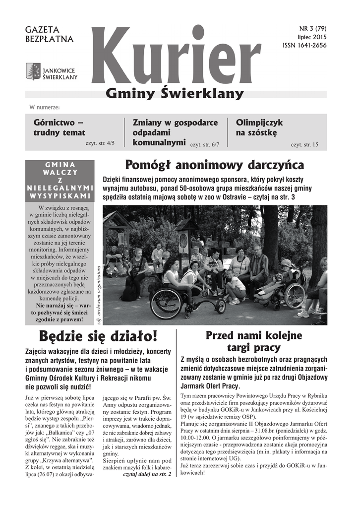 GAZETA BEZPŁATNA NR 3 (79) lipiec 2015 ISSN 1641-2656 W numerze: Górnictwo – trudny temat czyt. str. 4/5 Olimpijczyk na szóstkę czyt. str. 15 Pomógł anonimowy darczyńca GMINA WA L C Z Y Z NIELEGALNYMI WYSYPISKAMI Dzięki finansowej pomocy anonimowego sponsora, który pokrył koszty wynajmu autobusu, ponad 50-osobowa grupa mieszkańców naszej gminy spędziła ostatnią majową sobotę w zoo w Ostravie – czytaj na str. 3 zdj. archiwum organizatora W związku z rosnącą w gminie liczbą nielegalnych składowisk odpadów komunalnych, w najbliższym czasie zamontowany zostanie na jej terenie monitoring. Informujemy mieszkańców, że wszelkie próby nielegalnego składowania odpadów w miejscach do tego nie przeznaczonych będą każdorazowo zgłaszane na komendę policji. Nie narażaj się – warto pozbywać się śmieci zgodnie z prawem! Zmiany w gospodarce odpadami komunalnymi czyt. str. 6/7 Będzie się działo! Przed nami kolejne targi pracy Zajęcia wakacyjne dla dzieci i młodzieży, koncerty znanych artystów, festyny na powitanie lata i podsumowanie sezonu żniwnego – w te wakacje Gminny Ośrodek Kultury i Rekreacji nikomu nie pozwoli się nudzić! Z myślą o osobach bezrobotnych oraz pragnących zmienić dotychczasowe miejsce zatrudnienia zorganizowany zostanie w gminie już po raz drugi Objazdowy Jarmark Ofert Pracy. Już w pierwszą sobotę lipca czeka nas festyn na powitanie lata, którego główną atrakcją będzie występ zespołu „Piersi”, znanego z takich przebojów jak: „Bałkanica” czy „07 zgłoś się”. Nie zabraknie też dźwięków reggae, ska i muzyki alternatywnej w wykonaniu grupy „Krzywa alternatywa”. Z kolei, w ostatnią niedzielę lipca (26.07) z okazji odbywa- Tym razem pracownicy Powiatowego Urzędu Pracy w Rybniku oraz przedstawiciele firm poszukujący pracowników dyżurować będą w budynku GOKiR-u w Jankowicach przy ul. Kościelnej 19 (w sąsiedztwie remizy OSP). Planuje się zorganizowanie II Objazdowego Jarmarku Ofert Pracy w ostatnim dniu sierpnia – 31.08.br. (poniedziałek) w godz. 10.00-12.00. O jarmarku szczegółowo poinformujemy w późniejszym czasie - przeprowadzona zostanie akcja promocyjna dotycząca tego przedsięwzięcia (m.in. plakaty i informacja na stronie internetowej UG). Już teraz zarezerwuj sobie czas i przyjdź do GOKiR-u w Jankowicach! jącego się w Parafii pw. Św. Anny odpustu zorganizowany zostanie festyn. Program imprezy jest w trakcie dopracowywania, wiadomo jednak, że nie zabraknie dobrej zabawy i atrakcji, zarówno dla dzieci, jak i starszych mieszkańców gminy. Sierpień upłynie nam pod znakiem muzyki folk i kabareczytaj dalej na str. 2 2 J U Ż 2 6 C Z E RWC A RU S Z A P RO J E K T „ B L I S KO A Z A R A Z E M DA L E KO OD B Ł Ę D N E J R Z E C Z Y W I S TO Ś C I ” Projekt skierowany jest do uczniów szkół gimnazjalnych w Gminie Świerklany W ramach projektu realizowane będą następujące zadania: • Akademia z okazji Międzynarodowego Dnia Zapobiegania Narkomanii • Prelekcje na temat przestępstw popełnianych pod wpływem narkotyków • Warsztaty plastyczne dotyczące narkomanii • Wizyty studyjne w ośrodku dla osób uzależnionych od narkotyków • Produkcja spotu promującego życie bez uzależnień • Warsztaty teatralne dotyczące uzależnień od substancji psychoaktywnych UDZIAŁ WE WSZYSTKICH ZAJĘCIACH JEST BEZPŁATNY! Realizator projektu: Gmina Świerklany ul. Świerklańska 54 44-264 Jankowice tel.: (32) 43-27-537 e-mail: [email protected] Projekt finansowany jest z dotacji budżetu państwa w ramach programu rządowego na lata 2014-2020 „Bezpieczna i przyjazna szkoła” ciąg dalszy ze str. 1 tów – podczas zaplanowanego w Ośrodku Sportu i Rekreacji w Jankowicach, festynu wystąpi grupa folkowa „Karczmarze NaNowo” oraz Kabaret Młodych Panów (23.08). Tegoroczne Dożynki Gminne odbędą się w Świerklanach, w niedzielę 6 września. Już teraz wiadomo, że przed publicznością zaprezentują się tego dnia zespoły regionalne, w tym Śląskie Trio Piotra Szefera, a gwiazdą wieczoru będzie Andre, wykonujący muzykę disco polo. GOKiR nie zapomniał również o najmłodszych mieszkańcach gminy. Z myślą o nich zorganizowane zostaną w tym roku „Wakacje na Dzikim Zachodzie” - prowadzone będą zajęcia sportowo-rekreacyjne, których motywem przewodnim będzie Dziki Zachód .W programie: taniec wodza, poszukiwanie złota, konkurs talentów, pasowanie na Indianina, gry i zabawy na świeżym powietrzu, zajęcia plastyczne (m.in. wykonanie indiańskich pióropuszy, „czerwona twarz” i wiele innych), a także gry i zabawy sportowe w różnych dyscyplinach. Zajęcia odbędą się w obu miejscowościach naszej gminy (w godz. 10.00-14.00), w terminach: 13.07-17.07 oraz 10.08.-14.08 - OSiR Świerklany 20.07-24.07 oraz 17.08-21.08 - OSiR Jankowice W czasie wakacji zorganizowane zostaną także dwa wyjazdy – szczegółowe informacje na ten temat organizator udostępni na odrębnych plakatach. Tradycyjnie też prowadzone będą zajęcia oraz warsztaty plastyczne, muzyczne i informatyczne w Galerii „JAN” w Jankowicach. Na koniec pragniemy poinformować, że działający od dłuższego czasu na terenie gminnych ośrodków sportu i rekreacji, monitoring został ostatnio zmodernizowany - zakupiono kilka nowych kamer, a te istniejące wymieniono na bardziej szczegółowe i dokładne. Monitoringiem objęte zostały dodatkowe punkty na ośrodkach, a dodatkowo także wejścia i parkingi. Przykładowe ujęcia z kamer można zobaczyć na stronie internetowej GOKiR-u (www.swierklany.org. pl). Zmodernizowanie sprzętu i zwiększenie liczby punktów obserwacyjnych ma na celu poprawę bezpieczeństwa i zachowanie porządku na terenie ośrodków. ■ Zobacz siebie w telewizji Od kilku już lat gmina Świerklany współpracuje z lokalną stacją telewizyjną - Telewizją TVT, informując dziennikarzy i zapraszając operatorów kamery na ciekawe wydarzenia, kt