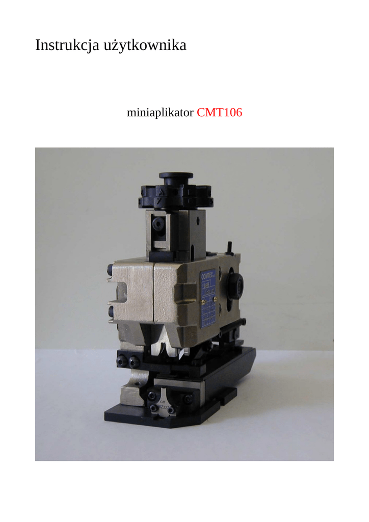 Instrukcja użytkownika miniaplikator CMT106 1. Spis treści: - nastawianie - warunki gwarancji - lista elementów - lista elementów-schemat - specyfikacja techniczna 2. Ostrzeżenie Przed zamontowaniem miniaplikatora konieczne jest sprawdzenie, czy zagniatarka została zaprojektowana zgodnie z obowiązującymi normami dotyczącymi bezpieczeństwa. Należy codziennie sprawdzić wszystkie urządzenia zabezpieczające i osłony zagniatarki w celu usunięcia jakichkolwiek pozostałości procesu produkcyjnego. Miniaplikator powinien być czyszczony codziennie, a jego elementy ruchome smarowane olejem lub smarem o niskiej gęstości. Nie należy smarować ostrzy aplikatora ani stempli – może spowodować to przyklejanie się odpadków produkcyjnych. Okresowe wymieniać części zużywalne (stemple, ostrza etc) 3. Gwarancja Miniaplikator CMT106 podlega gwarancji na 12 (dwanaście) miesięcy od daty dostarczenia, pod warunkiem, że jest on użytkowany prawidłowo, przez oryginalnego nabywcę w oryginalnym miejscu instalacji. W okresie ważności gwarancji wymiana części, które nie mogą być użytkowane ze względu na defekty materiałowe zostają wymienione na zasadzie rękojmi. Gwarancja traci swoją ważność, jeżeli produkt został zmodyfikowany, naprawiony lub zdemontowany, nawet częściowo, bez uprzedniego uzyskania pisemnej zgody od COMTEC S. R. L. Podczas okresu gwarancji wszystkie części uznane za wadliwe zostaną wymienione bez dodatkowych opłat. Gwarancja nie obejmuje instalacji urządzenia. Gwarancja nie obejmuje części, które zużywają się w wyniku prawidłowego użytkowania (ostrza, stemple etc). Gwarancja nie ma zastosowania, a dostawca nie ponosi odpowiedzialności za żadne defekty, błędy, zaniechania i usterki jeśli miniaplikator był użytkowany nieprawidłowo lub został zmodyfikowany, zdemontowany lub uszkodzony przez osoby trzecie lub był użytkowany w nieprawidłowych warunkach lub pracował poza zakresem określonych przez producenta możliwości. 4. Instrukcje ogólne Ta instrukcja użytkownika musi być uznawana za integralną część miniaplikatora. Przed rozpoczęciem użytkowania miniaplikatora oraz zawsze przed dokonaniem jakichkolwiek prac konserwacyjnych należy zapoznać się z instrukcją. W przypadku jakichkolwiek wątpliwości lub problemów nie opisanych w instrukcji przed podjęciem samodzielnych kroków prosimy o skontaktowanie się z serwisem technicznym. Uwaga: Producent zastrzega sobie prawo do dokonania dowolnych zmian nastaw koniecznych do polepszenia produktu, bez konieczności wprowadzania zmian produkcyjnych lub aktualizowania starszych instrukcji. Z powodu regularnych ulepszeń implementowanych w naszych produktach możliwe są pewne rozbieżności pomiędzy treścią instrukcji a miniaplikatorem znajdującym się w posiadaniu użytkownika. Nie uprawnia to do żadnej rekompensaty. Lista elementów N. 1 2 3 4 5 6 7 8 9 10 11 12 13 14 15 16 17 18 19 20 21 22 23 24 25 26 27 28 29 30 31 32 33 34 35 36 37 38 39 40 41 42 43 44 45 46 47 48 49 50 51 52 53 54 55 56 57 58 59 60 61 62 63 64 NAZWA FRAME PIN D.5X12 FEED ROLLER FEED EQUALIZER FEED ADJUSTMENT SCREW BRACKET SCREW M4X20 (PCS.2) FEED LEVER FEED SPRING FEED ADJUSTMENT BLOCK FEED LEVER PIN FOR LEVER FEED FINGER SPRING SCREW M4X30 NUT M4 THREADED BUSH BELLEVILLE WASHER SCREW M6X20 NUT M12 SCREW M5X12 (PCS.2) FEED COVER SIDE COVER SPRING SCREW (PCS.2) SNAP RING D.4 (PCS.2) SPRING FINGER FEEDING FINGER FEED LEVER PIN TERMINAL GUIDE DX TERMINAL BRIDGE KEY SCREW M5X10 (PCS.4) SCREW M6X16 (PCS.2) BASE PLATE BASE PLATE TERMIANAL GUIDE TERMINAL GUIDE SX SCREW M4X15 (PCS.2) PIN D.2X20 (PCS.2) TERMINAL CLUTCH STRIPPER SCREW M5X10 (PCS.2) SNAP RING D.8 CLUTCH SUPPORT CLUTCH BRACKET SCREW M5X12 (PCS.2) CLUTCH LEVER SCREW M5X12 (PCS.2) SCREW M3X6 (PCS.2) COUNTER COVER COUNTER SCREW M5X45 (PCS.6) SCREW M4X6 (PCS.2) CLUTCH SPRINGS (PCS.2) SCREW TC M4X8 (PCS.2) RAM WIRE ADJUSTMENT DISC INSULATION ADJUSTMENT DISC SPACER FOR ADJUS. DISC FEED CAMME SCREW M4X8 (PCS.2) BRASS RING SCREW TB M4X10 (PCS.2) CUT OFF BLADE REAR SPACER SCREW M6X6 NUMER IDENTYFIKACYJNY. 7194 6098 543 6078 6079 6091 6092 6070 6068 6260 6101 6103 523 6183 6184 6108 6110 6234 6111 6112 7195 7196 6067 6105 6122 6106 6104 CM971 6240 6097 6127 6123 6061 CM972 6092 6102 6077 6099 6097 6120 6059 6063 6112 6058 6112 6117 6116 6115 6118 6085 6065 6125 7193 MICROMETRICA 6086 6258 6089 0002 6164 CM5059 CM5043/7.3 6093 *** 65 66 67 68 69 70 71 72 73 74 75 76 77 78 79 80 81 82 83 84 85 REAR DIE CUT OFF FRONT IDE CUT OFF SPACER SCREW M5X20 (PCS.2) WIRE ANVIL INSULATION ANVIL SCREW M3X10 (PCS.2) SCREW M8X20 SUPPORT INSULATION CRIMP RING INSULTION CRIMP DIE CRIMPER SPACER WIRE CRIMP DIE ADJUSTMENT INS.SCREW INSULATION SMALL BLOCK MAGNET RAM SCREW M4X6 (PCS.2) SPRING (PCS.2) BALL (PCS.2) SCREW M6X35 CM2062 CM2067 CM5040/7.2 6171 CM5382 CM5588 6160 6190 CM5050 CM5044/3.2 CM2787 CM5051/1.2 CM5378 6119 CM7638 8216 6087-2 6085 6084 6083 7197 *** - Części zużywalne, wskazane jest posiadanie większej ich liczby. *** *** *** *** *** *** Specyfikacja techniczna Producent – G.M.G. S.p.A Numer – 32001.51.02.1 Zakres przewodów – 14 AWG 16 AWG Maksymalna średnica przewodu – 2.8mm Minimalna długość przewodu – 5mm Warunki zaciskania Miniaplikator typ CMT106 numer seryjny 7170 Zakres przewodów (AWG) 14 20 wysokość przewodów(mm) 2.15 1.85 szerokość przewodów 3.24 3.18 wysokość izolacji 3.15 3.05 szerokość izolacji 4.25 4.20 żądana siła (N) 29 8 zmierzona siła 45 15 Bell mouth Odgięcie w płaszczyźnie pionowej Odgięcie na boki Obrót Deformacja Wyciągnięcie Ściśnięcie przewodu Kontrola wizualna 0.15mm <2º <2º <2º dopuszczalna dopuszczalne Załączony przekrój zaliczona
