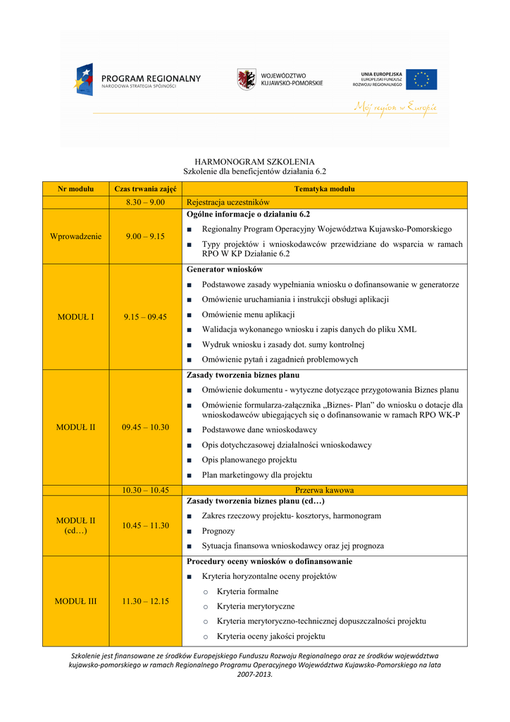 HARMONOGRAM SZKOLENIA Szkolenie dla beneficjentów działania 6.2 Nr modułu Czas trwania zajęć 8.30 – 9.00 Wprowadzenie 9.00 – 9.15 Tematyka modułu Rejestracja uczestników Ogólne informacje o działaniu 6.2 ■ Regionalny Program Operacyjny Województwa Kujawsko-Pomorskiego ■ Typy projektów i wnioskodawców przewidziane do wsparcia w ramach RPO W KP Działanie 6.2 Generator wniosków MODUŁ I 9.15 – 09.45 ■ Podstawowe zasady wypełniania wniosku o dofinansowanie w generatorze ■ Omówienie uruchamiania i instrukcji obsługi aplikacji ■ Omówienie menu aplikacji ■ Walidacja wykonanego wniosku i zapis danych do pliku XML ■ Wydruk wniosku i zasady dot. sumy kontrolnej ■ Omówienie pytań i zagadnień problemowych Zasady tworzenia biznes planu MODUŁ II 09.45 – 10.30 10.30 – 10.45 MODUŁ II (cd…) 10.45 – 11.30 ■ Omówienie dokumentu - wytyczne dotyczące przygotowania Biznes planu ■ Omówienie formularza-załącznika „Biznes- Plan” do wniosku o dotacje dla wnioskodawców ubiegających się o dofinansowanie w ramach RPO WK-P ■ Podstawowe dane wnioskodawcy ■ Opis dotychczasowej działalności wnioskodawcy ■ Opis planowanego projektu ■ Plan marketingowy dla projektu Przerwa kawowa Zasady tworzenia biznes planu (cd…) ■ Zakres rzeczowy projektu- kosztorys, harmonogram ■ Prognozy ■ Sytuacja finansowa wnioskodawcy oraz jej prognoza Procedury oceny wniosków o dofinansowanie ■ MODUŁ III 11.30 – 12.15 Kryteria horyzontalne oceny projektów o Kryteria formalne o Kryteria merytoryczne o Kryteria merytoryczno-technicznej dopuszczalności projektu o Kryteria oceny jakości projektu Szkolenie jest finansowane ze środków Europejskiego Funduszu Rozwoju Regionalnego oraz ze środków województwa kujawsko-pomorskiego w ramach Regionalnego Programu Operacyjnego Województwa Kujawsko-Pomorskiego na lata 2007-2013. o Kryteria oceny wpływu przewidywanych rezultatów projektu na osiąganie załoŜonych w RPO WK-P celów ■ Karta oceny formalnej ■ Omówienie oceny projektów w działaniu 6.2 - Rozwój usług turystycznych i uzdrowiskowych o Kryteria formalne o Kryteria merytoryczno-technicznej dopuszczalności projektu o Kryteria oceny jakości projektu o Kryteria oceny wpływu przewidywanych rezultatów projektu na osiąganie załoŜonych w RPO celów Przerwa na Lunch 12.15 – 12.45 Kwalifikowalność wydatków MODUŁ IV ■ Zagadnienia ogólne dotyczące kwalifikowalności wydatków ■ Kwalifikowalność wydatków a kwalifikowalność projektu ■ Warunki uznania za kwalifikowalne poszczególnych rodzajów wydatków 12.45 – 14.15 o Warunki uznania za kwalifikowalne poszczególnych rodzajów wydatków o Wydatki związane bezpośrednio z realizacją projektu o Wydatki związane z zarządzaniem projektem i jego obsługą o Rodzaje wydatków kwalifikowanych w poszczególnych działaniach Regionalnego Programu Operacyjnego 14.15 – 14.30 Przerwa kawowa Ocena oddziaływania na środowisko MODUŁ V ■ Ogólne wytyczne dotyczące sporządzania OOŚ, ■ Omówienie kluczowych elementów postępowania OOŚ i przygotowanie dokumentacji środowiskowej wymaganej wraz z wnioskiem o dofinansowanie projektu, ■ Omówienie błędów w postępowaniu w sprawie oceny oddziaływania na środowisko mogących skutkować zagroŜeniem dla przygotowania i realizacji projektów współfinansowanych w ramach RPO WK-P 14.30 – 15.15 Pomoc publiczna MODUŁ VI 15.15 – 16.00 ■ Ogólne zagadnienia dotyczące pomocy publicznej ■ Akty prawne dotyczące zasad udzielania pomocy publicznej ■ Pomoc publiczna w RPO WK-P Szkolenie jest finansowane ze środków Europejskiego Funduszu Rozwoju Regionalnego oraz ze środków województwa kujawsko-pomorskiego w ramach Regionalnego Programu Operacyjnego Województwa Kujawsko-Pomorskiego na lata 2007-2013.
