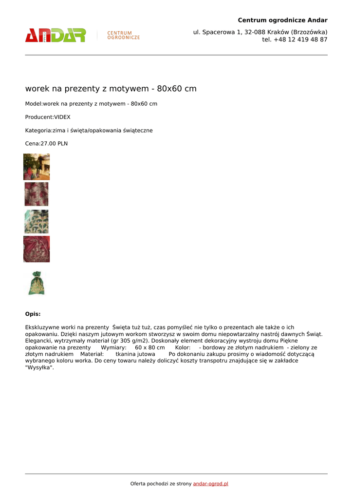Centrum ogrodnicze Andar ul. Spacerowa 1, 32-088 Kraków (Brzozówka) tel. +48 12 419 48 87 worek na prezenty z motywem - 80x60 cm Model:worek na prezenty z motywem - 80x60 cm Producent:VIDEX Kategoria:zima i święta/opakowania świąteczne Cena:27.00 PLN Opis: Ekskluzywne worki na prezenty Święta tuż tuż, czas pomyśleć nie tylko o prezentach ale także o ich opakowaniu. Dzięki naszym jutowym workom stworzysz w swoim domu niepowtarzalny nastrój dawnych Świąt. Elegancki, wytrzymały materiał (gr 305 g/m2). Doskonały element dekoracyjny wystroju domu Piękne opakowanie na prezenty Wymiary: 60 x 80 cm Kolor: - bordowy ze złotym nadrukiem - zielony ze złotym nadrukiem Materiał: tkanina jutowa Po dokonaniu zakupu prosimy o wiadomość dotyczącą wybranego koloru worka. Do ceny towaru należy doliczyć koszty transpotru znajdujące się w zakładce "Wysyłka". Oferta pochodzi ze strony andar-ogrod.pl