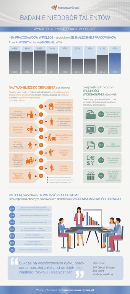 BADANIE NIEDOBÓR TALENTÓW WYNIKI DLA RYNKU PRACY W POLSCE 45% PRACODAWCÓW W POLSCE ma problemy ZE ZNALEZIENIEM PRACOWNIKÓW To wynik WYŻSZY od średniej GLOBALNEJ (40%) 49% 48% 51% 44% 37% 32% 33% 41% 45% 2008 2009 2010 2011 2012 2013 2014 2015 2016 NAJTRUDNIEJSZE DO OBSADZENIA stanowiska Czwarty rok z rzędu w Polsce najtrudniej jest o wykwalifikowanych pracowników fizycznych; na drugim miejscu znajdują się kierowcy, a za nimi inżynierowie i operatorzy produkcji/maszyn. Wykwalifikowani pracownicy fizyczni 1 36% 1 2 Inżynierowie 3 Operatorzy produkcji/ maszyn Brak dostępnych kandydatów i brak kompetencji technicznych to główne przyczyny, ale nie jedyne. (np. elektrycy, mechanicy, spawacze, drukarze, hydraulicy, murarze) Kierowcy (pojazdów ciężarowych, dostawczych, budowlanych, kurierzy) 5 najczęstszych przyczyn TRUDNOŚCI W OBSADZANIU stanowisk (np. elektromechaniki, automatyki, konstruktorzy, itd.) 19% 1 4 6 1 8 13% Zbyt wysokie oczekiwania finansowe 5% Zbyt wysokie oczekiwania względem benefitów pozapłacowych 1 10 Brak doświadczenia Lekarze i personel medyczny 9 Kierownicy działów handlowych 16% Pracownicy restauracji i hoteli 7 (np. programiści, administratorzy baz danych, menadżerowie zespołów) (umiejętności technicznych) 1 Technicy Pracownicy działów IT Brak kompetencji twardych Niewykwalifikowani pracownicy fizyczni 5 (np. produkcji, maszyn, ale też z innych obszarów) Brak dostępnych kandydatów/ brak kandydatów wzrost wobec poprzedniego roku bez zmian wobec poprzedniego roku spadek wobec poprzedniego roku CO ROBIĄ pracodawcy BY WALCZYĆ Z PROBLEMEM? 33% zapewnia obecnym pracownikom dodatkowe SZKOLENIA I MOŻLIWOŚCI ROZWOJU 1 zapewnia obecnym pracownikom dodatkowe szkolenia i możliwości rozwoju 23% 1 podnosi wynagrodzenia początkowe 20% 1 korzysta z możliwości outsourcingu 14% 1 stosuje niewykorzystane lub nietypowe metody rekrutacji 11% 1 obniża wymagania i rozszerza grupę docelową 10% 1 powiększa pakiet świadczeń dodatkowych 4% zmienia dotychczasowe modele pracy 1 33% Sukces na współczesnym rynku pracy coraz bardziej zależy od umiejętności ciągłęgo rozwoju i elastyczności Mara Swan EVP Global Strategy and Talent at ManpowerGroup Więcej informacji na www.manpowergroup.pl