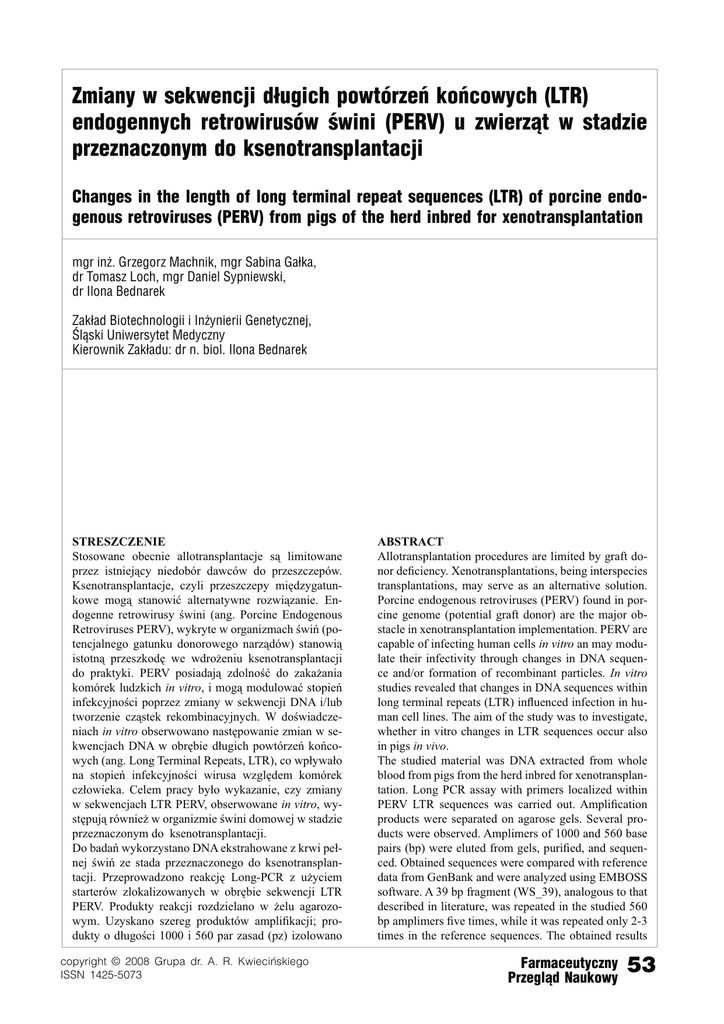:MIANYWSEKWENCJIDUGICHPOWTÌRZEÊKOÊCOWYCH,42 ENDOGENNYCH RETROWIRUSÌW uWINI 0%26 U ZWIERZT W STADZIE PRZEZNACZONYMDOKSENOTRANSPLANTACJI #HANGESINTHELENGTHOFLONGTERMINALREPEATSEQUENCES,42 OFPORCINEENDO GENOUSRETROVIRUSES0%26 FROMPIGSOFTHEHERDINBREDFORXENOTRANSPLANTATION MGRIN'RZEGORZ-ACHNIKMGR3ABINA'AKA DR4OMASZ,OCHMGR$ANIEL3YPNIEWSKI DR)LONA"EDNAREK :AKAD"IOTECHNOLOGIII)NYNIERII'ENETYCZNEJ gLSKI5NIWERSYTET-EDYCZNY +IEROWNIK:AKADUDRNBIOL)LONA"EDNAREK STRESZCZENIE Stosowane obecnie allotransplantacje są limitowane przez istniejący niedobór dawców do przeszczepów. Ksenotransplantacje, czyli przeszczepy międzygatunkowe mogą stanowić alternatywne rozwiązanie. Endogenne retrowirusy świni (ang. Porcine Endogenous Retroviruses PERV), wykryte w organizmach świń (potencjalnego gatunku donorowego narządów) stanowią istotną przeszkodę we wdrożeniu ksenotransplantacji do praktyki. PERV posiadają zdolność do zakażania komórek ludzkich in vitro, i mogą modulować stopień infekcyjności poprzez zmiany w sekwencji DNA i/lub tworzenie cząstek rekombinacyjnych. W doświadczeniach in vitro obserwowano następowanie zmian w sekwencjach DNA w obrębie długich powtórzeń końcowych (ang. Long Terminal Repeats, LTR), co wpływało na stopień infekcyjności wirusa względem komórek człowieka. Celem pracy było wykazanie, czy zmiany w sekwencjach LTR PERV, obserwowane in vitro, występują również w organizmie świni domowej w stadzie przeznaczonym do ksenotransplantacji. Do badań wykorzystano DNA ekstrahowane z krwi pełnej świń ze stada przeznaczonego do ksenotransplantacji. Przeprowadzono reakcję Long-PCR z użyciem starterów zlokalizowanych w obrębie sekwencji LTR PERV. Produkty reakcji rozdzielano w żelu agarozowym. Uzyskano szereg produktów amplifikacji; produkty o długości 1000 i 560 par zasad (pz) izolowano COPYRIGHT'RUPADR!2+WIECIÊSKIEGO )33. ABSTRACT Allotransplantation procedures are limited by graft donor deficiency. Xenotransplantations, being interspecies transplantations, may serve as an alternative solution. Porcine endogenous retroviruses (PERV) found in porcine genome (potential graft donor) are the major obstacle in xenotransplantation implementation. PERV are capable of infecting human cells in vitro an may modulate their infectivity through changes in DNA sequence and/or formation of recombinant particles. In vitro studies revealed that changes in DNA sequences within long terminal repeats (LTR) influenced infection in human cell lines. The aim of the study was to investigate, whether in vitro changes in LTR sequences occur also in pigs in vivo. The studied material was DNA extracted from whole blood from pigs from the herd inbred for xenotransplantation. Long PCR assay with primers localized within PERV LTR sequences was carried out. Amplification products were separated on agarose gels. Several products were observed. Amplimers of 1000 and 560 base pairs (bp) were eluted from gels, purified, and sequenced. Obtained sequences were compared with reference data from GenBank and were analyzed using EMBOSS software. A 39 bp fragment (WS_39), analogous to that described in literature, was repeated in the studied 560 bp amplimers five times, while it was repeated only 2-3 times in the reference sequences. The obtained results &ARMACEUTYCZNY 0RZEGLD.AUKOWY ¤°°U z żelu, oczyszczano i poddano sekwencjonowaniu. Wyniki porównano z sekwencjami referencyjnymi, zgromadzonymi w bazie danych GenBank i analizowano z użyciem oprogramowania EMBOSS. W sekwencji LTR PERV o długości 560 pz zaobserwowano pięciokrotne powielenie odcinka 39 nukleotydów (WS_39), analogicznego z opisanym w literaturze, natomiast w sekwencjach referencyjnych fragment ten występował dwu- lub trzykrotnie. Uzyskane wyniki sugerują, że PERV mogły ulegać w przeszłości zmianom i infekować komórki zarodkowe świni w postaci rekombinowanej lub, że są one obecnie zdolne do rekombinacji na drodze retrotranspozycji in vivo w organizmie świń. suggest, that PERVs may have fluctuated in the past and the recombined particles had infected porcine stem cells. Alternatively, PERVs may be capable of recombinating by retrotransposition in pigs in vivo at present. Key-words: Transplantation, Heterologous; Endogenous retroviruses; Recombination, Genetic Słowa kluczowe: transplantacje heterologiczne; endogenne retrowirusy; rekombinacja genetyczna ' "Õ Od ostatniej dekady XX-go wieku obserwuje się ponowne zainteresowanie grup badawczych zagadnieniem ksenotransplantacji. Ponowne podjęcie tematyki przeszczepów odzwierzęcych było możliwe dzięki wynalezieniu skutecznych leków immunosupresyjnych oraz rozwojowi technik inżynierii genetycznej. W chwili obecnej uznaje się, że ze względu na wiele aspektów, optymalnym gatunkiem donorowym narządów do przeszczepów jest świnia domowa (Sus scrofa). Niestety, w organizmach świń zaobserwowano obecność cząstek wirusowych, zdolnych do infekowania komórek człowieka w warunkach in vitro [1]. Cząstki teendogenne retrowirusy świni (ang. porcine endogenous retroviruses, PERV), są obecne w genomie każdego osobnika i pozostając w stanie zintegrowanym z genomowym DNA, nazywane są prowirusami. Endogenne retrowirusy świni występują w wielu kopiach w genomie komórek zwierząt i nie jest możliwe ich całkowite usunięcie poprzez prostą selekcję stad [2]. Jak dotąd, nie stwierdzono zakażenia organizmu człowieka po kontakcie z tkankami pochodzącymi od świni (np. podczas przeszczepu wysp trzustkowych świni, perfundacji wątroby krwią świni) [3], co jednak nie wyklucza ryzyka podczas zabiegów ksenotransplantacji. Endogenne retrowirusy świni dziedziczą się zgodnie z prawami Mendla, kumulując w toku ewolucji liczne mutacje, co z czasem czyni je niezdolnymi do replikacji [4]. Ze względu na różnice w budowie wyróżnia się trzy subtypy PERV: PERV-A, PERV-B, PERV-C [5, 6], przy czym różnice występują zwłaszcza w obrę