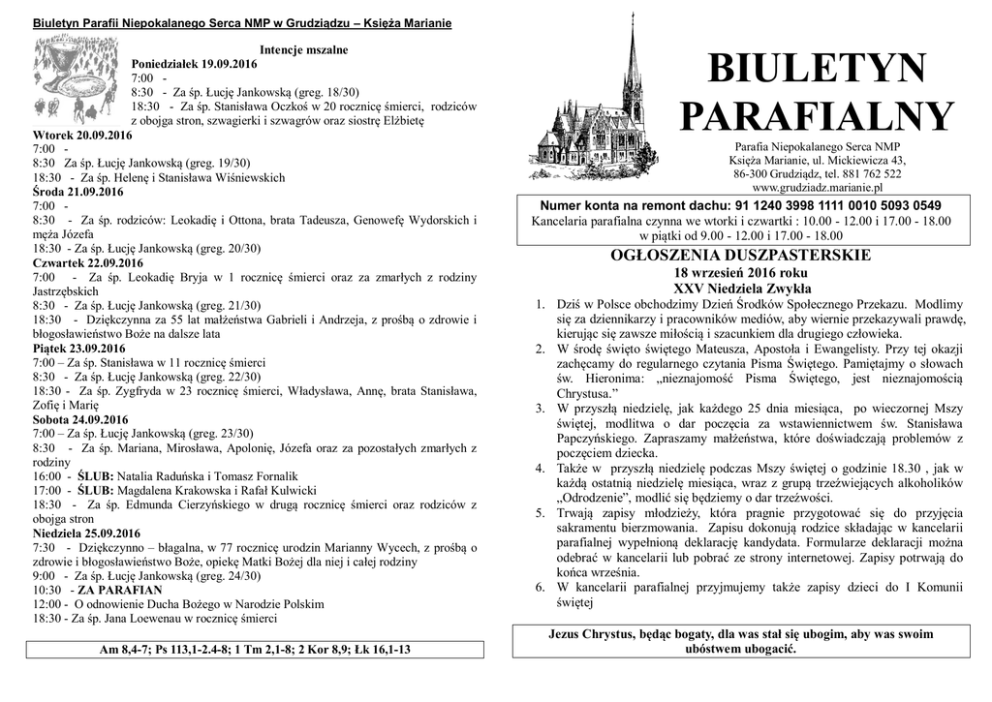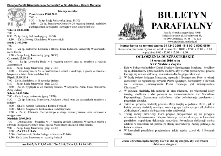 Biuletyn Parafii Niepokalanego Serca NMP w Grudziądzu – Księża Marianie Intencje mszalne Poniedziałek 19.09.2016 7:00 8:30 - Za śp. Łucję Jankowską (greg. 18/30) 18:30 - Za śp. Stanisława Oczkoś w 20 rocznicę śmierci, rodziców z obojga stron, szwagierki i szwagrów oraz siostrę Elżbietę Wtorek 20.09.2016 7:00 8:30 Za śp. Łucję Jankowską (greg. 19/30) 18:30 - Za śp. Helenę i Stanisława Wiśniewskich Środa 21.09.2016 7:00 8:30 - Za śp. rodziców: Leokadię i Ottona, brata Tadeusza, Genowefę Wydorskich i męża Józefa 18:30 - Za śp. Łucję Jankowską (greg. 20/30) Czwartek 22.09.2016 7:00 - Za śp. Leokadię Bryja w 1 rocznicę śmierci oraz za zmarłych z rodziny Jastrzębskich 8:30 - Za śp. Łucję Jankowską (greg. 21/30) 18:30 - Dziękczynna za 55 lat małżeństwa Gabrieli i Andrzeja, z prośbą o zdrowie i błogosławieństwo Boże na dalsze lata Piątek 23.09.2016 7:00 – Za śp. Stanisława w 11 rocznicę śmierci 8:30 - Za śp. Łucję Jankowską (greg. 22/30) 18:30 - Za śp. Zygfryda w 23 rocznicę śmierci, Władysława, Annę, brata Stanisława, Zofię i Marię Sobota 24.09.2016 7:00 – Za śp. Łucję Jankowską (greg. 23/30) 8:30 - Za śp. Mariana, Mirosława, Apolonię, Józefa oraz za pozostałych zmarłych z rodziny 16:00 - ŚLUB: Natalia Raduńska i Tomasz Fornalik 17:00 - ŚLUB: Magdalena Krakowska i Rafał Kulwicki 18:30 - Za śp. Edmunda Cierzyńskiego w drugą rocznicę śmierci oraz rodziców z obojga stron Niedziela 25.09.2016 7:30 - Dziękczynno – błagalna, w 77 rocznicę urodzin Marianny Wycech, z prośbą o zdrowie i błogosławieństwo Boże, opiekę Matki Bożej dla niej i całej rodziny 9:00 - Za śp. Łucję Jankowską (greg. 24/30) 10:30 - ZA PARAFIAN 12:00 - O odnowienie Ducha Bożego w Narodzie Polskim 18:30 - Za śp. Jana Loewenau w rocznicę śmierci Am 8,4-7; Ps 113,1-2.4-8; 1 Tm 2,1-8; 2 Kor 8,9; Łk 16,1-13 BIULETYN PARAFIALNY Parafia Niepokalanego Serca NMP Księża Marianie, ul. Mickiewicza 43, 86-300 Grudziądz, tel. 881 762 522 www.grudziadz.marianie.pl Numer konta na remont dachu: 91 1240 3998 1111 0010 5093 0549 Kancelaria parafialna czynna we wtorki i czwartki : 10.00 - 12.00 i 17.00 - 18.00 w piątki od 9.00 - 12.00 i 17.00 - 18.00 OGŁOSZENIA DUSZPASTERSKIE 18 wrzesień 2016 roku XXV Niedziela Zwykła 1. Dziś w Polsce obchodzimy Dzień Środków Społecznego Przekazu. Modlimy się za dziennikarzy i pracowników mediów, aby wiernie przekazywali prawdę, kierując się zawsze miłością i szacunkiem dla drugiego człowieka. 2. W środę święto świętego Mateusza, Apostoła i Ewangelisty. Przy tej okazji zachęcamy do regularnego czytania Pisma Świętego. Pamiętajmy o słowach św. Hieronima: „nieznajomość Pisma Świętego, jest nieznajomością Chrystusa.” 3. W przyszłą niedzielę, jak każdego 25 dnia miesiąca, po wieczornej Mszy świętej, modlitwa o dar poczęcia za wstawiennictwem św. Stanisława Papczyńskiego. Zapraszamy małżeństwa, które doświadczają problemów z poczęciem dziecka. 4. Także w przyszłą niedzielę podczas Mszy świętej o godzinie 18.30 , jak w każdą ostatnią niedzielę miesiąca, wraz z grupą trzeźwiejących alkoholików „Odrodzenie”, modlić się będziemy o dar trzeźwości. 5. Trwają zapisy młodzieży, która pragnie przygotować się do przyjęcia sakramentu bierzmowania. Zapisu dokonują rodzice składając w kancelarii parafialnej wypełnioną deklarację kandydata. Formularze deklaracji można odebrać w kancelarii lub pobrać ze strony internetowej. Zapisy potrwają do końca września. 6. W kancelarii parafialnej przyjmujemy także zapisy dzieci do I Komunii świętej Jezus Chrystus, będąc bogaty, dla was stał się ubogim, aby was swoim ubóstwem ubogacić. Biuletyn Parafii Niepokalanego Serca NMP w Grudziądzu – Księża Marianie Kampania „Przekażmy sobie znak pokoju” rozmywa jednoznaczne wymagania Ewangelii Prezydium Konferencji Episkopatu Polski ostro skrytykowało kampanię zorganizowaną przez środowiska tak zwanych „katolików otwartych”. Chodzi o skandaliczne postulaty dotyczące zmiany doktryny Kościoła względem homoseksualistów. Wyrażamy przekonanie, że katolicy nie powinni brać udziału w kampanii „Przekażmy sobie znak pokoju”, gdyż rozmywa ona jednoznaczne wymagania Ewangelii – czytamy w komunikacie Prezydium KEP przekazanym Katolickiej Agencji Informacyjnej. Biskupi podkreślają: Kościół nigdy nie dzieli ludzi według orientacji seksualnej, ale uświadamia wszystkim, że jako stworzeni „na obraz i podobieństwo Boga”, są ukochanymi dziećmi Bożymi – siostrami i braćmi w Chrystusie – i stąd cieszą się równą godnością (...) Szacunek dla godności każdej osoby jest jednak nie do pogodzenia z szacunkiem dla samych czynów homoseksualnych. Prezydium KEP wskazuje, że "zło jest złem nie dlatego, że zostało przez kogoś zabronione, ale dlatego, że – jako niezgodne z planem Bożym – szkodzi człowiekowi. Kościół zaś – jak dobra matka – musi jasno nazywać je po imieniu". Poniżej publikujemy cały komunikat Prezydium KEP W ostatnim czasie organizacje związane z tzw. nurtem LGBT – wsparte przez środowiska Tygodnika Powszechnego, Więzi i Znaku – rozpoczęły kampanię medialną pt. „Przekażmy sobie znak pokoju”. Akcja ta skierowana jest do ludzi wierzących i – jak twierdzą organizatorzy – „ma na celu przypomnienie, że z wartości chrześcijańskich wypływa konieczność postawy szacunku, otwarcia i życzliwego dialogu wobec wszystkich ludzi, także homoseksualnych, biseksualnych i transpłciowych” (źródło: www.znakpokoju.com). O ile wszelkie działania służące promowaniu zgody społecznej zasługują na uznanie, o tyle – w kontekście wspomnianej inicjatywy – należy przypomnieć o fundamentalnych sprawach, które Kościół głosi w sposób niezmienny. Sam liturgiczny znak pokoju – do którego odnoszą się organizatorzy kampanii 