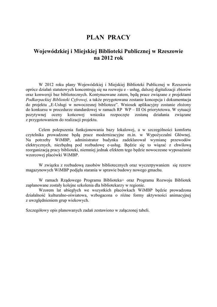 PLAN PRACY Wojewódzkiej i Miejskiej Biblioteki Publicznej w Rzeszowie na 2012 rok W 2012 roku plany Wojewódzkiej i Miejskiej Biblioteki Publicznej w Rzeszowie oprócz działań statutowych koncentrują się na rozwoju e - usług, dalszej digitalizacji zbiorów oraz konwersji baz bibliotecznych. Kontynuowane zatem, będą prace związane z projektami Podkarpackiej Biblioteki Cyfrowej, a także przygotowana zostanie koncepcja i dokumentacja do projektu „E-Usługi w nowoczesnej bibliotece”. Wniosek aplikacyjny zostanie złożony do konkursu w procedurze standardowej w ramach RP WP – III Oś priorytetowa. W sytuacji pozytywnej oceny końcowej wniosku rozpoczęte zostaną działania związane z przygotowaniem do realizacji projektu. Celem polepszenia funkcjonowania bazy lokalowej, a w szczególności komfortu czytelnika prowadzone będą prace modernizacyjne m.in. w Wypożyczalni Głównej. Na potrzeby WiMBP, administrator budynku zadeklarował wymianę przewodów elektrycznych, niezbędną pod rozbudowę e-usług. Będzie się to wiązać z chwilową reorganizacją pracy biblioteki, niemniej jednak efektem tego będzie nowoczesne wyposażanie wzorcowej placówki WiMBP. W związku z rozbudową zasobów bibliotecznych oraz wyczerpywaniem się rezerw magazynowych WiMBP podjęła starania w sprawie budowy nowego gmachu. W ramach Rządowego Programu Biblioteka+ oraz Programu Rozwoju Bibliotek zaplanowane zostały kolejne szkolenia dla bibliotekarzy w regionie. Wzorem lat ubiegłych we wszystkich placówkach WiMBP będzie prowadzona działalność kulturalno-oświatowa, wzbogacona o różne formy aktywności animacyjnej z uwzględnieniem grup wiekowych. Szczegółowy opis planowanych zadań zestawiono w załączonej tabeli. 2 Lp. I. Zadanie Termin Odpowiedzialny cały rok Komisja Doboru Dział Grom. GROMADZENIE I UZUPEŁNIANIE ZBIORÓW Analiza rynku wydawniczego, systematyczne przeglądanie napływających ofert wydawniczych i źródeł o nowościach, takich jak: Nowe Książki, Przewodnik Bibliograficzny, katalogi aukcyjne i antykwaryczne. Przeglądanie ofert wydawniczych prezentowanych na stronach internetowych oraz systematyczne przeglądanie nowości wydawniczych w księgarniach. cały rok Dział Gromadzenia Zbiorów Ścisłe współdziałanie z Komisją Doboru Księgozbioru, organizowanie jej pracy, przygotowywanie nowości sygnalnych, omawianie na posiedzeniach Komisji problemów związanych z gromadzeniem księgozbioru. cały rok Dział Gromadzenia Zbiorów Zamawianie nowości wg ofert wydawniczych, księgarskich i na aukcjach. cały rok Komisja Doboru i Selekcji Zbiorów Stałe uzupełnianie zbiorów bibliotecznych Centrali o wydawnictwa regionalne. cały rok Dział Gromadzenia Zbiorów Poszukiwanie nowych wydawców dżs i nawiązywanie z nimi kontaktów, zbieranie dokumentów w wytypowanych instytucjach w mieście. Przeglądanie katalogów aukcyjnych i odpowiednich stron w Internecie w celu prowadzenia poszukiwań starych dokumentów i pocztówek. Wyszukiwanie informacji o nowościach wydawniczych o tematyce regionalnej i pod kątem przydatności do księgozbioru podręcznego Informatorium. Praca Komisji Doboru Księgozbioru: - wybór książek do księgozbioru podręcznego Informatorium, - wybór książek o tematyce regionalnej i częściowo regionalnej, - wybór książek dla oddziałów i filii. Składanie dezyderatów do Działu Gromadzenia. Współpraca z Działem Gromadzenia w zakresie planowania zakupu książek. co drugi wtorek Dział Informacyjno – miesiąca Bibliograficzny praca ciągła praca ciągła Dział Informacyjno – Bibliograficzny wg Członkowie Komisji harmonogramu z poszczególnych działów cały rok Kierownicy Oddziałów i Filii Instruktor miejski Stałe uzupełnianie księgozbioru podręcznego Informatorium, przysposobienie nowości do udostępniania. cały rok Dział Informacyjno – Bibliograficzny Gromadzenie egzemplarzy obowiązkowych w miarę ich napływu: inwentaryzowanie i przekazanie poszczególnym agendom zgodnie z profilem gromadzenia. cały rok Dział Gromadzenia Zbiorów Gromadzenie zbiorów specjalnych, głównie filmów i książek mówionych (ok. 1200 jednostek). Gromadzenie dokumentów życia społecznego ( ok. 4 000 sztuk ). cały rok Dział Gromadzenia Zbiorów Dział Informacyjno – Bibliograficzny cały rok 3 Zakup księgozbioru dla Centrali i filii WiMBP - ok. 10 440 wol. na wartość 280 000 zł w tym: Centrala - 1 000 wol. na wartość 40.000,- zł (śr. c. 40,- zł) Zb. Spec. - 840 wol. na wartość 39.200,- zł (śr. c. 46,- zł) Wyp. Głów. - 1 000 wol. na wartość 28.000,-zł (śr. c. 28,- zł) Oddz.+Muz.- 400 wol. na wartość 10.800,-zł (śr. c. 27,- zł) Filie - 7 200 wol. na wartość 162.000,- zł (śr. c. 22,50 zł) Ogółem - 10 440 wol. na wartość 280.000,- zł. cały rok Dział Gromadzenia Zbiorów Otrzymanie dotacji ze środków finansowych BN ok. 120.000,- zł na zakup nowości wydawniczych pozwoliłoby na powiększenie księgozbioru następująco: Centrala - 1 500 wol. na wartość 60.000,- zł (śr. c. 40,- zł) Zb. Spec. - 1 080 wol. na wartość 50.000,- zł (śr. c. 46,- zł) Wyp. Głów. - 1 500 wol. na wartość 42.000,-zł (śr. c. 28,- zł) Oddz.+Muz.600 wol. na wartość 16.200,-zł (śr. c. 27,- zł) Filie - 10 300 wol. na wartość 231.800,- zł (śr. c. 22,50 zł) Ogółem - 14 980 wol. na wartość 400.000,- zł. cały rok Dział Gromadzenia Zbiorów Zakup zbiorów specjalnych w ilości 2 400 egz. w tym dla: cały rok Wypożyczalnia Muzyczna Oddziału dla Dzieci i Młodzieży 100 egz. - filmy - 50 - książki mówione - 50 cały rok Oddział dla Dzieci i Młodzieży Wypożyczalni Głównej 450 egz. - normy - 10 - kartografia - 20 - filmy - 200 - audiobooki - 160 - dokum. elektr. 20 cały rok Wypożyczalnia Główna filii miejskich - filmy - audiobooki cały rok Dział Udostępniania Zbiorów Zakup czasopism do zbiorów Czytelni Głównej - 45 wol. cały rok Czytelnia Główna Prenumerata czasop