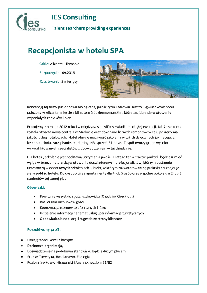 IES Consulting Talent searchers providing experiences Recepcjonista w hotelu SPA Gdzie: Alicante, Hiszpania Rozpoczęcie: 09.2016 Czas trwania: 5 miesięcy Koncepcją tej firmy jest odnowa biologiczna, jakość życia i zdrowia. Jest to 5-gwiazdkowy hotel położony w Alicante, mieście z klimatem śródziemnomorskim, które znajduje się w otoczeniu wspaniałych zabytków i plaż. Pracujemy z nimi od 2012 roku i w międzyczasie byliśmy świadkami ciągłej ewolucji. Jakiś czas temu została otwarta nowa centrala w Madrycie oraz dokonano licznych remontów w celu poszerzenia jakości usług hotelowych. Hotel oferuje możliwość szkolenia w takich dziedzinach jak: recepcja, kelner, kuchnia, zarządzanie, marketing, HR, sprzedaż i innye. Zespół tworzy grupa wysoko wykwalifikowanych specjalistów z doświadczeniem w tej dziedzinie. Dla hotelu, szkolenie jest podstawą utrzymania jakości. Dlatego też w trakcie praktyki będziesz mieć wgląd w branżę hotelarską w otoczeniu doświadczonych profesjonalistów, którzy nieustannie uczestniczą w dodatkowych szkoleniach. Obiekt, w którym zakwaterowani są praktykanci znajduje się w pobliżu hotelu. Do dyspozycji są apartamenty dla 4 lub 5 osób oraz wspólne pokoje dla 2 lub 3 studentów tej samej płci. Obowiązki: Powitanie wszystkich gości uzdrowiska (Check in/ Check out) Rozliczanie rachunków gości Koordynacja rozmów telefonicznych i faxu Udzielanie informacji na temat usług Spai informacje turystycznych Odpowiadanie na skargi i sugestie ze strony klientów Poszukiwany profil: Umiejętności komunikacyjne Doskonała organizacja, Doświadczenie na podobnym stanowisku będzie dużym plusem Studia: Turystyka, Hotelarstwo, Filologia Poziom językowy: Hiszpański i Angielski poziom B1/B2 Oferujemy: Wynagrodzenie 300€/miesięcznie + zakwaterowanie + wyżywienie Aplikuj teraz! Prześlij nam swoje CV w wersji hiszpańskiej na [email protected] lub zarejestruj się na naszej stronie internetowej: http://www.ies-consulting.pl/formularz_dla_studenta.php