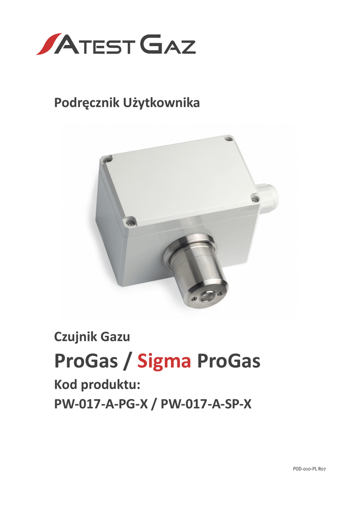 Podręcznik Użytkownika Czujnik Gazu ProGas / Sigma ProGas Kod produktu: PW-017-A-PG-X / PW-017-A-SP-X POD-010-PL R07 Konstruujemy, Produkujemy, Wdrażamy i Obsługujemy: Systemy Monitorowania, Wykrywania i Redukowania Zagrożeń Gazowych Zapraszamy do zapoznania się z naszą ofertą na naszej stronie www.atestgaz.pl Atest-Gaz A. M. Pachole sp. j. ul. Spokojna 3, 44-109 Gliwice tel.: +48 32 238 87 94 fax: +48 32 234 92 71 e-mail: [email protected] www.atestgaz.pl www.atestgaz.pl Uwagi i zastrzeżenia Podłączanie i eksploatacja urządzenia/systemu dopuszczalne jest jedynie po przeczytaniu i zrozumieniu treści niniejszego dokumentu. Należy zachować Podręcznik Użytkownika wraz z urządzeniem do wykorzystania w przyszłości. Producent nie ponosi odpowiedzialności za błędy, uszkodzenia i awarie spowodowane nieprawidłowym doborem urządzeń, przewodów, wadliwym montażem i niezrozumieniem treści niniejszego dokumentu. Niedopuszczalne jest wykonywanie samodzielnie jakichkolwiek napraw i przeróbek w urządzeniu. Producent nie ponosi odpowiedzialności za skutki spowodowane takimi ingerencjami. Zbyt duże narażenia mechaniczne, elektryczne bądź środowiskowe mogą spowodować uszkodzenie urządzenia. Niedopuszczalne jest używanie urządzeń uszkodzonych bądź niekompletnych. Projekt systemu detekcji gazu chronionego obiektu może narzucać inne wymagania dotyczące wszystkich faz życia produktu. Niedopuszczalne jest stosowanie części innych, niż te wymienione w tabeli 8. Jak używać tego podręcznika? W całym dokumencie przyjęto następującą symbolikę oznaczania kontrolek: Symbol Znaczenie Kontrolka świeci Kontrolka mruga Kontrolka wygaszona Stan kontrolki nie jest określony (zależny od innych czynników) Tabela 1: Znaczenie symboli użytych w dokumencie Wyróżnienia tekstu użyte w dokumencie: Na informacje zawarte w takim akapicie należy zwrócić szczególną uwagę. Podręcznik Użytkownika składa się z tekstu głównego i załączników. Załączniki są niezależnymi dokumentami które mogą występować bez Podręcznika Użytkownika. Załączniki posiadają własną numerację stron nie związaną z numeracją stron podręcznika. Dokumenty te mogą także posiadać własny spis treści. Każdy dokument podręcznika jest oznaczony w prawym dolnym rogu nazwą (symbolem) i rewizją (numerem wydania). s. 3|31 Podręcznik Użytkownika: POD-010-PL R07 www.atestgaz.pl Spis Treści 1 Informacje wstępne.................................................................................................................................6 1.1 Bezpieczeństwo......................................................................................................................................6 1.2 Przeznaczenie.........................................................................................................................................9 1.3 Charakterystyka urządzenia....................................................................................................................9 2 Opis działania........................................................................................................................................11 2.1 Czuwanie i pomiar stężenia gazu..........................................................................................................11 2.2 Przeciążenie gazowe.............................................................................................................................11 2.3 Przeciążenia termiczne.........................................................................................................................11 2.4 Blokada.................................................................................................................................................11 2.5 Stany awaryjne.....................................................................................................................................12 2.6 Stany serwisowe...................................................................................................................................12 3 Opis budowy..........................................................................................................................................13 4 Elektryczne interfejsy wejścia – wyjścia.................................................................................................15 4.1 Wyjście RS-485 – dotyczy ProGas i Sigma Progas.................................................................................15 4.2 Wyjście 4 – 20 mA (420) – dotyczy ProGas...........................................................................................16 4.3 Wyjście RS-485 + 420 – dotyczy ProGas...............................................................................................17 4.4 Wyjście 420 + wyjście stykowe – dotyczy ProGas.................................................................................18 5 Interfejs użytkownika............................................................................................................................18 6 Urządzenia współpracujące...................................................................................................................19 6.1 Czujnik Gazu Sigma ProGas..................................................................................................................19 6.2 Czujnik Gazu ProGas.............................................................................................................................19 6.3 Współpraca z urządzeniami innych producentów................................................................................19 7 Cykl życia...............................................................................................................................................19 7.1 Transport.................................................................................................