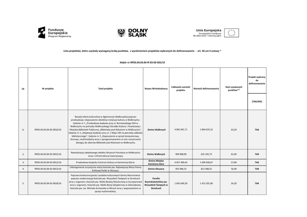 Lista projektów, które uzyskały wymaganą liczbę punktów, z wyróżnieniem projektów wybranych do dofinansowania - art. 46 ust 4 ustawy * Nabór nr RPDS.04.03.04-IP.03-02-035/15 Projekt wybrany do dofinansowania Lp. Nr projektu Tytuł projektu Nazwa Wnioskodawcy Całkowita wartość projektu Wartość dofinansowania Ilość uzyskanych punktów** (TAK/NIE) 1. RPDS.04.03.04-02-0016/16 Rozwój oferty kulturalnej w Aglomeracji Wałbrzyskiej poprzez przebudowę i doposażenie obiektów instytucji kultury w Wałbrzychu: Zadanie nr 1 „Przebudowa budynku przy ul. Broniewskiego 65A w Wałbrzychu na potrzeby Wałbrzyskiego Ośrodka Kultury i Powiatowej i Miejskiej Biblioteki Publicznej „Biblioteka pod Atlantami w Wałbrzychu”, Zadanie nr 2 „Adaptacja budynku przy ul. 1 Maja 149 na potrzeby oddziału bibliotecznego”, Zadanie nr 3 „Doposażenie w sprzęt komputerowy, biurowy, multimedialny wraz z oprogramowaniem w celu rozszerzenia dostępu do zbiorów Biblioteki pod Atlantami w Wałbrzychu 2. RPDS.04.03.04-02-0015/16 Rewitalizacja zabytkowego obiektu Muzeum Porcelany w Wałbrzychu wraz z infrastrukturą towarzyszącą Gmina Wałbrzych 909 000,00 625 195,73 61,60 TAK 3. RPDS.04.03.04-02-0012/16 Przebudowa budynku Centrum Kultury w Kamiennej Górze. Gmina Miejska Kamienna Góra 4 057 490,44 1 699 928,67 57,80 TAK RPDS.04.03.04-02-0013/16 Udostępnienie turystyczne wieży kościoła pw. Najświętszej Maryi Panny Królowej Polski w Głuszycy. Gmina Głuszyca 955 986,53 812 588,55 56,90 TAK 1 665 049,30 1 415 291,90 54,20 TAK 4. 5. RPDS.04.03.04-02-0018/16 Gmina Wałbrzych 4 081 841,71 1 864 635,32 63,20 TAK Poprawa konkurencyjności zasobów kulturowych Gminy Marcinowice poprzez modernizację Kościoła pw. Wszystkich Świętych w Strzelcach Parafia wraz z organami, Kościoła pw. Matki Boskiej Różańcowej w Szczepanowie Rzymskokatolicka pw. wraz z organami, Kościoła pw. Matki Bożej Szkaplerznej w Zebrzydowie, Wszystkich Świętych w Kościoła pw. św. Michała Archanioła w Wirach wraz z wyposażeniem w Strzelcach sprzęt multimedialny. 6. RPDS.04.03.04-02-0004/16 Średniowieczny Zamek Grodno jako Centrum działalności kulturalnej i turystycznej - Przebudowa elementów Zamku Grodno w Zagórzu Śląskim: budynek bramny, budynek łącznika oraz remont baszty obronnej. Gmina Walim 2 163 862,53 1 360 333,35 53,90 TAK 7. RPDS.04.03.04-02-0011/16 Zwiększenie atrakcyjności pawilonu "Na wodzie" w Betlejem poprzez remont stawu (ujęcia wody) wraz z otoczeniem w Krzeszowie. Gmina Kamienna Góra 617 854,85 409 433,84 53,40 TAK 8. RPDS.04.03.04-02-0010/16 833 032,99 699 734,03 51,20 TAK 9. RPDS.04.03.04-02-0020/16 2 561 857,78 2 049 486,23 49,20 TAK 10. RPDS.04.03.04-02-0009/16 1 059 376,32 877 994,45 48,90 TAK 2 342 952,73 434 329,93 44,50 TAK 1 891 725,15 1 512 396,12 43,60 NIE 1 846 785,40 1 402 283,67 42,90 NIE Przebudowa oraz doposażenie obiektów instytucji kultury w gminie Żarów – przebudowa świetlic wiejskich w miejscowości Mielęcin, Mrowiny i Przyłęgów. Zachowanie unikatowego dziedzictwa kulturowego UNESCO poprzez utworzenie szlaku epitafiów w Kościele Pokoju w Świdnicy i rewitalizację przykościelnego cmentarza. Zwiększenie atrakcyjności oferty kulturalnej Mieroszowskiego Centrum Kultury poprzez przebudowę biblioteki oraz pomieszczeń przeznaczonych na studio nagrań oraz salę prób. 11. RPDS.04.03.04-02-0008/16 Zagospodarowanie terenu parku Państwowej Wyższej Szkoły Zawodowej im. Angelusa Silesiusa przy ul. Zamkowej 4 w Wałbrzychu. 12. RPDS.04.03.04-02-0003/16 KL Gross-Rosen - Zachować Pamięć. 13. RPDS.04.03.04-02-0014/16 Rewaloryzacja zabytkowej stajni z XVIII w. w zespole pałacowym w Krzyżowej na potrzeby ponadnarodowej edukacji kulturalnej -etap II. Gminne Centrum Kultury i Sportu w Żarowie Parafia EwangelickoAugsburska pw. Św. Trójcy w Świdnicy Gmina Mieroszów Państwowa Wyższa Szkoła Zawodowa im. Angelusa Silesiusa w Wałbrzychu Muzeum Gross Rosen w Rogoźnicy Fundacja Krzyżowa dla Porozumienia Europejskiego * - Ustawa z dnia 11 lipca 2014 r. o zasadach realizacji programów w zakresie polityki spójności finansowanych w perspektywie finansowej 2014–2020 (Dz. U. z 2016 r., poz. 217 z póź. zmianami). ** - Maksymalna łączna liczba punktów możliwych do uzyskania ze wszystkich etapów oceny wynosi 80 pktów.