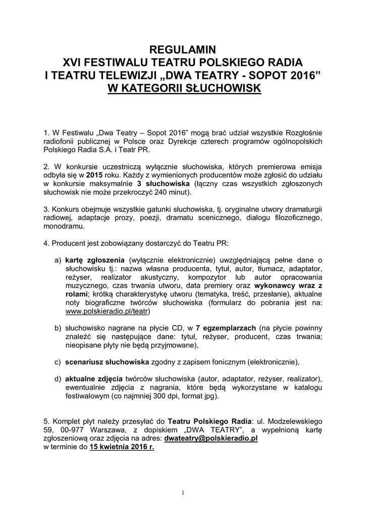 REGULAMIN XVI FESTIWALU TEATRU POLSKIEGO RADIA I