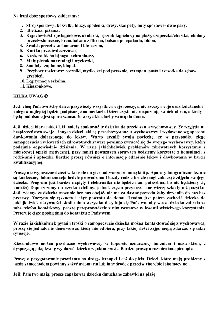 Na letni obóz sportowy zabieramy: 1. Strój sportowy: koszulki, bluzy, spodenki, dresy, skarpety, buty sportowe- dwie pary, 2. Bielizna, piżama, 3. Kąpielówki/stroje kąpielowe, okularki, ręcznik kąpielowy na plażę, czapeczka/chustka, okulary przeciwsłoneczne, krem/balsam z filtrem, balsam po opalaniu, bidon, 4. Środek przeciwko komarom i kleszczom, 5. Kurtka przeciwdeszczowa, 6. Kask, rolki, hulajnoga, ochraniacze, 7. Mały plecak na treningi i wycieczki, 8. Sandały- zapinane, klapki, 9. Przybory toaletowe: ręczniki, mydło, żel pod prysznic, szampon, pasta i szczotka do zębów, grzebień, 10. Legitymacja szkolna, 11. Kieszonkowe. KILKA UWAG Jeśli chcą Państwo żeby dzieci przywiozły wszystkie swoje rzeczy, a nie rzeczy swoje oraz koleżanek i kolegów najlepiej będzie podpisać je na metkach. Dzieci często nie rozpoznają swoich ubrań, a kiedy będą podpisane jest spora szansa, że wszystkie ciuchy wrócą do domu. Jeśli dzieci biorą jakieś leki, należy spakować je dziecku do przekazania wychowawcy. Ze względu na bezpieczeństwo swoje i innych dzieci leki są przechowywane u wychowawcy i wydawane wg sposobu dawkowania dołączonego do leków. Warto uczulić swoją pociechę, że w przypadku złego samopoczucia i w kwestiach zdrowotnych zawsze powinno zwracać się do swojego wychowawcy, który podejmie odpowiednie działania. W razie jakichkolwiek problemów zdrowotnych korzystamy z miejscowej opieki medycznej, przy mniej poważnych sprawach będziemy korzystać z konsultacji z rodzicami i apteczki. Bardzo proszę również o informację odnośnie leków i dawkowania w karcie kwalifikacyjnej. Proszę nie wyposażać dzieci w konsole do gier, odtwarzacze muzyki itp. Aparaty fotograficzne tez nie są konieczne, dokumentacja będzie prowadzona i każdy rodzic będzie mógł zobaczyć zdjęcia swojego dziecka. Program jest bardzo napięty i elektronika nie będzie nam potrzebna, bo nie będziemy się nudzić:) Dopuszczamy do użytku telefony, jednak często przynoszą one więcej szkody niż pożytku. Jeśli wiemy, ze dziecko może się bez nas obejść, nie ma co dawać powodu żeby dzwoniło do nas bez przerwy. Zaczyna się tęsknota i chęć powrotu do domu. Trudno jest potem zachęcić dziecko do jakiejkolwiek aktywności. Jeśli mimo wszystko decydują się Państwo, aby wasze dziecko zabrało ze sobą telefon komórkowy, proszę przeprowadźcie z nim rozmowę w kwestii właściwego korzystania. Preferuję ciszę poobiednią do kontaktu z Państwem. W razie jakichkolwiek pytań i troski o samopoczucie dziecka można kontaktować się z wychowawcą, proszę się jednak nie denerwować kiedy nie odbiera, przy takiej ilości zajęć mogą zdarzać się takie sytuacje. Kieszonkowe można przekazać wychowawcy w kopercie oznaczonej imieniem i nazwiskiem, z dyspozycją jaką kwotę wypłacać dziecku w jakim czasie. Bardzo proszę o rozmienione pieniądze. Proszę o przygotowanie prowiantu na drogę- kanapki i coś do picia. Dzieci, które mają problemy z jazdą samochodem powinny zażyć aviomarin lub inny środek przeciw chorobie lokomocyjnej. Jeśli Państwo mają, proszę zapakować dziecku dmuchane zabawki na plażę.