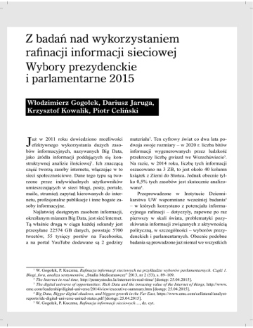 J u w 2011 roku dowiedziono mo liwo ci efektywnego wykorzystania du ych zasob w informacyjnych, nazywanych Big Data, jako r d a informacji poddaj cych si konstruktywnej analizie ilo ciowej1. Ich znacz c cz tworz zasoby internetu, w czaj c w to sieci spo eczno ciowe. Dane tego typu s tworzone przez indywidualnych u ytkownik w umieszczaj cych w sieci blogi, posty, portale, maile, strumie zapyta kierowanych do internetu, profesjonalne publikacje i inne bogate zasoby informacyjne. Naj atwiej dost pnym zasobem informacji, okre lanym mianem Big Data, jest sie /internet. T w a nie drog w ci gu ka dej sekundy jest przesy ane 22574 GB danych, powstaje 5700 tweet w, 55 tysi cy post w na Facebooku, a na portal YouTube dodawane s 2 godziny materia u2. Ten cyfrowy wiat co dwa lata podwaja swoje rozmiary w 2020 r. liczba bit w informacji wygenerowanych przez ludzko przekroczy liczb gwiazd we Wszech wiecie3. Na razie, w 2014 roku, liczb tych informacji oszacowano na 3 ZB, to jest oko o 40 kolumn ksi ek z Ziemi do S o ca. Jednak obecnie tylko 0,5% tych zasob w jest skutecznie analizowana4. Przeprowadzone w Instytucie Dziennikarstwa UW wspomniane wcze niej badania5 w kt rych korzystano z potencja u informacyjnego ra nacji dotyczy y, zapewne po raz pierwszy w skali wiata, problematyki pozyskiwania informacji zwi zanych z aktywno ci polityczn , w szczeg lno ci wybor w prezydenckich i parlamentarnych. Obecnie podobne badania s prowadzone ju niemal we wszystkich W. Gogo ek, P. Kuczma, Ra nacja informacji sieciowych na przyk adzie wybor w parlamentarnych. Cz 1. Blogi, fora, analiza sentyment w, Studia Medioznawcze 2013, nr 2 (53), s. 89 109. 2 The Internet in real time, http://pennystocks.la/internet-in-real-time/ [dost p: 25.04.2015]. 3 The digital universe of opportunities: Rich Data and the inreasing value of the Internet of things, http://www. emc.com/leadership/digital-universe/2014iview/executive-summary.htm [dost p: 25.04.2015]. 4 Big Data, Bigger digital shadows, and biggest growth in the Far East, https://www.emc.com/collateral/analystreports/idc-digital-universe-united-states.pdf [dost p: 25.04.2015]. 5 W. Gogo ek, P. Kuczma, Ra nacja informacji sieciowych , dz. cyt. 1 32 W odzimierz Gogo ek, Dariusz Jaruga, Krzysztof Kowalik, Piotr Celi ski bran ach, kt re wykorzystuj aktualne informacje w swojej dzia alno ci. Przyk adem jest komercyjne narz dzie Brand24 oferuj ce szeroki wachlarz monitoringu opartego na zasadach ra nacji. Obejmuje on: monitoring marki tzn. ledzenie na bie co, co o marce/produkcie/ us udze m wi internauci w sieci; monitoring prewencyjny (co internauci m wi , ludzkie oblicze marki); monitoring kryzysowy i monitoring sprzeda owy6. Podobne us ugi wiadczy SentiOne, rma, kt ra udost pni a Instytutowi Dziennikarstwa UW swoje narz dzia dla test w w zakresie mo liwo ci zbierania sentyment w dotycz cych notowa sp ek gie dowych. Uzyskane wyniki potwierdzi y mo liwo statystycznie istotnej predykcji notowa . Wyniki test w wskaza y nadzwyczaj du korelacj (r>0,8) przewidywa z rzeczywistymi notowaniami czterech sp ek gie dowych (Enea SA, KGHM SA, Synthos SA i Tauron SA)7. Fundamentem mo liwo ci realizacji tego typu bada by y, i s obecnie w jeszcze wi kszym zakresie, techniczne mo liwo gromadzenia wspomnianych gigantycznych zasob w i narz dzi ich analizy. Maria technologii z potencja em informacji nie zosta jeszcze zauwaony jako skuteczne narz dzie pozyskiwania wt rnych informacji s one jak rad ra nowany z rudy (zaledwie 4 g z jednej tony rudy)8. Te proporcje wydaj si by adekwatn ilustracj proces w ra nacji informacji Big Data. Jej wynik stwarza now kategori informacji, kt ra wcze niej nigdy nie by a i ze wzgl d w ogranicze technologicznych nie mog a by dost pna. Uznano zatem za celowe potwierdzenie zasadno ci tego kierunku zastosowa technologii w analizie gigantycznych zasob w informacji. Ra nacja umo liwia dostrzeganie informacji wt rnych w ukrytych zasobach informacji pierwotnych (Big Data). Dane uzyskane dzi ki tym analizom tworz obraz historii, stanu, potrzeb i zachowa m.in. indywidualnych u ytkownik w i rm, ale tak e spo eczno ci jako ca o ci. Jednocze nie dostarczaj warto ciowych, wiarygodnych statystycznie informacji do analiz predykcyjnych. Badania Cel. Zasygnalizowany potencja oraz realne zapotrzebowanie na aktualne, oryginalne informacje stanowi y o celu przedsi wzi cia, tzn. wskazanie g wnych etap w ra nacji/ogniw a cucha procedur/czynno ci sk adaj cych si na proces ra nacji. Jej umiej tne zastosowanie generuje wcze niej nieznane, u yteczne informacje b d ce przeciwno ci smogu informacyjnego przypisywanego sieci9. Hipoteza. Wyniki ra nacji stanowi wiarygodne informacje opisuj ce wybrany proces spoeczny/zjawisko w czasie przesz ym, rzeczywistym, a tak e prognoz . S one, po odpowiedniej obr bce, wiarygodnym r d em opinii na temat procesu spo ecznego/zjawiska, np. w poszukiwaniu zagro e funkcjonowania rmy, oczekiwa klient w czy predykcji wybor w spo ecznych lub notowa sp ek na gie dzie. Za o enie. Przyj to za o enie, e badania zwi zane z ra nacj b d dotyczy , podobnie jak w badaniach przeprowadzonych Socjomania, http://socjomania.pl/10-krokow-skutecznego-monitoringu-z-brand24 [dost p: maj 2015]. Niepublikowane prace: A. Woch, Internetowe predykcje notowa sp ek gie dowych, ID UW, Warszawa 2015; M. W jcikiewicz, Analiza przydatno ci narz dzi Big Data w prognozowaniu notowa sp ek gie dowych, ID UW, Warszawa 2015. 8 J.L. Marshall, Wydobycie uranu i ra nowanie radu w St. oachimsthal chymovie) [w:] Nowotwory. Journal of Oncology 2011, Vol. 61, No. 2, p. 181 185. 9 R. Tadeusiewicz, Ciemna strona internetu, wyk ad inauguracyjny, WSZiA w Zamo ciu, 16 pa dziernika 1999. 6 7 33 Z bada nad wykorzystaniem ra nacji informacji sieciowej w 2011 roku10, predykcji (na podstawie danych poprzedzaj cych dzie wybor w) wybor w prezydenckich (2015) oraz parlamentarnych (2015). Metodologia. Jednym z ogniw procesu ranacji jest analiza sentyment w. Jest ona rozumiana jako wyr nianie wpis w (uniwersalne okre lenie p