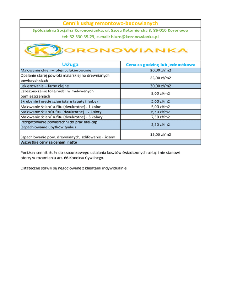 Cennik usług remontowo-budowlanych Spółdzielnia Socjalna Koronowianka, ul. Szosa Kotomierska 3, 86-010 Koronowo tel: 52 330 35 29, e-mail: [email protected] Usługa Cena za godzinę lub jednostkowa Malowanie okien – olejno, lakierowanie Opalanie starej powłoki malarskiej na drewnianych powierzchniach Lakierowanie – farby olejne Zabezpieczanie folią mebli w malowanych pomieszczeniach Skrobanie i mycie ścian (stare tapety i farby) Malowanie ścian/ sufitu (dwukrotne) - 1 kolor Malowanie ścian/sufitu (dwukrotne) - 2 kolory Malowanie ścian/ sufitu (dwukrotne) - 3 kolory Przygotowanie powierzchni do prac mal-tap (szpachlowanie ubytków tynku) Szpachlowanie pow. drewnianych, szlifowanie - ściany Wszystkie ceny są cenami netto 30,00 zł/m2 25,00 zł/m2 30,00 zł/m2 5,00 zł/m2 5,00 zł/m2 5,00 zł/m2 6,50 zł/m2 7,50 zł/m2 2,50 zł/m2 15,00 zł/m2 Poniższy cennik służy do szacunkowego ustalania kosztów świadczonych usług i nie stanowi oferty w rozumieniu art. 66 Kodeksu Cywilnego. Ostateczne stawki są negocjowane z klientami indywidualnie.