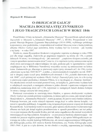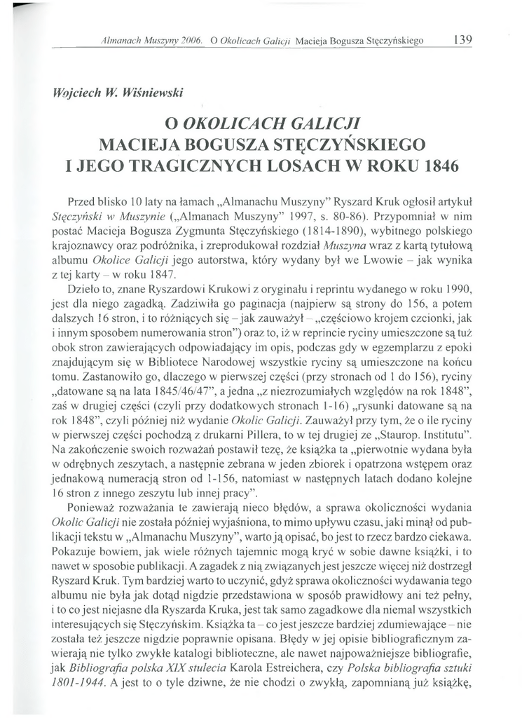 Almanach Muszyny 2006. O Okolicach Galicji M acieja Bogusza Stęczyńskiego 139 W ojciech W. W iśniew ski O OKOLICACH GALICJI MACIEJA BOGUSZA STĘCZYŃSKIEGO I JEGO TRAGICZNYCH LOSACH W ROKU 1846 Przed blisko 10 laty na łamach ״Almanachu Muszyny” Ryszard Kruk ogłosił artykuł Styczyński w Muszynie ( ״Almanach Muszyny” 1997, s. 80-86). Przypomniał w nim postać Macieja Bogusza Zygmunta Stęczyńskiego (1814-1890), wybitnego polskiego krajoznawcy oraz podróżnika, i zreprodukowal rozdział Muszyna wraz z kartą tytułową albumu Okolice Galicji jego autorstwa, który wydany był we Lwowie - jak wynika z tej karty - w roku 1847. Dzieło to, znane Ryszardowi Krukowi z oryginału i reprintu wydanego w roku 1990, jest dla niego zagadką. Zadziwiła go paginacja (najpierw są strony do 156, a potem dalszych 16 stron, i to różniących się - jak zauważył - ״częściowo krojem czcionki, jak i innym sposobem numerowania stron”) oraz to, iż w reprincie ryciny umieszczone są tuż obok stron zawierających odpowiadający im opis, podczas gdy w egzemplarzu z epoki znajdującym się w Bibliotece Narodowej wszystkie ryciny są umieszczone na końcu tomu. Zastanowiło go, dlaczego w pierwszej części (przy stronach od 1 do 156), ryciny ״datowane są na lata 1845/46/47”, a jedna ״z niezrozumiałych względów na rok 1848”, zaś w drugiej części (czyli przy dodatkowych stronach 1-16) ״rysunki datowane są na rok 1848”, czyli później niż wydanie Okolic Galicji. Zauważył przy tym, że o ile ryciny w pierwszej części pochodzą z drukarni Piliera, to w tej drugiej ze ״Staurop. Institutu”. Na zakończenie swoich rozważań postawił tezę, że książka ta ״pierwotnie wydana była w odrębnych zeszytach, a następnie zebrana w jeden zbiorek i opatrzona wstępem oraz jednakow ą numeracją stron od 1-156, natomiast w następnych latach dodano kolejne 16 stron z innego zeszytu lub innej pracy5’. Ponieważ rozważania te zawierają nieco błędów, a sprawa okoliczności wydania Okolic Galicji nie została później wyjaśniona, to mimo upływu czasu, jaki minął od publikacji tekstu w ״Almanachu Muszyny”, warto ją opisać, bo jest to rzecz bardzo ciekawa. Pokazuje bowiem, jak wiele różnych tajemnic mogą kryć w sobie dawne książki, i to nawet w sposobie publikacji. Azagadek z niązw iązanychjestjeszcze więcej niż dostrzegł Ryszard Kruk. Tym bardziej warto to uczynić, gdyż sprawa okoliczności wydawania tego albumu nie była jak dotąd nigdzie przedstawiona w sposób prawidłowy ani też pełny, i to co jest niejasne dla Ryszarda Kruka, jest tak samo zagadkowe dla niemal wszystkich interesujących się Stęczyńskim. Książka t a - c o jest jeszcze bardziej zdum iew ające-nie została też jeszcze nigdzie poprawnie opisana. Błędy w jej opisie bibliograficznym zaw ierająnie tylko zwykłe katalogi biblioteczne, ale nawet najpoważniejsze bibliografie, jak Bibliografia polska X IX stulecia Karola Estreichera, czy Polska bibliografia sztuki 1801-1944. A jest to o tyle dziwne, że nie chodzi o zwykłą, zapomnianą już książkę, 140 Wojciech W. Wiśniewski ale o album bardzo często od lat wykorzystywany jako źródło informacji, a przede wszystkim materiału ikonograficznego dla wielu miejsc i miejscowości z terenów Karpat i Pogórza. Ojej znaczeniu i dzisiejszej popularności najlepiej świadczy to, że w roku 1990 wznowiona została w reprincie, i to w bardzo znacznym, jak na takie reedycje, nakładzie - aż 3100 egzemplarzy (gdy zwykle nakład reprintów wynosi około 1000 sztuk). Rabacja galicyjska 1846 roku a Okolice Galicji Przy tej okazji warto wspomnieć o losach Stęczyńskiego w czasie rabacji galicyjskiej 1846 roku, nie tylko dlatego, że był on ofiarą tych wydarzeń, ale także dlatego, iż niewykluczone, że Okolice Galicji zaczęły się w pewnym sensie ukazywać w związku z nimi. Otóż Stęczyński w czasie tych wydarzeń stracił ukończony rękopis (zrabowany przez chłopów, którzy go napadli) wysoko przez niego cenionego poematu Tatry oraz przygotowane do niego ryciny. Później przez kilka miesięcy siedział w więzieniu, a po powrocie, co nastąpiło jesienią 1846 roku, do Lwowa, gdzie wtedy mieszkał, potrzebował środków do życia. Ponieważ nie miał już wtedy gotowego dzieła, z którym, jak wiemy skądinąd, wiązał wielkie nadzieje na poprawę sytuacji finansowej, wszedł w porozumienie z Kajetanem Jabłońskim, znanym już wówczas księgarzem i nakładcą, czyli wydawcą, który podjął się (a może i zaproponował) wydawanie innego, niewykonanego jeszcze dzieła - Okolic Galicji. A ze względów finansowych (mniejsze środki potrzebne do zainwestowania) i organizacyjnych (łatwiej przygotować dzieło na bieżąco, fragmentami), najlepiej było publikować je, o czym piszę w dalszej części tego artykułu, w formie zeszytów. W Stróżach nad Dunajcem - 1846 rok Późnąjesienią 1845 roku Stęczyński przybył ze Lwowa do wsi Stróże nad Dunajcem, gdzie prawdopodobnie dopracowywał wspomniany poemat Tatry i ilustracje do niego. Ponieważ położenie miejscowości, w której Stęczyński został zaatakowany, było dotąd przedstawiane w różny sposób, i to zazwyczaj błędnie, należy wyjaśnić, że bezsprzecznie chodzi o wieś Stróże nad Dunajcem kolo Zakliczyna. Wskazuje na to jednoznacznie już informacja podana w broszurze poświęconej Stęczyńskiemu, a napisanej przez Władysława Sabowskiego w 1878 roku - o odległości, jaką pokonał Stęczyński po ״aresztowaniu” przez chłopów, jako że wtedy go ״cztery mile ze Stróżów do Tarnowa wieziono” (czyli ok. 30 km), a wspomniane Stróże położone s ą - w linii prostej - ok. 25 km na południowy zachód od Tarnowa. Potwierdzenie tego znajdujemy też w jego własnej relacji z tych wydarzeń, w której podaje dokładniej lokalizację, pisząc, iż było to we wsi o tej nazwie, znajdującej się ״między Czchowem a Melsztynem, nad 