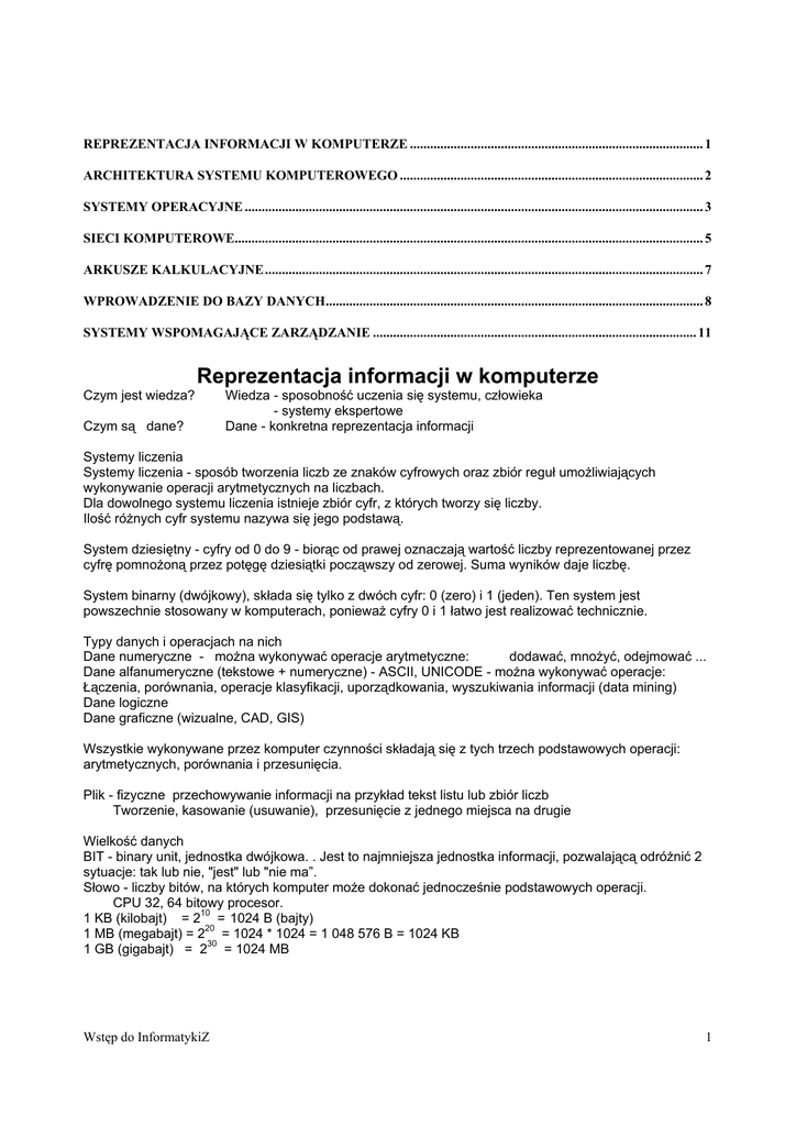 REPREZENTACJA INFORMACJI W KOMPUTERZE ....................................................................................... 1 ARCHITEKTURA SYSTEMU KOMPUTEROWEGO .......................................................................................... 2 SYSTEMY OPERACYJNE ........................................................................................................................................ 3 SIECI KOMPUTEROWE........................................................................................................................................... 5 ARKUSZE KALKULACYJNE.................................................................................................................................. 7 WPROWADZENIE DO BAZY DANYCH................................................................................................................ 8 SYSTEMY WSPOMAGAJĄCE ZARZĄDZANIE ................................................................................................ 11 Reprezentacja informacji w komputerze Czym jest wiedza? Czym są dane? Wiedza - sposobność uczenia się systemu, człowieka - systemy ekspertowe Dane - konkretna reprezentacja informacji Systemy liczenia Systemy liczenia - sposób tworzenia liczb ze znaków cyfrowych oraz zbiór reguł umożliwiających wykonywanie operacji arytmetycznych na liczbach. Dla dowolnego systemu liczenia istnieje zbiór cyfr, z których tworzy się liczby. Ilość różnych cyfr systemu nazywa się jego podstawą. System dziesiętny - cyfry od 0 do 9 - biorąc od prawej oznaczają wartość liczby reprezentowanej przez cyfrę pomnożoną przez potęgę dziesiątki począwszy od zerowej. Suma wyników daje liczbę. System binarny (dwójkowy), składa się tylko z dwóch cyfr: 0 (zero) i 1 (jeden). Ten system jest powszechnie stosowany w komputerach, ponieważ cyfry 0 i 1 łatwo jest realizować technicznie. Typy danych i operacjach na nich Dane numeryczne - można wykonywać operacje arytmetyczne: dodawać, mnożyć, odejmować ... Dane alfanumeryczne (tekstowe + numeryczne) - ASCII, UNICODE - można wykonywać operacje: Łączenia, porównania, operacje klasyfikacji, uporządkowania, wyszukiwania informacji (data mining) Dane logiczne Dane graficzne (wizualne, CAD, GIS) Wszystkie wykonywane przez komputer czynności składają się z tych trzech podstawowych operacji: arytmetycznych, porównania i przesunięcia. Plik - fizyczne przechowywanie informacji na przykład tekst listu lub zbiór liczb Tworzenie, kasowanie (usuwanie), przesunięcie z jednego miejsca na drugie Wielkość danych BIT - binary unit, jednostka dwójkowa. . Jest to najmniejsza jednostka informacji, pozwalającą odróżnić 2 sytuacje: tak lub nie, "jest" lub "nie ma”. Słowo - liczby bitów, na których komputer może dokonać jednocześnie podstawowych operacji. CPU 32, 64 bitowy procesor. 1 KB (kilobajt) = 210 = 1024 B (bajty) 1 MB (megabajt) = 220 = 1024 * 1024 = 1 048 576 B = 1024 KB 1 GB (gigabajt) = 230 = 1024 MB Wstęp do InformatykiZ 1 System kodowania Dla użytkownika końcowego (business users) nie jest istotne jak w komputerze są kodowane dane (jak są reprezentowane). Dla zwykłego użytkownika mikrokomputera istotne są możliwości reprezentacji typów danych, które on potrzebuje i języki, które on używa. Standardy kodowania ASCII (American Standard Code for Information Exchange - Amerykański Kod Standardowy dla Wymiany Informacji). Standard ASCII ma obecnie największe rozpowszechnienie, ponieważ jest stosowany w mikrokomputerach i serwerach. Standard ASCII dotyczy podstawowych znaków alfanumerycznych i ustala tylko pierwsze 128 znaków. Pierwsze 32 znaki standardu ASCII zarezerwowano dla celów specjalnych, reprezentują one kody kontrolne dla drukarek i ekranu. Strony kodowe - wariant rozszerzonego standardu ASCII, w których mniej potrzebne znaki (o numerach powyżej 127) są zastąpione w znakami specjalnymi - narodowymi. Znaki polskie znalazły się na stronie kodowej określanej nazwą “Latin 2”, razem z innymi znakami narodowymi krajów Europy Centralnej. Standard Unicode - System ten używa dwubajtowej reprezentacji znaków (16 bitowy system kodowania). W ten sposób mamy do dyspozycji nie 256 a 2 potęga 16 = 256 potęga 2=65536 znaków, w tym około 3000 znaków definiowalnych przez użytkownika. Teksty pisane w językach europejskich zajmują przy takiej reprezentacji dwa razy więcej pamięci (2 bajty zamiast 1 przy ASCII. Możliwie jest kodowanie tekstów w prawie wszystkich językach świata. Najnowsze systemy operacyjne i bazy danych używają Unicode3 - Windows 2000 / XP, Linux... Architektura systemu komputerowego System - pewien zbiór obiektów oraz relacje między tymi obiektami i między ich własnościach. Składowe Systemu Komputerowego - Sprzęt (ang. hardware) – dostarcza podstawowe zasoby systemu komputerowego: - procesor (jednostka centralna) (ang. central processing unit – CPU), - pamięć operacyjna, - urządzenia wejścia-wyjścia - pamięć masowa (twardy dysk) - System operacyjny – nadzoruje i koordynuje posługiwanie się sprzętem przez różne programy aplikacyjne (użytkowe) (Ms DOS, Ms Windows, Unix, Linux) - Programy aplikacyjne (programy biurowe, systemy baz danych, programy ERP) - Użytkownicy (ludzie, inne komputery). Architektura systemu komputerowego obejmuje te jego elementy, które są istotne dla programisty wpływają bezpośrednio na logiczne wykonywanie programu i tym samym sposób jego konstrukcji. Organizacja systemu komputerowego obejmuje powiązania jednostek funkcjonalnych, które mogą wpływać na sposób wykonania instrukcji, ale nie mają bezpośredniego wpływu na logikę działania programu lub wynik jego działania, np. technologia wykonania, częstotliwość pracy procesora itp. Prawo Moore'a (1965) - Gordon Moore - założyciel i wiceprezydent firmy Intel „wzrost wydajności obwodów scalonych - każda nowa kość zawiera około dwa razy więcej elementów