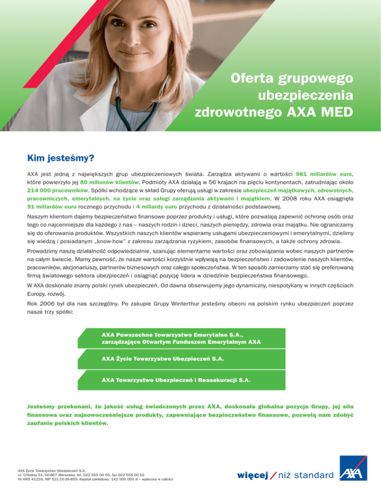 Oferta grupowego ubezpieczenia zdrowotnego AXA MED Kim jesteśmy? AXA jest jedną z największych grup ubezpieczeniowych świata. Zarządza aktywami o wartości 981 miliardów euro, które powierzyło jej 80 milionów klientów. Podmioty AXA działają w 56 krajach na pięciu kontynentach, zatrudniając około 214 000 pracowników. Spółki wchodzące w skład Grupy oferują usługi w zakresie ubezpieczeń majątkowych, zdrowotnych, pracowniczych, emerytalnych, na życie oraz usługi zarządzania aktywami i majątkiem. W 2008 roku AXA osiągnęła 91 miliardów euro rocznego przychodu i 4 miliardy euro przychodu z działalności podstawowej. Naszym klientom dajemy bezpieczeństwo finansowe poprzez produkty i usługi, które pozwalają zapewnić ochronę osób oraz tego co najcenniejsze dla każdego z nas – naszych rodzin i dzieci, naszych pieniędzy, zdrowia oraz majątku. Nie ograniczamy się do oferowania produktów. Wszystkich naszych klientów wspieramy usługami ubezpieczeniowymi i emerytalnymi, dzielimy się wiedzą i posiadanym „know-how” z zakresu zarządzania ryzykiem, zasobów finansowych, a także ochrony zdrowia. Prowadzimy naszą działalność odpowiedzialnie, szanując elementarne wartości oraz zobowiązania wobec naszych partnerów na całym świecie. Mamy pewność, że nasze wartości korzystnie wpływają na bezpieczeństwo i zadowolenie naszych klientów, pracowników, akcjonariuszy, partnerów biznesowych oraz całego społeczeństwa. W ten sposób zamierzamy stać się preferowaną firmą światowego sektora ubezpieczeń i osiągnąć pozycję lidera w dziedzinie bezpieczeństwa finansowego. W AXA doskonale znamy polski rynek ubezpieczeń. Od dawna obserwujemy jego dynamiczny, niespotykany w innych częściach Europy, rozwój. Rok 2006 był dla nas szczególny. Po zakupie Grupy Winterthur jesteśmy obecni na polskim rynku ubezpieczeń poprzez nasze trzy spółki: AXA Powszechne Towarzystwo Emerytalne S.A., zarządzające Otwartym Funduszem Emerytalnym AXA AXA Życie Towarzystwo Ubezpieczeń S.A. AXA Towarzystwo Ubezpieczeń i Reasekuracji S.A. Jesteśmy przekonani, że jakość usług świadczonych przez AXA, doskonała globalna pozycja Grupy, jej siła finansowa oraz najnowocześniejsze produkty, zapewniające bezpieczeństwo finansowe, pozwolą nam zdobyć zaufanie polskich klientów. AXA Życie Towarzystwo Ubezpieczeń S.A. ul. Chłodna 51, 00-867 Warszawa, tel. 022 555 00 50, fax 022 555 00 52 Nr KRS 41216, NIP 521-10-36-859, Kapitał zakładowy: 142 500 000 zł – wpłacony w całości Oferta grupowego ubezpieczenia zdrowotnego AXA MED Zalety ubezpieczenia zdrowotnego AXA MED · nielimitowany dostęp do lekarzy oraz świadczeń zdrowotnych, · konsultacje lekarzy specjalistów bez wymaganego skierowania, · 24-godzinny kontakt z personelem infolinii medycznej, · możliwość umawiania wizyt we wszystkich placówkach za pośrednictwem tego samego numeru telefonu, · dostęp do usług medycznych na terenie całego kraju (ponad 900 dostępnych placówek medycznych), · szybki dostęp do świadczeń zdrowotnych: – konsultacje lekarza rodzinnego oraz internisty w ciągu 24 godzin od momentu zgłoszenia, – konsultacje lekarza specjalisty w ciągu 72 godzin od momentu zgłoszenia, · szeroki zakres usług w zależności od wybranego wariantu, · możliwość doboru wariantu ubezpieczenia w zależności od struktury zatrudnienia w przedsiębiorstwie, · brak limitów na świadczenia zdrowotne, · brak karencji (z wyjątkiem chirurgii jednego dnia), · szeroki zakres usług stomatologicznych, · brak indywidualnej oceny medycznej, · jednakowa składka dla wszystkich pracowników Ubezpieczającego, w ramach tego samego wariantu i formy. Grupowe ubezpieczenie zdrowotne Korzyści dla pracodawcy · podniesienie atrakcyjności miejsca pracy dla osób już zatrudnionych i dla wartościowych kandydatów poprzez zapewnienie pracownikom jednego z najbardziej pożądanych bonusów pozapłacowych – dodatkowego ubezpieczenia zdrowotnego, · mocny argument w walce z konkurencją o najlepszych pracowników – rozszerzenie pakietu socjalnego, · wzmocnienie wizerunku firmy na rynku pracy, · zwiększenie lojalności pracowników – zmniejszenie rotacji w przedsiębiorstwie, · dostosowanie umowy ubezpieczenia do aktualnej struktury zatrudnienia dzięki elastycznej konstrukcji ubezpieczenia, · możliwość rozszerzenia ubezpieczenia o profilaktyczne badania pracowników pozwala na wywiązanie się z ustawowego obowiązku zapewnienia pracownikom opieki z zakresu medycyny pracy, · zmniejszenie absencji chorobowej pracowników, · możliwość wliczenia składki przekazanej na ubezpieczenie pracowników w koszty uzyskania przychodu. Korzyści dla pracownika · dostęp do usług medycznych wysokiej jakości w placówkach zlokalizowanych w całej Polsce, · szeroki zakres ochrony w zależności od wybranego wariantu AXA MED, · dzięki rodzinnej formie ubezpieczenia – możliwość zapewnienia dostępu do usług medycznych dzieciom i współmałżonkowi – w atrakcyjnej cenie, · poprawa stanu zdrowia pracownika poprzez usługi profilaktyczne, takie jak konsultacje, szczepienia, badania itp. 2 Oferta grupowego ubezpieczenia zdrowotnego AXA MED Formy ubezpieczenia · indywidualna – w której ochroną ubezpieczeniową objęty jest wyłącznie Ubezpieczony Główny, · rodzinna – w której ochroną ubezpieczeniową objęty jest Ubezpieczony Główny, jego Współmałżonek lub Partner i Dzieci. Warianty ubezpieczenia AXA proponuje 6 wariantów ubezpieczenia różniących się od siebie zakresem opieki medycznej, dzięki czemu pracodawca może wybrać zakres odpowiadający z jednej strony potrzebom swoich pracowników, a z drugiej – swoim możliwościom. Zakres świadczeń zdrowotnych A+MP B C D E F n n n n n n nielimitowany dostęp do lekarza medycyny rodzinnej, internisty, pediatry n n n n n n nielimitowany dostęp do ginekologa, urologa n n n n n n n n n n n n inf