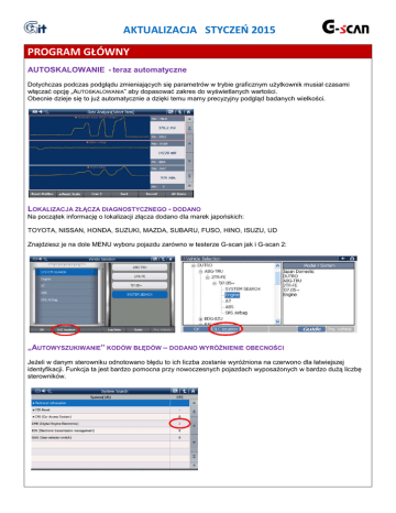 AKTUALIZACJA STYCZEŃ 2015 PROGRAM GŁÓWNY AUTOSKALOWANIE - teraz automatyczne Dotychczas podczas podglądu zmieniających się parametrów w trybie graficznym użytkownik musiał czasami włączać opcję „AUTOSKALOWANIA” aby dopasować zakres do wyświetlanych wartości. Obecnie dzieje się to już automatycznie a dzięki temu mamy precyzyjny podgląd badanych wielkości. LOKALIZACJA ZŁĄCZA DIAGNOSTYCZNEGO - DODANO Na początek informację o lokalizacji złącza dodano dla marek japońskich: TOYOTA, NISSAN, HONDA, SUZUKI, MAZDA, SUBARU, FUSO, HINO, ISUZU, UD Znajdziesz je na dole MENU wyboru pojazdu zarówno w testerze G-scan jak i G-scan 2: „AUTOWYSZUKIWANIE” KODÓW BŁĘDÓW – DODANO WYRÓŻNIENIE OBECNOŚCI Jeżeli w danym sterowniku odnotowano błędu to ich liczba zostanie wyróżniona na czerwono dla łatwiejszej identyfikacji. Funkcja ta jest bardzo pomocna przy nowoczesnych pojazdach wyposażonych w bardzo dużą liczbę sterowników. AKTUALIZACJA STYCZEŃ 2015 SPECIAL FUNCTION VIDEO LINK (QR) Dodano kolejne linki do filmów z procedur testowych i regulacynych umieszczonych na kanale firmy G-scan na You Tube. Oto nowości: - Video items added G-scan2 Log Capture Function VW/AUDI EPB Pad Change All Processing HYUNDAI Injector Specific Data Oscilloscope function Polish language is available for following videos: -HYUNDAI Immobilizer -TOYOTA Linear Valve Learning -Mercedes Benz Assyst Setting -HYUNDAI Transmitter Code Saving -VW/AUDI Throttle Body Alignment -VW/AUDI Service Reminder Reset -HYUNDAI ACU Variant Coding -HYUNDAI Fuel Line Air Remove -HONDA Adding Keyless Access Remote -HYUNDAI EPB Brake Pad Change Mode -HYUNDAI Headlamp and Level Initialization -HYUNDAI Injector Specific Data -INFINITI Idle Air Volume Learning -NISSAN Intelligent Key Programming -INFINITI Steering Angle Sensor Calibration -VW/AUDI Electronic Parking Brake G-scan1 Log Capture Function VW/AUDI EPB Pad Change All Processing HYUNDAI Injector Specific Data AKTUALIZACJA STYCZEŃ 2015 FUSO HINO Engine New Type added - Aero Star 6M60 Engine Basic Function DTC Analysis + Data Analysis Actuation Test ECU Information Advanced Function New System added - Suspension Basic Function DTC Analysis ECU Information - Fighter 6M60 Engine Basic Function DTC Analysis Data Analysis Actuation Test System Identification Advanced Function - Small size Engine Basic Function DTC Analysis + Data Analysis Actuation Test ECU Information Advanced Function - Big/Middle size Engine Basic Function Data Analysis Actuation Test System Identification Advanced Function - AeroStar MD92 '05.06~ Basic Function DTC Analysis + Data Analysis ECU Information Advanced Function - UDS Basic Function DTC Analysis Data Analysis Actuation Test ECU Information Advanced Function - THE GREAT 6D40 94.12~'96.04 Basic Function DTC Analysis + Data Analysis ECU Information - AERO BUS 8DC11 '97.12~'98.09 Basic Function DTC Analysis + Data Analysis ECU Information - Canter 4M50 Engine Basic Function Data Analysis Actuation Test Advanced Function - FF shift Basic Function DTC Analysis ECU Information - Meter Basic Function DTC Analysis ECU Information - Adaptive Cruise Control Basic Function DTC Analysis ECU Information - Lane departure warning Basic Function DTC Analysis ECU Information - Autonomous Emergency Braking Basic Function DTC Analysis ECU Information - VCS Basic Function DTC Analysis ECU Information - Proshift Basic Function DTC Analysis ECU Information New Model Added - BLUERIBBON CITY2 6HK1 '07.08~ Engine Basic Function DTC Analysis Data Analysis Actuation Test ECU Information Advanced Function - BLUERIBBON CITY2, RAINBOW2 6HK1 '04.08~ Engine Basic Function DTC Analysis Data Analysis AKTUALIZACJA STYCZEŃ 2015 Actuation Test ECU Information Advanced Function - BODY - High Beam Support Basic Function DTC analysis + Data analysis - RAINBOW2 4HK1 '11.11~ Engine Basic Function DTC Analysis Data Analysis ECU Information Advanced Function - BODY - Parking Sensor Basic Function DTC analysis + Data analysis - BLUERIBBON CITY2 6HK1 '10.08 Add Engine Basic Function DTC Analysis Data Analysis ECU Information Advanced Function New Type added - EVPS Basic Function DTC analysis + Data Analysis ECU Information Display - BLUERIBBON CITY2 8PE1 '00.06~ Engine Basic Function DTC Analysis Data Analysis ECU Information - BODY - HF LINK TEL Basic Function DTC analysis - VSA Advanced Function Added - TPMS Basic Function DTC analysis + Data Analysis ECU Information Display Function Improved - BLUERIBBON CITY2 12PIN F21C Engine Basic Function DTC Analysis - DUTRO Engine Modified Basic Function DTC items enhanced DTC Analysis enhanced - BCM all sub System Actuation Test improved - EPS Advanced Function - IMA Advanced Function - RANGER/PROFIA Modified Basic Function DTC Analysis enhanced - ABS,VSA Basic Function DTC enhanced HONDA, ACURA - Diesel Advanced Function New System added - Gauge Data Analysis extended Advanced Function - AWD Basic Function DTC analysis Data analysis ECU Information Display Advanced Function Added - Active Damper Basic Function DTC analysis Data analysis - BODY - Active Cornering Light Basic Function DTC analysis Data analysis - Keyless Advanced Function - HVAC Advanced Function Self Test Comm. improved - Lighting Basic Function Data Analysis improved - Doorlocks Data Analysis improved AKTUALIZACJA STYCZEŃ 2015 - BODY Comm. Improved - SRS Airbag Data Analysis improved - SRS Airbag Advanced Function - VSA Advanced Function ISUZU New system added -4JJ1 -TC Basic function DTC Analysis Data Analysis Actuation Test ECU Information Advanced function -Auto transmission Basic function DTC Analysis Data Analysis Actuation Test ECU Information Advanced function -ABS Basic function DTC Analysis Data Analysis Actuation Test ECU Information Advanced function -TCCM Basic function DTC Analysis + Data Analysis Actuation Test ECU Information -BCM Basic function DTC Analysis ECU Information -SDM Basic function DTC Analysis ECU Information -Meter Basic fun