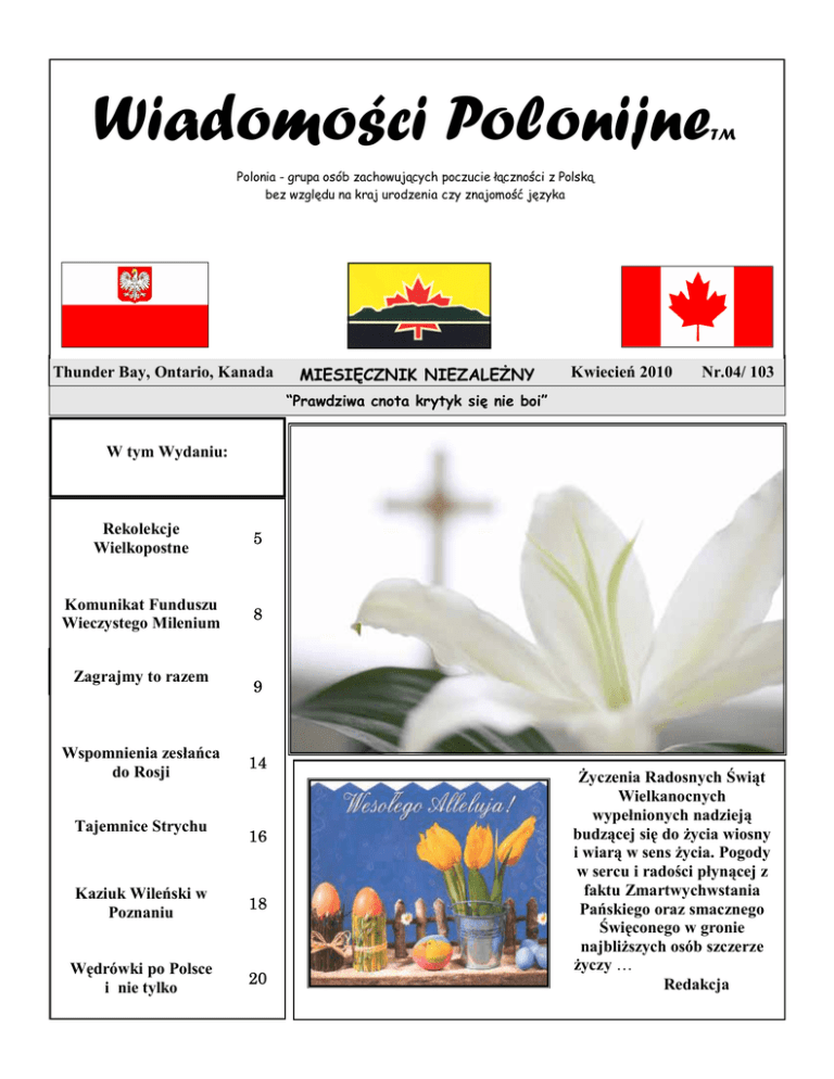 Wiadomosci Polonijne TM Polonia - grupa osób zachowujących poczucie łączności z Polską bez względu na kraj urodzenia czy znajomość języka Thunder Bay, Ontario, Kanada MIESIĘCZNIK NIEZALEŻNY Kwiecień 2010 Nr.04/ 103 “Prawdziwa cnota krytyk się nie boi” W tym Wydaniu: Rekolekcje Wielkopostne 5 Komunikat Funduszu Wieczystego Milenium 8 Zagrajmy to razem Wspomnienia zesłańca do Rosji Tajemnice Strychu 9 14 16 Kaziuk Wileński w Poznaniu 18 Wędrówki po Polsce i nie tylko 20 Życzenia Radosnych Świąt Wielkanocnych wypełnionych nadzieją budzącej się do życia wiosny i wiarą w sens życia. Pogody w sercu i radości płynącej z faktu Zmartwychwstania Pańskiego oraz smacznego Święconego w gronie najbliższych osób szczerze życzy … Redakcja 2 Wiadomości Polonijne Redaguje Zespół: Lucy Michalak Tadeusz Michalak Agnieszka Reszkowska-Kania Robert Kania Korespondenci: Joanna Adamik Agnieszka Buda - Rodriguez Kazimierz Niechwiadowicz Aleksander Siwiak Waldi Opracowanie: Lucy Michalak Wzory reklam zaprojektowanych przez “Wiadomości Polonijne” są własnością wydawnictwa. Kopiowanie i ich publikowanie bez zgody redakcji jest nielegalne. Redakcja “ Wiadomości Polonijnych” zaprasza wszystkich Czytelników do przysyłania własnej twórczości. Mogą to być zarówno wiersze jak i proza. Termin nadsyłania materiałów do gazety upływa 15-go każdego miesiąca. Redakcja zastrzega sobie prawo skracania i edycji nadesłanych tekstów. autorów i nie zawsze odzwierciedlają stanowisko redakcji. Za treść ogłoszeń i r eklam r edakcja n ie p on osi odpowiedzialności. Wiadomości Polonijne są pismem całkowicie bezpłatnym. Wszelkie koszty związane z drukiem są pokrywane z dotacji. Każda pomoc finansowa jest mile widziana. Wszelkiego rodzaju ogłoszenia i życzenia do “Wiadomości Polonijych” przyjmuje Lucy Michalak tel. 767-4200 Wydawca: Wiadomości Polonijne 236 Masters Street. Thunder Bay, On. P7B 6L5 e-mail: [email protected] LISTY DO REDAKCJI Witam, Gazetki znalazłam i poczytałam, bardzo ciekawe i dobrze napisane. Zawsze czytałam jak odwiedzałam wujka a teraz mogę to robić na bieżąco, dziękuję. A wiem, jaki to jest wysiłek, bo działam w harcerstwie i wiem jak trudno jest nam wydać gazetkę raz na 3 miesiące. Jeśli mogę, zachęcić do obejrzenia strony, ZHR w Kanadzie, podaje adres: http://www.zhr-kanada.org/ Dziękuję, Zofia Biesok,Toronto Kalendarz świąteczny na 2010 rok http://artspolonia.enginesource.org http://www.polishwinnipeg.com/ Downloads/IndexThunderBay.htm Wyrażone w tekstach opinie należą do Potrzebujemy pomocy w redagowaniu gazetki, a szczególnie w opracowywaniu przy komputerze. Jeśli masz czas i chęć zgłoś się do redakcji. Księga Imion Przysłowie miesiąca Aleksander to mężczyzna otwarty na wszelkie nowości życiowe uchodzący za człowieka nowoczesnego. Jest pracowity ale ma skłonności do prowadzenia wygodnego życia, zażywania rozkoszy i przyjemności, co może spowodować oddanie się lenistwu. Aleksander jest dobrym mężem, świetnym ojcem i troskliwym gospodarzem. Posiada on duże poczucie humoru, lubi muzykę i książki. Osiąga sukcesy w zawodzie adwokata lub lekarza. Kwiecień 2010 Deszcze częste w kwietniu wróżą, że owoców będzie dużo. Pozostałe święta ruchome Czwartek 01-Kwiecień-2010 : Prima Aprilis Niedziela 04-Kwiecień-2010 : Wielkanoc Poniedziałek 05-Kwiecień-2010 : Poniedziałek Wielkanocny Wielkanoc (Pascha) - najstarsze i najważniejsze święto chrześcijańskie (obok Bożego Narodzenia) upamiętniające śmierć oraz zmartwychwstanie Jezusa Chrystusa. Poprzedzający ją tydzień, stanowiący okres wspominania najważniejszych dla wiary chrześcijańskiej wydarzeń, nazywany jest Wielkim Tygodniem. PARAFIA MATKI BOŻEJ KRÓLOWEJ POLSKI 93 N. Algoma Str PARAFIA ŚW. KAZIMIERZA 613 McKenzie Str Thunder Bay, On Tel 623-3916 Proboszcz ks. Ireneusz Stadler Proboszcz o. Andrzej Deptuła Thunder Bay, On Tel 344-1066 Msze Św. wtorek-piątek 7:00 p.m., soboty 5:00 p.m. niedziele 9:00 (po angielsku) & 10:30 a.m. (po polsku) http://stmary50.blogspot.com Msze Św. poniedziałek-piątek 8:00 a.m. ( eng/pol.) soboty 5:00 p.m (english) niedziela 9:00a.m.(english) & 10:30 a.m.(polish) Kwiecień 2010 Wiadomości Polonijne WIADOMOŚCI Z POLSKI -Tadeusz Michalak Kampania przed-prezydencka Radosław Sikorski rozpoczął szumnie kampanie w Bydgoszczy. Więcej mówił o tym, jaki nie ma być prezydent, niż jaki ma być. Sztandarowe hasło: `Prezydent może być niski, ale nie powinien być mały' (czekamy na kandydata, który wypatrzy, że przeciwnik ma krzywe nogi, i ogłosi `kandydat może być krzywy, ale musi postępować prosto'). Obiecał republikańską skromność i naprawę państwa. Trudno o receptę na konflikt w sprawie Polaków na Białorusi Bo jak słusznie zauważa w Rz. europoseł PO Paweł Zalewski, `to nie niechęć do Polaków decyduje o aresztowaniach, lecz kwestia niezależności, organizacji, którą Aleksander Lukaszenko postrzega jako jeden z najgroźniejszych czynników antyreżimowych'. Sikorski: zbudowaliśmy kraj, którego inni nam zazdroszczą parlamentu ani jakimś superrządem czy rządem na wygnaniu, jak to często bywa w tej chwili - powiedział szef MSZ. Według niego prezydent nie może prowadzić odrębnej polityki społecznej czy finansowej i nie powinien próbować odpowiadać za rzeczy, które do prezydenta nie należą. Prezydent Kaczyński waha się C z y st ar t owa ć w w ybor a ch prezydenckich. Uważa, że nie ma w tej chwili wystarczająco poważnego poparcia politycznego i nie wie jeszcze, kiedy ogłosi swoją decyzję o starcie w wyborach. sprawę dziedziczenia praw do najmu mieszkania należącego do miasta po zmarłym partnerze. Wprawdzie już jakiś czas temu stosowna ustawa była zmieniona, przez uznanie za uprawnioną osobę "małżonka lub partnera pozostającego we wspólnym pożyciu", ale sądy potem wywiodły, że ów partne