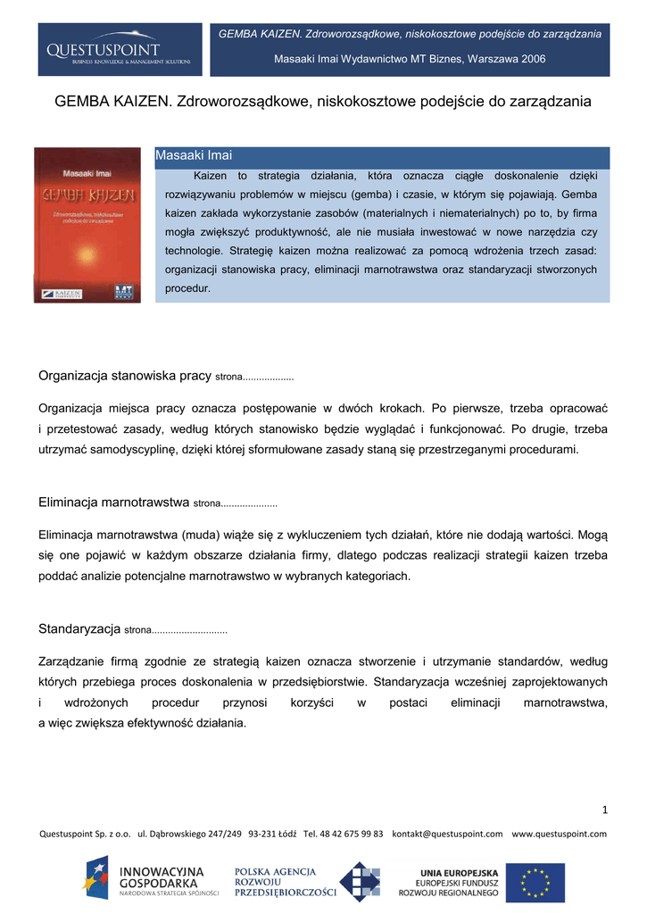 GEMBA KAIZEN. Zdroworozsądkowe, niskokosztowe podejście do zarządzania Masaaki Imai Wydawnictwo MT Biznes, Warszawa 2006 GEMBA KAIZEN. Zdroworozsądkowe, niskokosztowe podejście do zarządzania Masaaki Imai Kaizen to strategia działania, która oznacza ciągłe doskonalenie dzięki rozwiązywaniu problemów w miejscu (gemba) i czasie, w którym się pojawiają. Gemba kaizen zakłada wykorzystanie zasobów (materialnych i niematerialnych) po to, by firma mogła zwiększyć produktywność, ale nie musiała inwestować w nowe narzędzia czy technologie. Strategię kaizen można realizować za pomocą wdrożenia trzech zasad: organizacji stanowiska pracy, eliminacji marnotrawstwa oraz standaryzacji stworzonych procedur. Organizacja stanowiska pracy strona................... Organizacja miejsca pracy oznacza postępowanie w dwóch krokach. Po pierwsze, trzeba opracować i przetestować zasady, według których stanowisko będzie wyglądać i funkcjonować. Po drugie, trzeba utrzymać samodyscyplinę, dzięki której sformułowane zasady staną się przestrzeganymi procedurami. Eliminacja marnotrawstwa strona..................... Eliminacja marnotrawstwa (muda) wiąże się z wykluczeniem tych działań, które nie dodają wartości. Mogą się one pojawić w każdym obszarze działania firmy, dlatego podczas realizacji strategii kaizen trzeba poddać analizie potencjalne marnotrawstwo w wybranych kategoriach. Standaryzacja strona............................ Zarządzanie firmą zgodnie ze strategią kaizen oznacza stworzenie i utrzymanie standardów, według których przebiega proces doskonalenia w przedsiębiorstwie. Standaryzacja wcześniej zaprojektowanych i wdrożonych procedur przynosi korzyści w postaci eliminacji marnotrawstwa, a więc zwiększa efektywność działania. 1 Questuspoint Sp. z o.o. ul. Dąbrowskiego 247/249 93-231 Łódź Tel. 48 42 675 99 83 [email protected] www.questuspoint.com GEMBA KAIZEN. Zdroworozsądkowe, niskokosztowe podejście do zarządzania Masaaki Imai Wydawnictwo MT Biznes, Warszawa 2006 Organizacja stanowiska pracy Organizacja miejsca pracy oznacza postępowanie w dwóch krokach. Po pierwsze, trzeba opracować i przetestować zasady, według których stanowisko będzie wyglądać i funkcjonować. Po drugie, trzeba utrzymać samodyscyplinę, dzięki której sformułowane zasady staną się przestrzeganymi procedurami. Według gemba kaizen, miejsce pracy organizuje się według pięciu etapów, tak zwanych 5S: Selekcja Selekcja oznacza podział rzeczy w miejscu pracy na dwie kategorie: niezbędne i zbędne oraz eliminację tych drugich. Przez niezbędne należy rozumieć te przedmioty, które potrzebne są w codziennej pracy – w tym celu warto wyznaczyć limit rzeczy zaliczanych do tej kategorii. Można przyjąć założenie, iż z miejsca pracy trzeba usunąć te przedmioty, które nie będą potrzebne pracownikowi w ciągu trzydziestu dni. Do tego celu warto wykorzystać tak zwaną kampanię czerwonej kartki. Polega ona na tym, że pracownik lub pracownicy, których miejsce pracy podlega selekcji, przyczepiają czerwone kartki do tych rzeczy, które uznają za zbędne. W przypadku wątpliwości, przedmiot otrzymuje również czerwoną kartkę – jego przydatność w tym miejscu pracownicy poddadzą w następnym kroku analizie. Po przydzieleniu kartek następuje podsumowanie, w ramach którego rozstrzyga się wątpliwości. Wówczas – jeśli któryś z pracowników uzna, że czerwona kartka znalazła się na przedmiocie, który postrzega on jako niezbędny – ma za zadanie wykazać, iż skorzysta z niego w ciągu trzydziestu dni. Podczas przeprowadzania i omawiania selekcji, wśród pracowników powinni się znaleźć członkowie zarządu, wyniki selekcji mogą bowiem dostarczyć im wskazówek na temat tego, w jaki sposób funkcjonuje firma i w których miejscach popełnia ona błędy. Przeprowadzona w ten sposób eliminacja przynosi dwie korzyści – pozwala zaoszczędzić miejsce oraz poprawia organizację czynności na stanowisku pracy. Ponadto zaś daje odpowiedź na pytanie o źródła potencjalnego marnotrawstwa w przedsiębiorstwie. 2 Questuspoint Sp. z o.o. ul. Dąbrowskiego 247/249 93-231 Łódź Tel. 48 42 675 99 83 [email protected] www.questuspoint.com GEMBA KAIZEN. Zdroworozsądkowe, niskokosztowe podejście do zarządzania Masaaki Imai Wydawnictwo MT Biznes, Warszawa 2006 „W gemba można znaleźć rzeczy różnego rodzaju. Po przyjrzeniu się z bliska widać, że tylko niewielka ich część jest potrzebna w codziennej pracy; wiele innych albo nigdy nie zostanie użytych, albo będzie potrzebnych dopiero w dalekiej przyszłości. Gemba jest pełna nieużywanych maszyn, przyrządów, matryc i narzędzi, braków, pracy w toku, surowców, zasobów i części, półek, wieszaków, palet i innych rzeczy.” - Masaaki Imai Systematyka Systematyka obejmuje klasyfikację tych przedmiotów, które na wcześniejszym etapie selekcji zostały uznane za niezbędne, a następnie przydzielenie im takiego miejsca, by można było do minimum ograniczyć czas potrzebny do ich wyszukania. Wyznaczone miejsca powinny posiadać własną nazwę lub numer, przyporządkowany obszarowi, do którego należy dana grupa przedmiotów. Ponadto trzeba również zdefiniować dwa kluczowe parametry przynależności przedmiotów uznanych za niezbędne. Pierwszy parametr to miejsce przechowywania – zasady sformułowanego nazewnictwa powinny być dostępne dla wszystkich pracowników. Drugi to ilość przedmiotów w ramach danej grupy – tu również potrzebny jest wewnętrzny dokument, który określa limit ilości. Systematyka rzeczy niezbędnych powinna także zakładać rozmieszczenie ich w taki sposób, by nie można było przekroczyć dozwolonej liczby przedmiotów – można to osiągnąć dzięki, między innymi, umieszczaniu przedmiotów w wybranej wielkości pojemnikach lub montowaniu ograniczników ilości. Ponadto warto oznaczyć obszary, do któryc