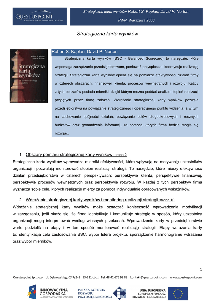 Strategiczna karta wyników Robert S. Kaplan, David P. Norton, PWN, Warszawa 2006 Strategiczna karta wyników Robert S. Kaplan, David P. Norton Strategiczna karta wyników (BSC - Balanced Scorecard) to narzędzie, które wspomaga zarządzanie przedsiębiorstwem, ponieważ przyspiesza i koordynuje realizację strategii. Strategiczna karta wyników opiera się na pomiarze efektywności działań firmy w czterech obszarach: finansowej, klienta, procesów wewnętrznych i rozwoju. Każdy z tych obszarów posiada mierniki, dzięki którym można poddać analizie stopień realizacji przyjętych przez firmę założeń. Wdrożenie strategicznej karty wyników pozwala przedsiębiorstwu na powiązanie strategicznego i operacyjnego punktu widzenia, a w tym na zachowanie spójności działań, powiązanie celów długookresowych i rocznych budżetów oraz gromadzenie informacji, za pomocą których firma będzie mogła się rozwijać. 1. Obszary pomiaru strategicznej karty wyników strona 2 Strategiczna karta wyników wprowadza mierniki efektywności, które wpływają na motywację uczestników organizacji i pozwalają monitorować stopień realizacji strategii. To narzędzie, które mierzy efektywność działań przedsiębiorstwa w czterech perspektywach: perspektywie klienta, perspektywie finansowej, perspektywie procesów wewnętrznych oraz perspektywie rozwoju. W każdej z tych perspektyw firma wyznacza sobie cele, których realizację mierzy za pomocą indywidualnie opracowanych wskaźników. 2. Wdrażanie strategicznej karty wyników i monitoring realizacji strategii strona 10 Wdrażanie strategicznej karty wyników może oznaczać konieczność wprowadzenia modyfikacji w zarządzaniu, jeśli okaże się, że firma identyfikuje i komunikuje strategię w sposób, który uczestnicy organizacji mogą interpretować według własnych przekonań. Wprowadzenie karty w przedsiębiorstwie warto podzielić na etapy i w ten sposób monitorować realizację strategii. Etapy wdrażania karty to: identyfikacja celu zastosowania BSC, wybór lidera projektu, sporządzenie harmonogramu wdrażania oraz wybór mierników. 1 Questuspoint Sp. z o.o. ul. Dąbrowskiego 247/249 93-231 Łódź Tel. 48 42 675 99 83 [email protected] www.questuspoint.com Strategiczna karta wyników Robert S. Kaplan, David P. Norton, PWN, Warszawa 2006 Obszary pomiaru strategicznej karty wyników Strategiczna karta wyników wprowadza mierniki efektywności, które wpływają na motywację uczestników organizacji i pozwalają monitorować stopień realizacji strategii. To narzędzie, które mierzy efektywność działań przedsiębiorstwa w czterech perspektywach: perspektywie klienta, perspektywie finansowej, perspektywie procesów wewnętrznych oraz perspektywie rozwoju. W każdej z tych perspektyw firma wyznacza sobie cele, których realizację mierzy za pomocą indywidualnie opracowanych wskaźników. Perspektywa klienta Balanced Scorecard pozwala zidentyfikować potencjalnych klientów oraz segmenty, w których firma ma szansę prześcignąć konkurentów. Identyfikacja ta służy dwóm celom – po pierwsze, pozwala sporządzić definicję wartości, którą firma zamierza oferować wybranym klientom. Po drugie, pozwala odpowiedzieć na pytanie, w jaki sposób firma zamierza kontrolować, czy podejmowane przez nią działania przynoszą spodziewany efekt. Po identyfikacji, przedsiębiorstwo ma za zadanie opracować cele i mierniki, dzięki którym będzie w stanie zaoferować klientom większą niż inne firmy wartość dodaną. Warunek ten spełni, jeśli podczas wyznaczania celów i formułowania mierników zadba o takie atrybuty, jak cechy oferowanego produktu lub usługi, relacje z klientami oraz wizerunek firmy. Cechy produktu oznaczają, że trzeba sprecyzować jego funkcjonalność, jakość i cenę. Relacje dotyczą utrzymania klientów, wizerunek natomiast oznacza budowę reputacji przedsiębiorstwa na rynku. Przedsiębiorstwo Kenyon Stores – sprzedawca odzieży – postanowiło skorzystać z Balanced Scorecard, aby dopasować ofertę do potrzeb klientów. W ramach BSC, proces dostarczania klientom wartości oparło na trzech etapach. Najpierw firma zidentyfikowała cele w perspektywie klienta. Podczas tej identyfikacji, posłużyła się modyfikacjami w strategii marketingowej – zarząd przedsiębiorstwa sformułował kluczowe punkty strategii, a wśród nich uwzględnił takie kluczowe założenie, jak kompleksowe zaspokojenie potrzeb klientów (niezależnie od pory roku i obowiązujących na rynku trendów). Firma zamierzała to osiągnąć dzięki, po pierwsze, działaniom handlowym, które zachęciłyby klientów do powtarzania zakupów. Po drugie 2 Questuspoint Sp. z o.o. ul. Dąbrowskiego 247/249 93-231 Łódź Tel. 48 42 675 99 83 [email protected] www.questuspoint.com Strategiczna karta wyników Robert S. Kaplan, David P. Norton, PWN, Warszawa 2006 natomiast, postanowiła zdefiniować, do jakiej grupy należą jej klienci i jakimi przyzwyczajeniami kierują się podczas dokonywania zakupów. Przedsiębiorstwo Kenyon pogrupowało wyznaczone cele według cech produktu, relacji z klientami oraz wizerunku marki. Następnie firma wyznaczyła mierniki, za pomocą których zamierzała kontrolować stopień realizacji zamierzeń. Wśród cech produktu znalazła się, między innymi, cena i jakość wyrobu – tu Kenyon zdecydował, iż do pomiaru użyje, odpowiednio, przeciętnej jednostkowej ceny detalicznej oraz wskaźnika liczby zwrotów. Podczas planowania relacji z klientami, firma postanowiła zmierzyć poziom ich satysfakcji z dostępności rozmiarów i kolorów oferowanej odzieży – tu z kolei za miernik przyjęto wyniki cyklicznie przeprowadzanych ankiet. Natomiast podczas budowy wizerunku, Kenyon oparł się na monitoringu postępów w osiąganiu pozycji wiodącej marki na rynku krajowym. W tym wypadku miernikiem stała się marża realizowana na firmowych produktach. W ciągu kilku lat okazało się, 