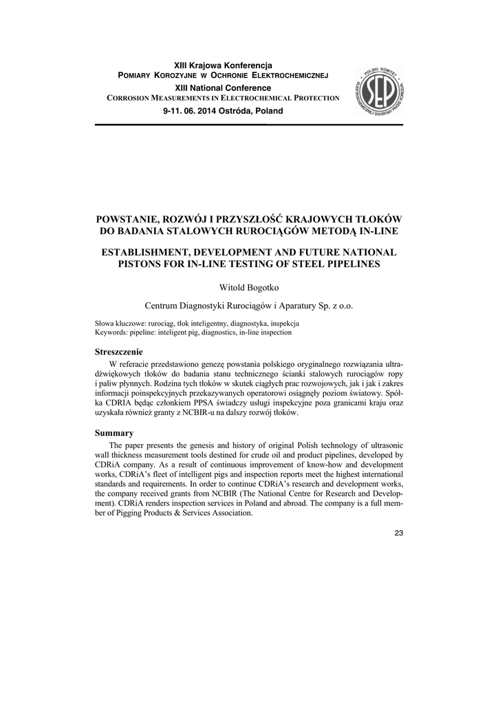 XIII Krajowa Konferencja POMIARY KOROZYJNE W OCHRONIE ELEKTROCHEMICZNEJ XIII National Conference CORROSION MEASUREMENTS IN ELECTROCHEMICAL PROTECTION 9-11. 06. 2014 Ostróda, Poland POWSTANIE, ROZWÓJ I PRZYSZŁOŚĆ KRAJOWYCH TŁOKÓW DO BADANIA STALOWYCH RUROCIĄGÓW METODĄ IN-LINE ESTABLISHMENT, DEVELOPMENT AND FUTURE NATIONAL PISTONS FOR IN-LINE TESTING OF STEEL PIPELINES Witold Bogotko Centrum Diagnostyki Rurociągów i Aparatury Sp. z o.o. Słowa kluczowe: rurociąg, tłok inteligentny, diagnostyka, inspekcja Keywords: pipeline: inteligent pig, diagnostics, in-line inspection Streszczenie W referacie przedstawiono genezę powstania polskiego oryginalnego rozwiązania ultradźwiękowych tłoków do badania stanu technicznego ścianki stalowych rurociągów ropy i paliw płynnych. Rodzina tych tłoków w skutek ciągłych prac rozwojowych, jak i jak i zakres informacji poinspekcyjnych przekazywanych operatorowi osiągnęły poziom światowy. Spółka CDRIA będąc członkiem PPSA świadczy usługi inspekcyjne poza granicami kraju oraz uzyskała również granty z NCBIR-u na dalszy rozwój tłoków. Summary The paper presents the genesis and history of original Polish technology of ultrasonic wall thickness measurement tools destined for crude oil and product pipelines, developed by CDRiA company. As a result of continuous improvement of know-how and development works, CDRiA’s fleet of intelligent pigs and inspection reports meet the highest international standards and requirements. In order to continue CDRiA’s research and development works, the company received grants from NCBIR (The National Centre for Research and Development). CDRiA renders inspection services in Poland and abroad. The company is a full member of Pigging Products & Services Association. 23 1. Geneza powstania tłoków Głównym inicjatorem powstania rodzimych tłoków do badania stanu technicznego ścianki stalowych podziemnych rurociągów było Przedsiębiorstwo Eksploatacji Rurociągów Naftowych PERN „Przyjaźń”, a osobiście dyrektor ds. technicznych tego przedsiębiorstwa Grzegorz Mojzesowicz. Dyrektor Mojzesowicz był aktywnym członkiem Komisji Ochrony Elektrochemicznej przy SIT Przemysłu Chemicznego, a następnie przy SEP – a więc poprzedniczki naszego Komitetu Ochrony Elektrochemicznej. W czasie spotkań bardzo często z nim rozmawiałem o problemach automatyzacji ochrony katodowej eksploatowanych przez PERN rurociągów ropy i den zbiorników. Pracując w Centrum Techniki Okrętowej i prowadząc pracownię Ochrony Elektrochemicznej, wspólnie z pracownikami Wydziału Elektroniki Politechniki Gdańskiej w ramach pracy finansowanej przez Problemy Węzłowe realizowaliśmy w latach 1987–1988 na terenie WOZG Poznań radiolinię nadzorującą pracę automatycznych stacji ochrony katodowej bez składowej omowej typu TB 6026 pomiędzy Krobią a Szczecinem. Po zakończeniu pracy nad radiolinią Krobią – Szczecinem z kolegami z PG Wincentym Łukajtisem, Dariuszem Jonaszkiem i Pawłem Raczyńskim złożyliśmy propozycję zbudowania podobnej radiolinii na rurociągach PERN. Dyrektor Mojzesowicz odpowiedział krótko: „koledzy z tym poradziłem sobie sam, ale proponuję abyście zajęli się opracowaniem tłoków do badania rurociągów od wnętrza rury”. Zaskoczenie było całkowite, nikt z nas o takim sposobie badania rurociągów w tym czasie nie słyszał, niemniej postanowiliśmy podnieść rzuconą rękawicę. Zaczęło się szukanie po literaturze zagranicznej. Natrafiliśmy na pierwsze pateny, do współpracy wciągnęliśmy prof. Andrzeja Wilczyńskiego z Politechniki Warszawskiej (kolegę z ławy maturalnej), który opracowywał tłoki separacyjne do wojskowych rurociągów strategicznych. Powoli kształtował się obraz kierunków poszukiwań, podstawowych wymagań i projektów rozwiązania. Po około roku powstał plan pracy badawczo-konstrukcyjnej planowanej do realizacji w ramach Problemów Węzłowych. Drugim podejściem dla pozyskania funduszy na budowę tłoków było włączenie tego tematu do większej pracy. W CTO prowadzono w drugiej połowie lat 80. XX w. prace konstrukcyjne w ramach programu Szelf – Infrastruktura dla eksploatacji pól naftowych dla Kanady. Analizowano różne rozwiązania, wież wiertniczych, barek do układania rurociągów podmorskich itp. Ponieważ konstrukcje te wymagały projektów ochrony elektrochemicznej, projekty przechodziły przez Pracownię Ochrony Elektrochemicznej. Kolejną więc próbą finansowania prac był pomysł na realizację pracy w ramach Rządowego Projektu Zamawianego pt. „Warunki techniczno-ekonomiczne i ekologiczne budowy rurociągów w polskiej strefie ekonomicznej Morza Bałtyckiego”. Oprócz CTO pracę realizować miały: Instytut Górnictwa Naftowego i Gazownictwa, Instytut Chemii Fizycznej PAN, Instytut Oceanografii oraz Instytut Rybołówstwa Morskiego i Biologii Morza Uniwersytetu Gdańskiego. Dyrektorzy wszystkich instytutów na zebraniu organizacyjnym konsorcjum, jako kierownika pracy wytypowali pomysłodawcę pracy, czyli autora niniejszego opracowania. 24 Przygotowany został wniosek z planem pracy, kosztorysem, harmonogramem (w tym budowy prototypu tłoka). Wszystko zostało napisane, oprawione – brakowało tylko podpisu Dyrektora CTO jako instytucji wiodącej. W tym czasie w wyniku transformacji nastąpiła zmian na stanowisku Dyrektora Naczelnego CTO i podpis nie został złożony. Na kolejnym posiedzeniu Komisji Ochrony Elektrochemicznej Dyrektor Mojzesowicz zadał pytanie: „Panie Witku bierze się pan z budowę tłoków, czy mam dać tą prace profesorowi Wiktorowi Dziubie”? Cóż miałem odpowiedzieć: „Panie Grzegorzu występowałem o 4 mln. zł, lecz dyrektor CTO nie podpisał pracy twierdząc, że przemysłu okrętowego temat nie interesuje. Dyrektor na to: „a za milion zł pan zrobi. Nieważne jak, prywatnie, przez spółkę na prace zlecone. Niech pan coś wymyśli”. Cóż było robi