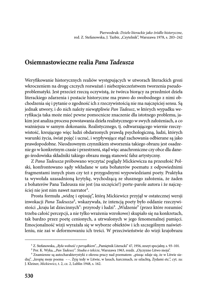 Polityka i społeczeństwo Pierwodruk: Dzieło literackie jako źródło historyczne, red. Z. Stefanowska, J. Tazbir, „Czytelnik”, Warszawa 1978, s. 203–242 Osiemnastowieczne realia Pana Tadeusza Weryfikowanie historycznych realiów występujących w utworach literackich grozi wkroczeniem na drogę czczych rozważań i niebezpieczeństwem tworzenia pseudoproblematyki. Jest przecież rzeczą oczywistą, że twórca biorący za przedmiot dzieła literackiego zdarzenia i postacie historyczne ma prawo do swobodnego z nimi obchodzenia się i pytanie o zgodność ich z rzeczywistością nie ma najczęściej sensu. Są jednak utwory, i do nich należy niewątpliwie Pan Tadeusz, w których wypadku weryfikacja taka może mieć pewne pomocnicze znaczenie dla istotnego problemu, jakim jest analiza procesu powstawania dzieła realistycznego w swych założeniach, a co ważniejsza w samym dokonaniu. Realistycznego, tj. odtwarzającego wiernie rzeczywistość, kreującego więc ludzi obdarzonych prawdą psychologiczną, ludzi, których warunki życia, świat pojęć i uczuć, i wypływające stąd zachowania odbierane są jako prawdopodobne. Nieodzownym czynnikiem stworzenia takiego obrazu jest osadzenie go w konkretnym czasie i przestrzeni, stąd więc anachroniczne czy obce dla danego środowiska składniki takiego obrazu mogą stanowić fałsz artystyczny. Z Pana Tadeusza próbowano wyczytać poglądy Mickiewicza na przeszłość Polski, konfrontowano sądy wkładane w usta bohaterów poematu z odpowiednimi fragmentami innych pism czy też z przygodnymi wypowiedziami poety. Praktyka ta wywołała uzasadnioną krytykę, wychodzącą ze słusznego założenia, że żaden z bohaterów Pana Tadeusza nie jest (na szczęście!) porte-parole autora i że najczęściej nie jest nim nawet narrator¹. Prosta formuła „widzę i opisuję”, którą Mickiewicz przyjął w ostatecznej wersji inwokacji Pana Tadeusza², wskazywała, że intencją poety było oddanie rzeczywistości „kraju lat dziecinnych”: przyrody i ludzi³. „Widzenie” (przez które rozumieć trzeba całość percepcji, a nie tylko wrażenia wzrokowe) skupiało się na konkretach, tak bardzo przez poetę cenionych, a utrwalonych w jego fenomenalnej pamięci. Emocjonalność wizji wyrażała się w wyborze obiektów i ich szczególnym naświetleniu, nie zaś w deformowaniu ich treści. W przeciwieństwie do wizji krajobrazu ¹ Z. Stefanowska, „Była wolność z porządkiem”, „Pamiętnik Literacki” 47, 1956, zeszyt specjalny, s. 93–101. ² Por. K. Wyka, „Pan Tadeusz”. Studia o tekście, Warszawa 1963, rozdz. „Ojczyzno Litwo moja”. ³ Znamienne są autocharakterystyki z okresu pracy nad poematem: „pisząc zdaje się, że w Litwie siedzę”, „kropię moje poema – –. Żyję tedy w Litwie, w lasach, karczmach, ze szlachtą, Żydami etc.”, cyt. za: J. Kleiner, Mickiewicz, t. 2, cz. 2, Lublin 1948, s. 162. 530 Osiemnastowieczne realia Pana Tadeusza i przyrody wizja świata ludzkiego nie wywodziła się wyłącznie z autopsji, lecz składały się na nią i relacje innych osób, a również wiadomości zaczerpnięte z lektury, co pomniejszało jej autentyzm. Doszły też wrażenia z pobytu w Wielkopolsce. „Opisywanie”, choć pełne rozwagi i wytrwałego dążenia do optymalnej formy, a zasilane ogromną i z niezwykłą swobodą wykorzystywaną kulturą literacką, nie przeinaczało wizji. Poza pewnymi wyjątkami nie dorzucało też elementów, których wizja nie zawierała. Bowiem, jak słusznie pisał Zygmunt Szweykowski polemizujący z poglądem, iż „świat Pana Tadeusza jest kreowany według wymagań ideowej walki”: „propagandy nie ma w utworze, a walka o ideę, satyra czy tendencja są poematowi najzupełniej obce”⁴. Mickiewicz „widział i opisywał” Litwę czasów swego dzieciństwa i wczesnej młodości, ale żyjący tam przedstawiciele nieco starszego pokolenia pamiętali wiek XVIII; wiek ten urobił ich mentalność i obyczaje i chętnie wracali doń wspomnieniami. Ponadto w XVIII w. toczy się preakcja poematu, znana z relacji włożonych w usta kilku bohaterów. Osiemnastowieczne realia występują więc w Panu Tadeuszu widziane oczami postaci, którym autor kazał (w ostatecznej wersji poematu) działać w latach 1811–12. Tak dzieje się przeważnie, nawet gdy mówi o nich narrator, nieczęsto, jak wiadomo, wypowiadający w poemacie opinie istotnie odautorskie⁵. Obok wypowiedzi bezpośrednio dotyczących XVIII w. można też w poglądach i zachowaniach bohaterów Pana Tadeusza dostrzegać typowe cechy tego stulecia, niełatwo jednak je wyodrębnić, nie są to bowiem na ogół jakieś jedynie relikty przeszłości, lecz organiczne składniki ówczesnego życia w wielu przejawach nieróżniącego się od zeszłowiecznego. Żywa tradycja historyczna panująca wśród bohaterów Pana Tadeusza sięga czasów Sobieskiego. Ale i podziw dla tego monarchy, i kult, jakim go darzono, był właśnie dziedzictwem XVIII w., kiedy to zapominano już o cieniach panowania króla rodaka, a pamiętano jedynie blaski ostatnich tryumfów oręża polskiego. Tak jak Stanisław August wielbił „tarczę Sobieskiego zwycięstwy słynącą”, która „zasłoniła ojczyznę”⁶, a jego przeciwnicy złośliwie życzyli, aby „Stanisław skamieniał, a Jan Trzeci ożył”, tak i bohaterowie Pana Tadeusza widzieli w panowaniu zwycięzcy spod Chocimia i Wiednia epokę potęgi Rzeczypospolitej⁷ i oczekiwali nowego Jana Trzeciego – zbawcy ojczyzny⁸. ⁴ Z. Szweykowski, „Pan Tadeusz” – poemat humorystyczny, Poznań 1949, s. 3. ⁵ Szweykowski, op. cit., s. 55–63; Stefanowska, op. cit., s. 99. ⁶ Stanisław August do Adama Naruszewicza 21 VIII 1775 i 11 X 1778, Korespondencja Adama Naruszewicza 1762–1796, z papierów po Ludwiku Bernackim uzup. i wyd. J. Platt, Wrocław 1959, s. 42, 127. ⁷ W opowieści Wojskiego ukazuje się Sobieski jako potężny władca wyruszający na odsiecz Wiedn