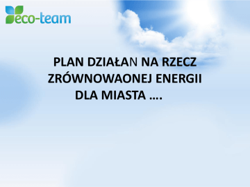 PLAN DZIAŁAN NA RZECZ ZRÓWNOWAONEJ ENERGII DLA MIASTA …. PLAN DZIAŁAN NA RZECZ ZRÓWNOWAONEJ ENERGII DLA MIASTA …. PLAN DZIAŁAŃ NA RZECZ ZRÓWNOWAONEJ ENERGII DLA MIASTA …. SPIS TREŚCI 1. Wprowadzenie 2. Streszczenie 3. Otoczenie społeczno-gospodarcze 4. Dotychczasowe działania 5. Bazowa inwentaryzacja emisji Wprowadzenie, Zaopatrzenie w ciepło, Emisje ze spalania gazu, Transport i komunikacja miejska, Energia elektryczna, Bazowa i kontrolna inwentaryzacja emisji 6. Program na rzecz poprawy jakości powietrza 7. Wnioski i założenia dla planowanych działań Wnioski z analizy, Interesariusze, Spójność programu, Wykonalność instytucjonalna, monitoring, montaż finansowy, Konsultacje Planu działań na rzecz zrównoważonej energii dla miasta 8. Plan działań 9. Uwagi zgłoszone w ramach konsultacji Strategiczny plan działań na rzecz ograniczenia emisji CO2 w gminie …. do roku 2020 Spis treści 1. Wprowadzenie Cel opracowania, Zakres opracowania, Ogólna charakterystyka gminy 2. Emisja CO2 w roku bazowym 2.1 Metodologia ustalanie wielkości bazowej Zakres inwentaryzacji, Metodologia obliczeń, Pozyskanie danych, 2.2 Analiza głównych źródeł emisji 2.3 Bilans emisji CO2 w roku 2012 2.4 Scenariusze zaniechania redukcji gazów cieplarnianych na terenie gminy 2.5 Analiza uwarunkowań zewnętrznych i wewnętrznych ograniczenia emisji - Analiza SWOT 3. Plan działań na rzecz ograniczenia emisji CO2 Cele strategiczne, Planowane działania, System realizacji działań (Warianty realizacji działań, Możliwe źródła finansowania planu, Monitoring i ewaluacja) Strategiczny plan działań na rzecz ograniczenia emisji CO2 w gminie …. do roku 2020 Spis treści 1. Wprowadzenie 1.1 Cel opracowania 1.2 Zakres opracowania 1.3 Ogólna charakterystyka gminy 1.3.1 Położenie geograficzne 1.3.2 Środowisko naturalne 1.3.3 Demografia 1.3.4 Gospodarka mieszkaniowa 1.3.5 Działalność gospodarcza 1.3.6 Rolnictwo 1.3.7 Gospodarka wodno-ściekowa 1.3.8 Transport i komunikacja 1.3.9 Infrastruktura energetyczna na terenie gminy 1.3.10 Potencjał ekonomiczny miasta Strategiczny plan działań na rzecz ograniczenia emisji CO2 w gminie …. do roku 2020 Spis treści 2. Emisja CO2 w roku bazowym 2.1 Metodologia ustalanie wielkości bazowej 2.1.1 Zakres inwentaryzacji 2.1.2 Metodologia obliczeń 2.1.3 Pozyskanie danych 2.2 Analiza głównych źródeł emisji 2.2.1 Obiekty/urządzenia komunalne 2.2.1.2. Budynki komunalne 2.2.1.3. Przedsiębiorstwo Komunalne 2.2.2 Obiekty użytkowo-usługowe 2.2.3 Budynki mieszkalne 2.2.4 Oświetlenie uliczne 2.2.5 Transport 2.2.6 Wykorzystanie odnawialnych źródeł energii w gminie Strategiczny plan działań na rzecz ograniczenia emisji CO2 w gminie …. do roku 2020 Spis treści 2. Emisja CO2 w roku bazowym 2.1 Metodologia ustalanie wielkości bazowej 2.2 Analiza głównych źródeł emisji 2.3 Bilans emisji CO2 w roku 2012 2.4 Scenariusze zaniechania redukcji gazów cieplarnianych na terenie gminy 2.5 Analiza uwarunkowań zewnętrznych i wewnętrznych ograniczenia emisji - Analiza SWOT Strategiczny plan działań na rzecz ograniczenia emisji CO2 w gminie …. do roku 2020 Spis treści 3. Plan działań na rzecz ograniczenia emisji CO2 3.1 Cele strategiczne oraz zakładany poziom redukcji emisji CO2 do roku 2020 3.2 Planowane działania 3.2.1 Obiekty komunalne 3.2.2 Przedsiębiorstwo Komunalne 3.2.3 Obiekty usługowo-użytkowe 3.2.4 Budynki mieszkalne 3.2.5 Oświetlenie uliczne 3.2.6 Transport … Strategiczny plan działań na rzecz ograniczenia emisji CO2 w gminie …. do roku 2020 Spis treści 3. Plan działań na rzecz ograniczenia emisji CO2 … 3.3 System realizacji działań 3.3.1 Warianty realizacji działań 3.3.2 Możliwe źródła finansowania planu 3.3.2.1 Środki własne 3.3.2.2 Fundusze i programy krajowe 3.3.2.3 Fundusze i programy finansowane z budżetu Unii Europejskiej 3.3.2.4 Inne źródła finansowania 3.3.3 Monitoring i ewaluacja Bazowa Inwentaryzacja Emisji (BEI) krótkie wprowadzenie Bazowa Inwentaryzacja Emisji (BEI) • Bazowa Inwentaryzacja Emisji to ilościowe (skwantyfikowane) określenie ilości emisji gazów cieplarnianych w rozbiciu na poszczególne jej źródła w odniesieniu do konkretnej jst. • Inwentaryzacja emisji gazów cieplarnianych z obszaru miasta/gminy polega na określeniu całkowitych emisji gazów cieplarnianych (wszystkich, bądź wybranych), które mają swoje źródła na terytorium miasta/gminy Bazowa Inwentaryzacja Emisji (BEI) • Wielkością jest CO2e – czyli ekwiwalent CO2. Nie wszystkie gazy cieplarniane to COz. Np: 1 tona CH4 = 21 ton CO2-eq Żródło: JRC • Dobrze wykonana inwentaryzacja pozwala zidentyfikować główne źródła emisji na obszarze miasta/gminy Bazowa Inwentaryzacja Emisji (BEI) • Francja 5,6 ton/os • Włochy 6,9 ton/os • Anglia 7,9 ton/os • Polska 8,3 ton/os • Niemcy 9,1 ton/os • U.S.A. 17,6 ton/os Źródło: World Bank, zakres 2010-2014, http://data.worldbank.org/indicator/EN.ATM.CO2E.PC Bazowa Inwentaryzacja Emisji (BEI) Krajowa emisja gazów cieplarnianych w roku bazowym 1988/95 i 2007r Źródło: Krajowa inwentaryzacja emisji i pochłaniania gazów cieplarnianych za rok 2007 Bazowa Inwentaryzacja Emisji (BEI) pozwala zidentyfikować główne źródła emisji CO2 Bazowa Inwentaryzacja Emisji (BEI) Metodologia inwentaryzacji 1. Podejście IPCC: (Międzyrządowy Panel ds. Zmian Klimatu) Bazuje na zawartości węgla w paliwach. Zalety : - prostota - zgodność z międzynarodowymi zasadami raportowania (UNFCC, Protokół z Kioto, …) 2. Podejście LCA: (Analiza Cyklu Życia) Uwzględnia emisje pojawiające się na kolejnych etapach cyklu życia energii Zaleta: - lepsza ocena globalnego oddziaływania działań realizowanych w mieście Bazowa Inwentaryzacja Emisji (BEI): główne sektory 1. Końcowe zużycie energii w budynkach, urządzeniach/instalacjach oraz przemyśle 2. Końcowe zużycie energii w transporcie 3. Inne źródła emisji (nie związane ze zu