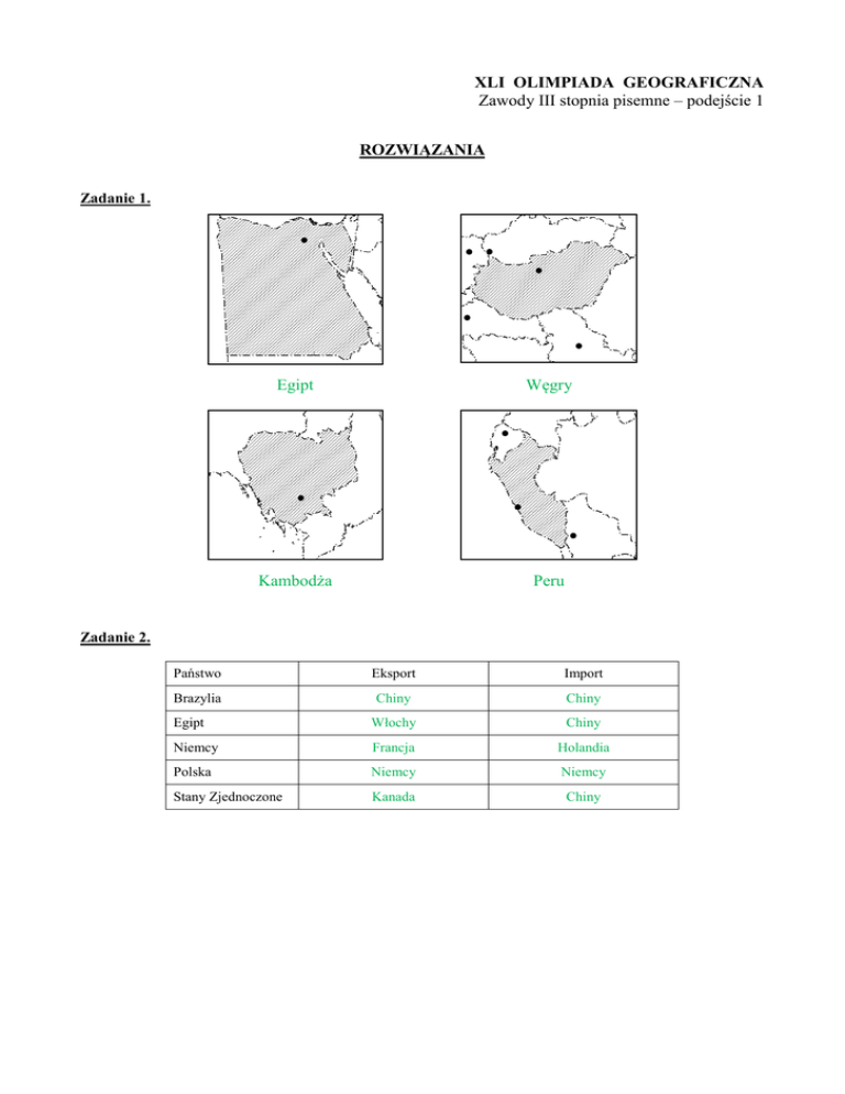 -1r/1- XLI OLIMPIADA GEOGRAFICZNA Zawody III stopnia pisemne – podejście 1 ROZWIĄZANIA Zadanie 1. Egipt Węgry Kambodża Peru Zadanie 2. Państwo Eksport Import Brazylia Chiny Chiny Egipt Włochy Chiny Niemcy Francja Holandia Polska Niemcy Niemcy Stany Zjednoczone Kanada Chiny -1r/2- Zadanie 3. D A – Brazylia A B – Francja C – Stany Zjednoczone D – Węgry B Zadanie 4. Chiny Indie cynamon Indonezja Rosja Brazylia Stany Zjednoczone X jabłka X jęczmień X kawa X kukurydza X maliny X ziemniaki X bydło X konie X owce X Zadanie 5. Państwo Wielkość nominalnego PKB (mld USD) Udział sektora przemysłowego w wartości dodanej (%) Polska 518 34 Chiny 9240 44 Rosja 2097 36 -1r/3- Zadanie 6. A – długość linii kolejowych B – liczba bezrobotnych C – liczba mieszkańców dużych aglomeracji (liczących powyżej 1 mln mieszkańców) D – liczba osób w wieku 15 lat i więcej nieumiejących pisać i czytać E – przyjazdy turystów zagranicznych (według kryterium co najmniej 1 noclegu) F – wyjazdy turystów za granicę (według kryterium co najmniej 1 noclegu) E F C A Zadanie 7. A. A – dezurbanizacja B – ruralizacja A C – suburbanizacja C D – urbanizacja wstępna (początkowa) D B. Według tego modelu, większość polskich dużych miast znajduje się aktualnie w fazie: dezurbanizacji ruralizacji suburbanizacji urbanizacji wstępnej (początkowej) -1r/4- Zadanie 8. P Oficjalną walutą Ekwadoru jest dolar amerykański. X Chrześcijaństwo, islam i judaizm to religie monoteistyczne. X F Gazociąg Północny (Nord Stream) łączy Rosję, Estonię i Niemcy. X Kontrurbanizacja jest synonimem suburbanizacji. X Ponad połowa ludności świata mieszka na obszarach powyżej 500 m n.p.m. X UNESCO jest instytucją założoną przez Unię Europejską. X Wartość eksportu Polski w 2013 r. była większa niż Irlandii. X Wielkość nominalnego PKB stanu Nowy Jork (USA) była w 2013 r. większa, niż wielkość nominalnego PKB Polski. X Zadanie 9. A – udział eksportu w PKB B – udział ludności w wieku 65 lat i więcej C – udział rolnictwa w PKB D – udział wydatków na zbrojenia w PKB 1970 2012 B Zadanie 10. Rok Odkrywca (podróżnik) Obiekt Aktualna nazwa państwa ok. 980 Eryk Rudy Grenlandia Dania 1521 Ferdynand Magellan Mariany Stany Zjednoczone 1596 Willem Barents Spitsbergen Norwegia 1778 James Cook Hawaje Stany Zjednoczone