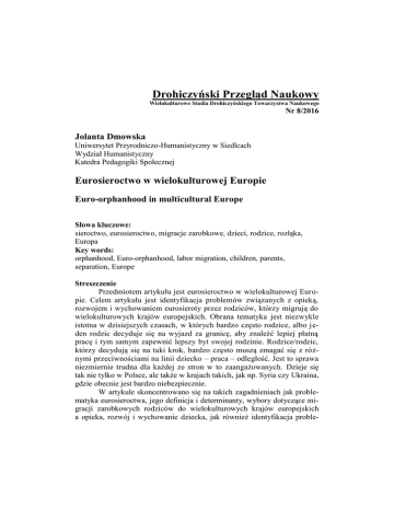 Drohiczyński Przegląd Naukowy Wielokulturowe Studia Drohiczyńskiego Towarzystwa Naukowego Nr 8/2016 Jolanta Dmowska Uniwersytet Przyrodniczo-Humanistyczny w Siedlcach Wydział Humanistyczny Katedra Pedagogiki Społecznej Eurosieroctwo w wielokulturowej Europie Euro-orphanhood in multicultural Europe Słowa kluczowe: sieroctwo, eurosieroctwo, migracje zarobkowe, dzieci, rodzice, rozłąka, Europa Key words: orphanhood, Euro-orphanhood, labor migration, children, parents, separation, Europe Streszczenie Przedmiotem artykułu jest eurosieroctwo w wielokulturowej Europie. Celem artykułu jest identyfikacja problemów związanych z opieką, rozwojem i wychowaniem eurosieroty przez rodziców, którzy migrują do wielokulturowych krajów europejskich. Obrana tematyka jest niezwykle istotna w dzisiejszych czasach, w których bardzo często rodzice, albo jeden rodzic decyduje się na wyjazd za granicę, aby znaleźć lepiej płatną pracę i tym samym zapewnić lepszy byt swojej rodzinie. Rodzice/rodzic, którzy decydują się na taki krok, bardzo często muszą zmagać się z różnymi przeciwnościami na linii dziecko – praca – odległość. Jest to sprawa niezmiernie trudna dla każdej ze stron w to zaangażowanych. Dzieje się tak nie tylko w Polsce, ale także w krajach takich, jak np. Syria czy Ukraina, gdzie obecnie jest bardzo niebezpiecznie. W artykule skoncentrowano się na takich zagadnieniach jak problematyka eurosieroctwa, jego definicja i determinanty, wybory dotyczące migracji zarobkowych rodziców do wielokulturowych krajów europejskich a opieka, rozwój i wychowanie dziecka, jak również identyfikacja proble- 92 Jolanta Dmowska mów związanych z opieką, rozwojem i wychowaniem eurosieroty przez rodziców migrujących do wielokulturowych krajów europejskich. Abstract The topic of the article is euro-orphanhood in a multicultural Europe. The article aims to identify issues related to the care, development and upbringing of a euro-orphan by parents who migrate to multicultural European countries. The chosen topic is particularly significant in current times, when one or both parents often decide to move abroad in order to find a higherincome job and provide a better life for their family. The parents (or parent) who decide to take this step often have to face various difficulties related to reconciling work, children and the distance in between. It is a remarkably difficult matter for each of the parties involved. This is the case not only in Poland, but also in countries such as Syria and Ukraine, where the current situation is very dangerous. The article focuses on questions such as the issues of euroorphanhood, its definition and determinants, the choices regarding the economic migration of parents to multicultural European countries in relation to the care, development and upbringing of their child, as well as the identification of issues related to the care, development and upbringing of a euroorphan by parents who migrate to multicultural European countries. Wstęp Przedmiotem niniejszego artykułu jest eurosieroctwo w wielokulturowej Europie. Celem artykułu jest identyfikacja problemów związanych z opieką, rozwojem i wychowaniem eurosieroty przez rodziców, którzy migrują do wielokulturowych krajów europejskich. Koncentruję się na analizie literatury przedmiotu ze szczególnym uwzględnieniem definicji eurosieroctwa i jej determinantów, najważniejszych wyborów dotyczących migracji zarobkowych rodziców do wielokulturowych krajów europejskich a ich wpływu na opiekę, rozwój i wychowanie dziecka oraz identyfikacji problemów związanych z opieką, rozwojem i wychowaniem eurosieroty przez rodziców migrujących do wielokulturowych krajów europejskich. Na potrzeby niniejszego opracowania postawiono tezę o następującej treści: zakłada się, iż identyfikacja problemów związanych z opieką, rozwojem i wychowaniem eurosieroty przez rodziców, którzy migrują do wielokulturowych krajów europejskich odgrywa istotną rolę w zminimalizowaniu Eurosieroctwo w wielokulturowej Europie 93 rozpadu rodziny oraz uchronienia dziecka przed wieloma społecznymi odrzuceniami i psychicznymi problemami, jak również uchronieniem dziecka przed popełnieniem czynów karalnych, czy też wycofaniem społecznym. Przeprowadzono analizę polskiej literatury przedmiotu dotyczącą eurosieroctwa. Autorka w poniższym opracowaniu podjęła próbę określenia identyfikacji problemów związanych z opieką, rozwojem i wychowaniem eurosieroty przez rodziców, którzy migrują do wielokulturowych krajów europejskich. Na wstępie należy zauważyć, iż w różnych mediach często jest widoczne, jak rodzice uciekają z dziećmi z własnego kraju, a bywa i tak, że tylko jednemu z rodziców udało się wyjechać z kraju w nadziei na polepszenie swojej dotychczasowej sytuacji finansowej. Każda z takich sytuacji to dramat zarówno dla takiego rodzica, jak i dziecka, które w nim pozostało. W takiej sytuacji pojawia się także strach o życie własnego dziecka, własnej rodziny. Fakt przyjęcia Polski do Unii Europejskiej dał szansę wielu Polakom na legalne zatrudnienie we wszystkich krajach, które należą do UE. Duży procent społeczeństwa podjął decyzję o wyjeździe w celach zarobkowych. W sferze materialnej wielu z nich znacznie się polepszyło. Jednakże migracja niesie ze sobą również negatywne skutki, przede wszystkim odczuwalne dla najbliższej rodziny danej osoby, a w szczególności dla dzieci, które w większości przypadków pozostały w kraju. Eurosieroctwo jest wyraźnie dostrzegane, jednak mimo, że coraz więcej osób zdaje sobie sprawę, że jest to istotny problem dla całego społeczeństwa, to nadal nie ma efektywnego systemu pomocy dla rodziców migrujących, który skupiałby się nie tylko na samych dzieciach, lecz na całych rodzinach. Trzeba dostrzec, iż nie każda matka i ojciec decydują się na migrację tylko z powodu polepszenia do