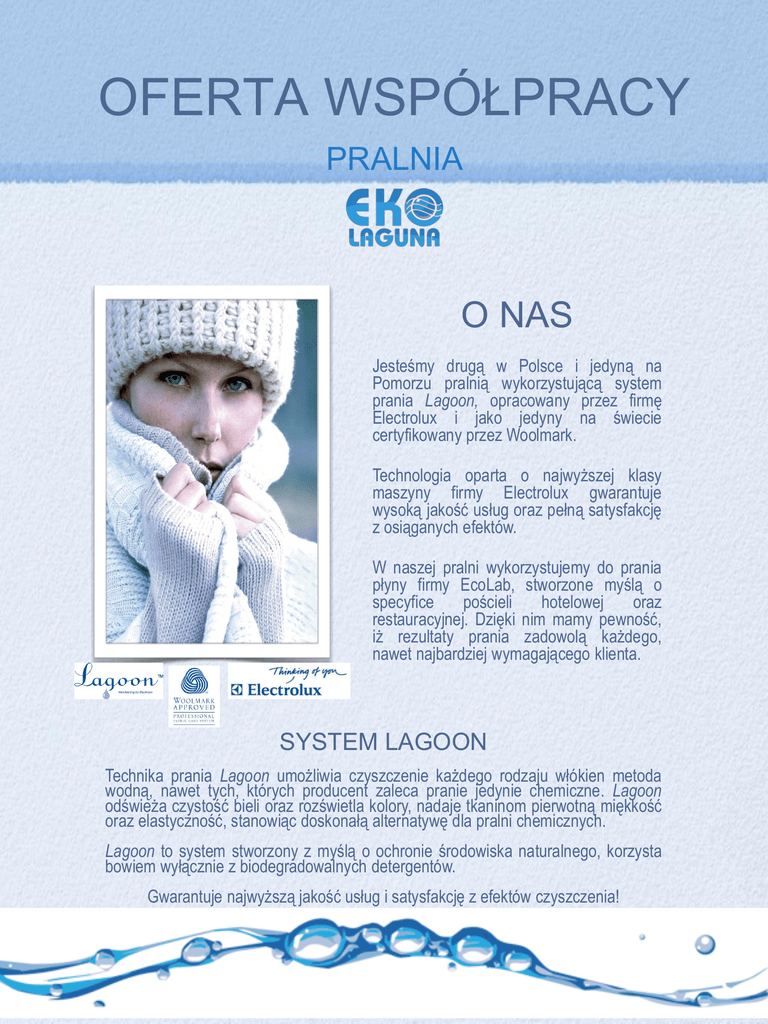 OFERTA WSPÓŁPRACY PRALNIA O NAS Jesteśmy drugą w Polsce i jedyną na Pomorzu pralnią wykorzystującą system prania Lagoon, opracowany przez firmę Electrolux i jako jedyny na świecie certyfikowany przez Woolmark. Technologia oparta o najwyższej klasy maszyny firmy Electrolux gwarantuje wysoką jakość usług oraz pełną satysfakcję z osiąganych efektów. W naszej pralni wykorzystujemy do prania płyny firmy EcoLab, stworzone myślą o specyfice pościeli hotelowej oraz restauracyjnej. Dzięki nim mamy pewność, iż rezultaty prania zadowolą każdego, nawet najbardziej wymagającego klienta. SYSTEM LAGOON Technika prania Lagoon umożliwia czyszczenie każdego rodzaju włókien metoda wodną, nawet tych, których producent zaleca pranie jedynie chemiczne. Lagoon odświeża czystość bieli oraz rozświetla kolory, nadaje tkaninom pierwotną miękkość oraz elastyczność, stanowiąc doskonałą alternatywę dla pralni chemicznych. Lagoon to system stworzony z myślą o ochronie środowiska naturalnego, korzysta bowiem wyłącznie z biodegradowalnych detergentów. Gwarantuje najwyższą jakość usług i satysfakcję z efektów czyszczenia! PROFESJONALNA OBSŁUGA Nieustannie wprowadzamy udogodnienia dla naszych klientów. Dzięki nowoczesnym rozwiązaniom informatycznym, opracowanym wyłącznie dla Pralni Eko Laguna, będą mieli Państwo możliwość pełnego wglądu w bieżący stan ilości wykonanych usług prania wraz z podglądem na faktury i stan płatności. ZAKRES USŁUG Przedstawiamy podstawowy zakres usług, który możemy rozszerzyć pod katem Państwa potrzeb, stając naprzeciw Państwa wymaganiom: PRANIE I PRASOWANIE bielizna pościelowa, bielizna restauracyjna, uniformy pracownicze, asortyment fitness i SPA, każdego rodzaju odzież fasonowa MAGIEL CZYSZCZENIE (koce, kołdry, narzuty) PODSTAWOWE USŁUGI DETASZERSKIE PRZERÓBKI KRAWIECKIE TRANSPORT (odbiór i dostawa) OFERTA CENOWA Zapraszamy do kontaktu z naszym przedstawicielem, abyśmy mogli przygotować dla Państwa najbardziej konkurencyjną ofertę cenową dostępną na rynku, gwarantując przy tym zawsze najwyższą jakość usługi. BOGATE PORTFOLIO KLIENTÓW Możemy poszczycić się bogatym doświadczeniem w obsłudze hoteli i pensjonatów, fitness klubów oraz SPA. Obecnie współpracujemy m.in. z: Willa Julia, Willa Ludwinia, Willa Palladium, Willa Bryza Dbając o najwyższą jakość usług zyskujemy partnerów biznesowych, dla których jakość i terminowość są najważniejsze. ZAPRASZAMY DO WSPÓŁPRACY ul. Legionów 115b, lok. 4 Gdynia Redłowo Tel. 508 149 515 www.eko-laguna.pl [email protected]