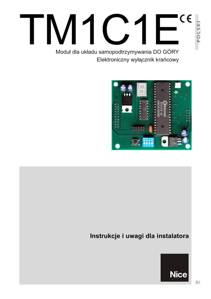 POLSKI TM1C1E Moduł dla układu samopodtrzymywania DO GÓRY Elektroniczny wyłącznik krańcowy Instrukcje i uwagi dla instalatora 43 POLSKI MODUŁ DODATKOWY TM1C1E MONTAŻ W celu podłączenia lub odłączenia modułu dodatkowego należy odłączyć zasilanie elektryczne! 4 Programowanie położenia krańcowego przy pomocy EES (Elektroniczny wyłącznik krańcowy) Mostki: X2-J6, X3-J8-J9, X4a-J24, X4b-J26, X5-J21-J20-J19 Zworka: X11-Pin5-6 X3A-Pin1-2 X3B-Pin1-2 Cztery elementy dystansowe 8 mm wsunąć na trzpienie prowadzące i następnie wetknąć moduł dodatkowy TM1C1E za pomocą trzpieni prowadzących na płyta główna. Jeżeli brama znajduje się w dolnym położeniu krańcowym, to należy ją podnieść za pomocą korby ręcznej na wysokość ok. 50 cm, aby w przypadku wadliwie nastawionego kierunku obrotów uniknąć wypadnięcia linek nośnych. Następnie włączyć napięcie (włożyć wtyczkę CEE). ON SAB 1 234 Mikroprzełączniki od 1 do 4 na module dodatkowym TM1C1E ustawić na "ON". Na wyświetlaczu siedmiosegmentowym ukazuje się małe "u". Powinno ono znajdować się w górnej części wyświetlacza. Wskazuje wyświetlacz odwrócone "u" w dolnej części wskaźnika, należy na krótko wcisnąć przycisk SW1 (obok mikroprzełącznika). Na wyświetlaczu ukazuje się teraz "u" znajdujące się w górnej części wyświetlacza. 44 ON SAB 1 234 POLSKI MODUŁ DODATKOWY TM1C1E Teraz mikroprzełączniki 2, 3, 4 przesunąć na pozycję "OFF" (górna belka poprzeczna wyświetlacza miga). przyciskem "DO GÓRY" podnieść nieznacznie bramę do góry. Jeżeli brama się otwiera, to należy dalej kontynuować według ustępu "wyregulowanie górnego położenia krańcowego". Jeżeli jednak brama się zamyka, to przez miganie jest sygnalizowany błąd "6" (błąd kierunku obrotów) na wyświetlaczu i brama zatrzyma się. (Błąd "6" może zostać skasowany tylko poprzez odłączenie od zasilania napięciowego). W tym przypadku odłączyć napięcie i obrócić zamiennik fazy we wtyczce CEE lub we wtyczce X1 zamienić przewody L1 i L3. Następnie włączyć napięcie dalej kontynuować według ustępu "wyregulowanie górnego położenia krańcowego". Jeżeli brama się otwiera i mimo to ukazuje się błąd "6", to najpierw należy odłączyć zasilanie (wyciągnąć wtyczkę CEE) i po kilku sekundach znowu włączyć je. ON SAB 1 234 Teraz mikroprzełączniki od 1 do 4 przesunąć na pozycję "ON" i poprzez krótkie naciśnięcie przyciska SW1 zmienić kierunek liczenia EES. Małe odwrócone "u" zostanie wyświetlone teraz w dolnej części wyświetlacza. ON SAB 1 234 Teraz mikroprzełączniki 2, 3, 4 przesunąć na pozycję "OFF" i dalej kontynuować według ustępu "wyregulowanie górnego położenia krańcowego". 45 POLSKI MODUŁ DODATKOWY TM1C1E OPIS FUNKCJI ON SAB 4 Wyregulowanie położeń krańcowych W tym celu mikroprzełącznik 1 przesunąć na pozycję "ON", górna belka poprzeczna wyświetlacza miga i dolny punkt świeci się ciągle. 1 234 4 Wyregulowanie górnego położenia krańcowego Poprzez ciągłe naciskanie przyciska samopowrotnego DO GÓRY lub NA DÓŁ ustawić bramę na ok. 10 cm przed górnym położeniem krańcowym i poprzez krótkie naciśnięcie przyciska SW1 zapisać to położenie w pamięci. Górna belka poprzeczna wyświetlacza świeci teraz stale i dolna belka poprzeczna miga. Teraz miga dolna belka poprzeczna. 4 ON Wyregulowanie dolnego położenia krańcowego Poprzez ciągłe naciskanie przyciska samopowrotnego DO GÓRY lub NA DÓŁ ustawić bramę na ok. 10 cm przed dolnym położeniem krańcowym i poprzez krótkie naciśnięcie przyciska SW1 zapisać to położenie w pamięci. Wyświetlacz gaśnie i dolny punkt świeci ciągle. SAB 1 234 Teraz mikroprzełącznik 1 przesunąć na pozycję "OFF". Teraz świeci ciągle dolna belka poprzeczna i punkt gaśnie. Górny segment: miganie --> górne położenie krańcowe jest regulowane stałe świecenie --> górne położenie krańcowe zostało wyregulowane Dolny segment: miganie --> dolne położenie krańcowe jest regulowane stałe świecenie --> dolne położenie krańcowe zostało wyregulowane 4 ON SAB 1 234 ON SAB 46 1 234 Regulacja precyzyjna dolnego wzgl. górnego położenia krańcowego Po wyregulowaniu dolnego położenia krańcowego, przez krótkie naciśnięcie przyciska DO GÓRY brama podnosi się do górnego położenia krańcowego i sterownik zatrzymuje ją poprzez EES w nastawionym położeniu krańcowym. Jeżeli górny punkt wyłączenia trzeba jeszcze wyżej podnieść do góry, to mikroprzełączniki 1, 2 i 4 muszą teraz zostać przesunięte na pozycję "ON" (jeśli brama ma zostać przesunięta na dół, to przesunąć mikroprzełączniki 1, 3 i 4 na pozycję "ON"). Na wyświetlaczu ukazuje się "0". Poprzez krótkie naciśnięcie - ewentualnie kilkakrotne naciśnięcie przyciska SW1 można teraz wybrać współczynnik korekcyjny stopniowany w zakresie od 1 do 9. POLSKI MODUŁ DODATKOWY TM1C1E Następnie wszystkie mikroprzełączniki przesunąć znowu na pozycję "OFF". Teraz pozycja końcowa jest skorygowana i zostanie aktywowana przy najbliższym podniesieniu bramy. Następnie poprzez ON naciskanie przyciska AB (przycisk samopowrotny, funkcja wykonywana tylko w czasie naciskania) (NA DÓŁ) bramę przesuwać do dolnego położenia krańcowego. Sterownik zatrzymuje ją poprzez EES w nastawionym położeniu krańcowym. Jeżeli dolny punkt wyłączenia trzeba obniżyć, to mikroprzełączniki 1, 3 i 4 muszą teraz zostać przesunięte na pozycję "ON" (powinna brama zostać przestawiona do góry, przesunąć mikroprzełączniki 1, 2 i 4 na pozycję "ON"). SAB 1 234 Na wyświetlaczu ukazuje się "0". ON Poprzez krótkie naciśnięcie - ewentualnie kilkakrotne naciśnięcie - przyciska SW1 można teraz wybrać współczynnik korekcyjny stopniowany od 1 do 9. Następnie wszystkie mikroprzełączniki przesunąć znowu na pozycję "OFF". Teraz pozycja końcowa jest skorygowana i zostanie aktywowa