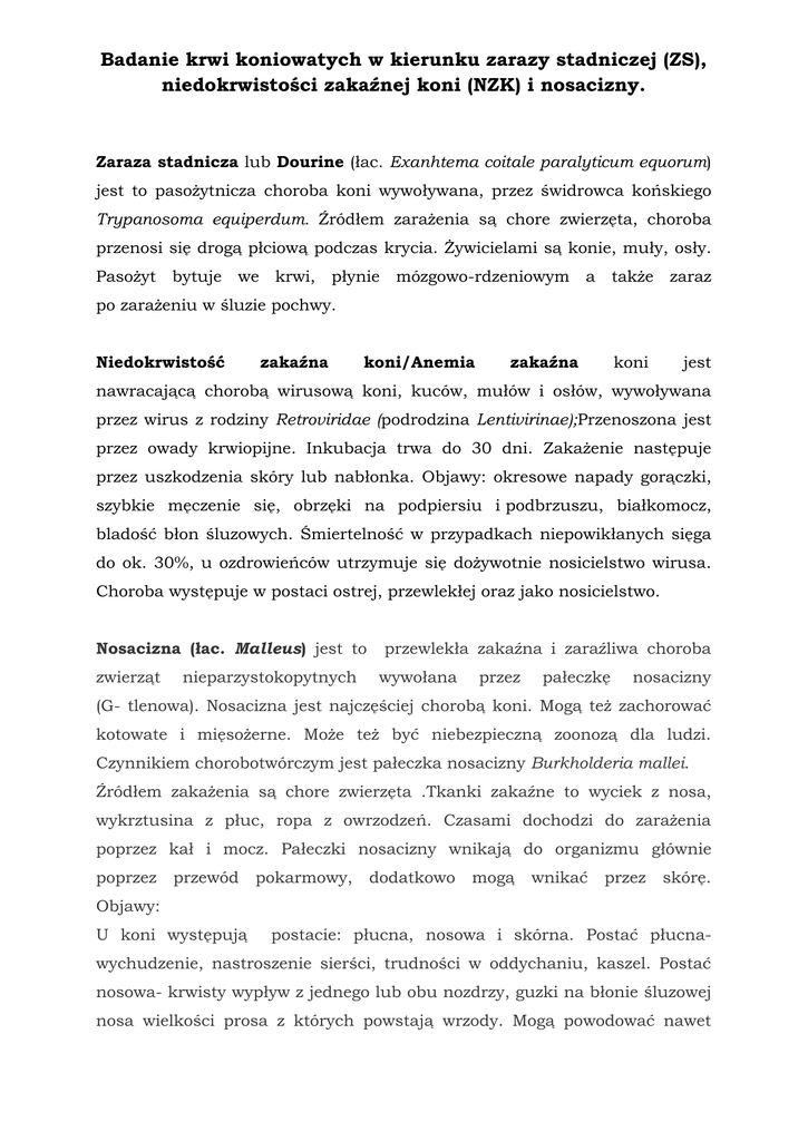 Badanie krwi koniowatych w kierunku zarazy stadniczej (ZS), niedokrwistości zakaźnej koni (NZK) i nosacizny. Zaraza stadnicza lub Dourine (łac. Exanhtema coitale paralyticum equorum) jest to pasożytnicza choroba koni wywoływana, przez świdrowca końskiego Trypanosoma equiperdum. Źródłem zarażenia są chore zwierzęta, choroba przenosi się drogą płciową podczas krycia. Żywicielami są konie, muły, osły. Pasożyt bytuje we krwi, płynie mózgowo-rdzeniowym a także zaraz po zarażeniu w śluzie pochwy. Niedokrwistość zakaźna koni/Anemia zakaźna koni jest nawracającą chorobą wirusową koni, kuców, mułów i osłów, wywoływana przez wirus z rodziny Retroviridae (podrodzina Lentivirinae);Przenoszona jest przez owady krwiopijne. Inkubacja trwa do 30 dni. Zakażenie następuje przez uszkodzenia skóry lub nabłonka. Objawy: okresowe napady gorączki, szybkie męczenie się, obrzęki na podpiersiu i podbrzuszu, białkomocz, bladość błon śluzowych. Śmiertelność w przypadkach niepowikłanych sięga do ok. 30%, u ozdrowieńców utrzymuje się dożywotnie nosicielstwo wirusa. Choroba występuje w postaci ostrej, przewlekłej oraz jako nosicielstwo. Nosacizna (łac. Malleus) jest to zwierząt nieparzystokopytnych przewlekła zakaźna i zaraźliwa choroba wywołana przez pałeczkę nosacizny (G- tlenowa). Nosacizna jest najczęściej chorobą koni. Mogą też zachorować kotowate i mięsożerne. Może też być niebezpieczną zoonozą dla ludzi. Czynnikiem chorobotwórczym jest pałeczka nosacizny Burkholderia mallei. Źródłem zakażenia są chore zwierzęta .Tkanki zakaźne to wyciek z nosa, wykrztusina z płuc, ropa z owrzodzeń. Czasami dochodzi do zarażenia poprzez kał i mocz. Pałeczki nosacizny wnikają do organizmu głównie poprzez przewód pokarmowy, dodatkowo mogą wnikać przez skórę. Objawy: U koni występują postacie: płucna, nosowa i skórna. Postać płucna- wychudzenie, nastroszenie sierści, trudności w oddychaniu, kaszel. Postać nosowa- krwisty wypływ z jednego lub obu nozdrzy, guzki na błonie śluzowej nosa wielkości prosa z których powstają wrzody. Mogą powodować nawet perforację przegrody nosowej Postać skórna - guzki które po osiągnięciu wielkości orzecha włoskiego pękają i przeobrażają się we wrzody. Opisane postacie mogą występować jednocześnie. Choroba może mieć przebieg ostry (Temperatura ciała ponad 40°C. Guzki i wrzody na błonie śluzowej nosa, wypływ z nosa najpierw śluzowo - ropny potem krwisty, silny obrzęk węzłów chłonnych żuchwowych) lub przewlekły. Metodyka badań: Pracownia Badań Serologicznych i Wirusologicznych stosuje do wykrywania opisanych schorzeń metody wskazane stosownymi przepisami Na wszystkie z metod posiada akredytację Polskiego Centrum Akredytacji. Zaraza Stadnicza (ZS): Obecność specyficznych przeciwciał przeciwko Trypanosoma equiperdum - odczynem wiązania dopełniacza (OWD) NZK: Obecność specyficznych przeciwciał przeciwko wirusowi niedokrwistości zakaźnej koni testem immunodyfuzji w żelu agarowym (AGID) - testem Cogginsa. Nosacizna (NS): Obecność specyficznych przeciwciał przeciwko Burkholderia mallei - odczynem wiązania dopełniacza (OWD) Zasady pobierania próbek: Objętość krwi nie mniejsza niż 10 ml. Do badań używa się surowicy krwi, zatem próbka nie może być w stanie hemolizy. Do próbki należy załączyć skierowanie do badań/protokół pobrania próbek według następującego wzoru: PDF Próbki należy oznakować tak, aby możliwa była szczegółowa identyfikacja badanego zwierzęcia. Próbki do badań laboratoryjnych przyjmowane są od poniedziałku do piątku w godzinach od 08:00 - 15:00. KOSZTY BADAŃ: Badanie koni w kierunku zarazy stadniczej (OWD): 72,00 zł. brutto Badanie koni w kierunku nosacizny (OWD): 35,00 zł. brutto Badanie koni metodą Cogginsa w kierunku NZK: 60,00 zł. brutto Badanie koni w kierunku NS, ZS, NZK (łącznie): 135,00 zł. brutto KONTAKT: Zakład Higieny Weterynaryjnej w Krakowie Pracownia Badań Serologicznych i Wirusologicznych Kierownik: lek. wet. Magdalena Marcinek ul. Brodowicza 13 B 30-965 Kraków 69 Telefon: (12) 293 10 66 Adres e-mail: [email protected] Powyższa oferta ma charakter informacyjny i nie stanowi oferty handlowej w rozumieniu art. 66 §1 kodeksu cywilnego oraz innych właściwych przepisów prawnych.