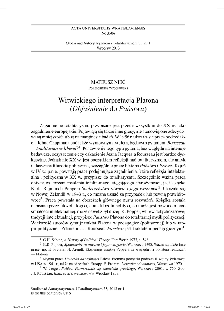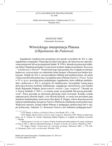 ACTA UNIVERSITATIS WRATISLAVIENSIS No 3506 Studia nad Autorytaryzmem i Totalitaryzmem 35, nr 1 Wrocław 2013 MATEUSZ NIEĆ Politechnika Wrocławska Witwickiego interpretacja Platona (Objaśnienie do Państwa) Zagadnienie totalitaryzmu przypisane jest przede wszystkim do XX w. jako zagadnienie europejskie. Pojawiają się także inne głosy, ale stanowią one zdecydowaną mniejszość lub są na marginesie badań. W 1956 r. ukazała się praca pod redakcją Johna Chapmana pod jakże wymownym tytułem, będącym pytaniem: Rousseau — totalitarian or liberal?1. Postawienie tego typu pytania, bez względu na intencje badawcze, oczyszczenie czy oskarżenie Jeana Jacques’a Rousseau jest bardzo dyskusyjne. Jednak nie XX w. jest początkiem refleksji nad totalitaryzmem, ale antyk i klasyczna filozofia polityczna, szczególnie prace Platona Państwo i Prawa. To już w IV w. p.n.e. powstają prace podejmujące zagadnienia, które refleksja intelektualna i polityczna w XX w. przypisze do totalitaryzmu. Szczególnie ważną pracą dotyczącą korzeni myślenia totalitarnego, sięgającego starożytności, jest książka Karla Rajmunda Poppera Społeczeństwo otwarte i jego wrogowie2. Ukazała się w Nowej Zelandii w 1943 r., co można uznać za przypadek lub pewną prawidłowość3. Praca powstała na obrzeżach głównego nurtu rozważań. Książka została napisana przez filozofa logiki, a nie filozofa polityki, co może jest powodem jego śmiałości intelektualnej, może nawet zbyt dużej. K. Popper, wbrew dotychczasowej tradycji intelektualnej, przypisze Państwo Platona do totalitarnej myśli politycznej. Większość autorów sytuuje traktat Platona w pedagogice (politycznej) lub w utopii politycznej. Zdaniem J.J. Rousseau Państwo jest traktatem pedagogicznym4. 1 G.H. Sabine, A History of Political Theory, Fort Worth 1973, s. 548. K.R. Popper, Społeczeństwo otwarte i jego wrogowie, Warszawa 1993. Ważne są także inne prace, np. E. Fromm, H. Arendt. Eksponuję książkę Poppera ze względu na bohatera rozważań — Platona. 3 Słynna praca Ucieczka od wolności Ericha Fromma powstała podczas II wojny światowej w USA w 1941 r., także na obrzeżach Europy, E. Fromm, Ucieczka od wolności, Warszawa 1970. 4 W. Jaeger, Paidea. Formowanie się człowieka greckiego, Warszawa 2001, s. 770. Zob. J.J. Rousseau, Emil, czyli o wychowaniu, Wrocław 1955. 2 Studia nad Autorytaryzmem i Totalitaryzmem 35, 2013 nr 1 © for this edition by CNS SnAiT.indb 67 2013-08-27 11:20:48 68 Mateusz Nieć Natomiast w ocenie konserwatywnego intelektualisty George’a Sabine’a Państwo Platona, tłumaczone na język angielski jako Republika — co nie jest tylko propozycją semantyczną, ale także ideologiczną — jest traktatem o cnocie politycznej5. W ocenie K. Poppera państwo Platońskie w XX w. przestało być utopią, a stało się realnością dla Niemców i mieszkańców Związku Radzieckiego. Platon odczytany na nowo u progu współczesności przez Georga Friedricha Wilhelma Hegla, zdaniem neoliberalnych krytyków jenajskiego filozofa (A. Hayek), zaczadził umysły ludzkie, głównie intelektualistów, dla których pochód ducha (absolut) przez dzieje zastąpił eschatologię chrześcijańską6. Historia ludzkości obrała immanentny cel, co miało być przyczyną pojawienia się totalitarnego myślenia w polityce. W opinii wybitnego polskiego noblisty Czesława Miłosza7, podzielającego w tym względzie opinię Poppera, w Polsce nastąpiło prawie że śmiertelne ukąszenie intelektualistów — najpierw Heglowskie, następnie Marksowskie. Później podobny sąd sformułuje w Opium intelektualistów Raymond Aron8. Miłosz w Zniewolonym umyśle dał wspaniały opis intelektualnego i duchowego przeistoczenia polskich intelektualistów, związanych na początku kariery z ruchem narodowym (Konstanty Ildefons Gałczyński, Jerzy Andrzejewski). W ogóle proces przeistoczenia intelektualnego (słowo „przeistoczenie”, jak najbardziej adekwatne, oddaje religijne konotacje9) dotyczy głównie ruchu narodowego, który należałoby moim zdaniem precyzyjniej określać jako ruch nacjonalistyczny. W I połowie XX w. mamy do czynienia z nacjonalistycznymi demokracjami (liczba mnoga obowiązkowa) i analogicznie — faszyzmami, politycznymi stylami myślenia (i praktykami), budowanymi na gruncie zróżnicowanych i odmiennych tożsamości kulturowych. I Pierwszą bardzo znaczącą pracą sytuującą się w prawicowym totalitaryzmie jest Państwo Platona, traktat polityczny, który powstawał w kilku okresach. Najpierw, w okresie sokratycznym, została napisana I księga Państwa, podejmująca zagadnienie sprawiedliwości i niesprawiedliwości, zagadnienia etyczne charakterystyczne dla filozofii społecznej Sokratesa10. Następnie, po kilkuna5 G.H. Sabine, op. cit., s. 53. G.F.W. Hegel, Fenomenologia ducha, Warszawa 2002. 7 C. Miłosz, Zniewolony umysł, Warszawa 1989. 8 R. Aron, Opium intelektualistów, Warszawa 2000. 9 Przeistaczać — „zmieniać kogoś, coś gruntownie, czynić innym (zwykle lepszym) niż poprzednio: przemieniać, przekształcać, przeobrażać”, Słownik języka polskiego, red. M. Szymczak, t. 2, Warszawa 1990, s. 974. 10 Z okresu sokratycznego, najwcześniejszego pochodzą: Protagoras, Gorgiasz, Obrona Sokratesa, Laches, Eutyfron i Charmides. 6 Studia nad Autorytaryzmem i Totalitaryzmem 35, 2013 nr 1 © for this edition by CNS SnAiT.indb 68 2013-08-27 11:20:48 Witwickiego interpretacja Platona (Objaśnienie do Państwa) 69 stoletniej przerwie, w okresie konstrukcyjnym powstało pozostałych 9 ksiąg. W okresie konstrukcyjnym, jak nazwa wskazuje, Platon budował własne teorie polityczne, filozoficzne, uwolnił się intelektualnie od swojego Mistrza, zdobył samodzielność intelektualną, uzyskał autonomię twórczą. Zdaniem Władysława Tatarkiewicza dialogi okresu konstrukcyjnego są najbogatsze artystycznie i mają najwięcej polotu poetyckiego11. Omówieniu myśli filozoficznej 