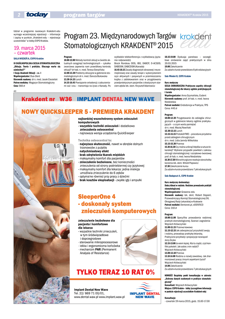 2 Udział w programie naukowym Krakdent-edu wymaga wcześniejszej rejestracji – informacje i zapisy w punkcie „Krakdent-edu – rejestracja uczestników” w lobby EXPO Kraków. 19. marca 2015 – czwartek SALA WIEDEŃ A, EXPO Kraków IV OGÓLNOPOLSKA SESJA STOMATOLOGICZNA „Okluzja. Teoria i praktyka. Dlaczego warto się uśmiechać?” I Sesja Akademii Okluzji – cz. I Współorganizator: Duo-Dent Kierownik naukowy: dr n. med. Jacek Ciesielski Patron medialny: Magazyn Stomatologiczny Cena: 560 zł AD program targów KRAKDENT® Kraków 2015 Program 23. Międzynarodowych Targów Stomatologicznych KRAKDENT® 2015 Program: 10.00-12.00 Metody kontroli okluzji w świetle aktualnych osiągnięć technologicznych – cykalka zwarciowa zapewnia nam prawidłową kontrolę okluzji? dr hab. n. med. Teresa Sierpińska 12.00-13.30 Problemy okluzyjne w gabinecie stomatologicznym dr n. med. Danuta Bukowska 13.30-14.15 Lunch 14.15-16.45 Powiązanie ortodoncji z zaburzeniami ssż i snu – transmisja na żywo z Kanady. Po wykładzie telekonferencja z wykładowcą (pytania i odpowiedzi) Brock Rondeau DDS, IBO, DABCP, D-ACSDD, DABDSM, DABCDSM (Kanada) 16.45-18.15 Zasady diagnostyki obrazowej i neuromięśniowej oraz zasady terapii z wykorzystaniem szyn aktywnych i pasywnych w przemieszczeniu krążka z zablokowaniem oraz w przygotowaniu przedprotetycznym pacjentów z drastycznym starciem zębów lek. stom. Krzysztof Adamowicz 18.15-19.00 Dyskusja panelowa – szczegółowe omówienie zajęć praktycznych w dniu 20.03.2015 19.00 Zakończenie Za udział w kursie przewidziano 8 pkt edukacyjnych Sala Wiedeń B, EXPO Kraków Kurs medyczny SESJA CHIRURGICZNA Praktyczne aspekty chirurgii stomatologicznej dla lekarzy ogólnie praktykujących I termin Współorganizator: Anna Szymańska, Esdent Kierownik naukowy: prof. dr hab. n. med. Iwona Niedzielska Patroni medialni: Endodoncja w Praktyce, TPS Cena: 440 zł Program: 10.00-12.30 Przygotowanie do zabiegów chirurgicznych w gabinecie lekarzy ogólnie praktykujących – o czym warto pamiętać dr n. med. Maciej Nowiński 12.30-13.15 Lunch 13.15-15.15 Protokół FMD – procedura przydatna przed zabiegiem chirurgicznym dr n. med. Lidia Jamróz-Wilkońska 15.15-15.30 Przerwa 15.30-16.30 Czy można uniknąć błędów w sztuce lekarskiej? Wybrane przypadki powikłań z zakresu chirurgii stomatologicznej i szczękowo-twarzowej prof. dr hab. n. med. Iwona Niedzielska 16.30-17.30 Mikrochirurgiczne resekcje wierzchołka korzenia lek. dent. Witold Popowicz 17.30 Zakończenie kursu Za udział w kursie przewidziano 7 pkt edukacyjnych Sala Budapeszt A, EXPO Kraków Kurs medyczny doskonalący Dobry klimat w rodzinie. Rodzinne prowadzenie praktyki stomatologicznej Współorganizator: Grawena-edu Kierownik naukowy: lek. dent. Robert Stępień, Przewodniczący Komisji Stomatologicznej OIL Okręgowej Rady Lekarskiej w Krakowie Patroni medialni: Dentonet.pl, eDENTICO Cena: 310 zł Program: 10.00-11.00 Specyfika prowadzenia rodzinnej praktyki stomatologicznej. Szanse i zagrożenia Wojciech Krówczyński 11.00-11.15 Przerwa kawowa 11.15-12.15 Jak zabezpieczyć przyszłość swoją i rodziny, prowadząc praktykę lekarską. Praktyczne przykłady i propozycje rozwiązań Jerzy Gryko 12.15-13.00 Ja wiem lepiej. Kto tu rządzi, czyli konflikt pokoleń. Jak sobie z nim radzić? Wojciech Krówczyński 13.00-13.10 Przerwa 13.10-14.00 Rodzina a rozwój zawodowy. Jak zharmonizować pracę z innymi aspektami życia? Wojciech Krówczyński 14.00 Zakończenie Za udział w kursie przewidziano 7 pkt edukacyjnych NOWOŚĆ! Bezpłatny punkt konsultacyjny w zakresie: „Ochrona danych osobowych w praktyce stomatologicznej” Konsultant: Wojciech Krówczyński Miejsce: EXPO Kraków – lobby (szczegółowe informacje w punkcie rejestracji uczestników Krakdent-edu) Konsultacje: - czwartek 19 marca 2015, godz. 15.00-17.00 program targów KRAKDENT® Kraków 2015 - piątek i sobota, 20-21 marca 2015, godz. 10.00-17.00 Zapisy: w punkcie konsultacyjnym podczas targów. Zakres konsultacji dotyczy: - opracowania wymaganej dokumentacji ochrony danych osobowych - wdrożenia Polityki Bezpieczeństwa i związanych z nią procedur - zarządzania bezpieczeństwem danych (działania kontrolne i zapobiegawcze) - przygotowania praktyki do kontroli GIODO lub Państwowej Inspekcji Pracy. Sala A, Krakowska Medyczna Szkoła Policealna im. S. Leszczyńskiej w Krakowie, ul. Zamoyskiego 58 Warsztat praktyczny nr 1 – dla techników dentystycznych Odbudowa siekacza w oparciu o bloczek VITA Suprinity (szkło litowe wzmocnione cyrkonem) charakteryzowany ceramiką VITA VM11 Godz. 10.00-15.00 Współorganizator: Polskie Towarzystwo Techników Dentystycznych VITA ZahnFabrik Bad Säckingen Niemcy Prowadzący: VML tech. dent. Urszula Młynarska, autoryzowany instruktor VITA Zahnfabrik Sponsor: VITA Cena: 180 zł liczba miejsc: 10 osób protezy całkowitej szczęki lub żuchwy z ustawionymi zębami sztucznymi w wosku i wymodelowaną płytą oraz o posiadanie obuwia ochronnego. 20. marca 2015 – piątek Sala Wiedeń A, EXPO Kraków Kurs medyczny Sesja periodontologiczna Współorganizator: Anna Szymańska, Esdent Kierownik naukowy: prof. dr n. med. Anton Sculean Patroni medialni: DENTONET.pl, Endodoncja w praktyce, TPS Cena: 650 zł Program: 10.00-11.00 Biologiczne podstawy regeneracji prof. Dieter Bosshardt, Szwajcaria 11.00-12.00 Chirurgia plastyczna przyzębia: techniki, wskazania i ostatnie trendy prof. dr Sofia Aroca, Francja 12.00-12.45 Lunch 12.45-14.15 Różne techniki pokrywania recesji prof. dr n. med. Anton Sculean, Szwajcaria 14.15-15.45 Kluczowe czynniki mające wpływ na wybór terapii w plastyczno-estetycznej chirurgii tkanek miękkich – czynniki ryzyka i niepowodzenia dr med. dent. Arkadiusz Kuczek, Niemcy 15.45-16.00 Przerwa 16.00-17.30 Współpraca periodontologiczno-ortodontyczna. Wspólne cele, obopólne korzyści, interdyscyplinarny sukces. Nowoczesne rozwiązania ortodontyczne w rozwiązywaniu problem