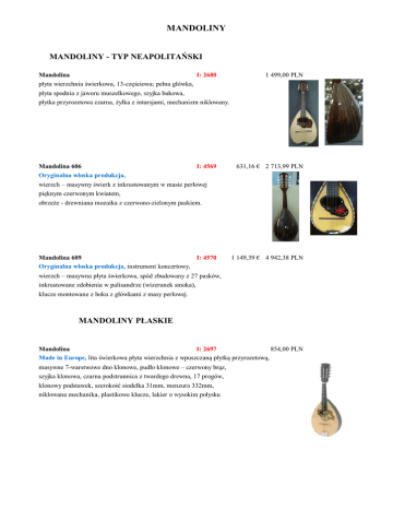 MANDOLINY MANDOLINY - TYP NEAPOLITAŃSKI Mandolina I: 2680 1 499,00 PLN płyta wierzchnia świerkowa, 13-częściowa; pełna główka, płyta spodnia z jaworu muszelkowego, szyjka bukowa, płytka przyrozetowa czarna, żyłka z intarsjami, mechanizm niklowany. Mandolina 606 Oryginalna włoska produkcja, I: 4569 631,16 € 2 713,99 PLN wierzch – masywny świerk z inkrustowanym w masie perłowej pięknym czerwonym kwiatem, obrzeże - drewniana mozaika z czerwono-zielonym paskiem. Mandolina 609 I: 4570 Oryginalna włoska produkcja, instrument koncertowy, 1 149,39 € 4 942,38 PLN wierzch – masywna płyta świerkowa, spód zbudowany z 27 pasków, inkrustowane zdobienia w palisandrze (wizerunek smoka), klucze montowane z boku z główkami z masy perłowej. MANDOLINY PŁASKIE Mandolina I: 2697 854,00 PLN Made in Europe, lita świerkowa płyta wierzchnia z wpuszczaną płytką przyrozetową, masywne 7-warstwowe dno klonowe, pudło klonowe – czerwony brąz, szyjka klonowa, czarna podstrunnica z twardego drewna, 17 progów, klonowy podstawek, szerokość siodełka 31mm, menzura 332mm, niklowana mechanika, plastikowe klucze, lakier o wysokim połysku MANDOLINY Mandolina 701S I: 4564 193,59 € 832,44 PLN Oryginalna włoska produkcja, instrument z pracowni lutniczej Alfio Leone, wierzch – świerk, proste zdobienia, ozdobny strunociąg, klucze montowane od przodu MANDOLINY – TYP PORTUGALSKI Mandolina I: 5210 999,00 PLN Made in Europe, lita świerkowa płyta wierzchnia z wpuszczaną płytką przyrozetową, lity sklepiony klonowy tył, klonowa główka, podstrunnica z twardego drewna, 17 progów, klonowy podstawek, szerokość siodełka 31mm, menzura 332mm, lakier o wysokim połysku Mandolina I: 6215 1 399,00 PLN Made in Europe, lita świerkowa płyta wierzchnia z wpuszczaną płytką przyrozetową, spód i boki – orzech włoski, wypukła płyta spodnia z wstawkami w kształcie gwiazdki z drzewa klonowego i orzecha włoskiego, szyjka klonowa, podstrunnica z drzewa akacjowego, 19 progów – nowe srebro z progiem 0, szerokość siodełka 31mm, menzura 332mm, lakier jedwabno-matowy. Mandolina I: 2698 1 520,00 PLN Made in Europe, płyta wierzchnia świerkowa, płyta przyrozetowa – tworzywo, boki jaworowe, wypukła płyta spodnia jaworowa/orzechowa, 7-częściowa, dwukolorowa, szyjka mahoniowa, podstrunnica palisandrowa z progiem 0, mechanika chromowana. MANDOLINY AKUSTYCZE Mandolina TENNESSE FOLK z futerałem I: 2702 Made in Europe, Model Economy A-1 F-Hole Sunburst z futerałem płyta wierzchnia świerkowa, spód i boki, oraz szyjka – mahoń, postrunnica oprawiona palisandrowa z 20 srebrnymi progami, mostek palisandrowy, regulowana wysokość, mechanika chromowana, oryginalne struny D'Addario, lakier mat. 1 147,00 PLN Mandolina TENNESSE z futerałem I: 4983 2 069,00 PLN Made in Europe, lity top świerkowy, otwory-F, spód i boki klonowe, podpalane. Oprawiona podstrunnica palisandrowa, 24 progi z nowego srebra, wkładki Snowflake Mostek palisander, regulowana wysokość, potrójna krawędź topu, pojedyncza spodu Pozłacana mechanika z główkami z perloidu, Vintage Sunburst- wysoki połysk. Instrument z futerałem MANDOLINY MANDOLINY ELEKTRO-AKUSTYCZNE Mandolina Tenson A1 I: 5845 527,00 PLN Made in Europe, Świerkowa płyta wierzchnia, zamknięta, owalny otwór rezonansowy. Spód i boki lipa, kolor czarny, oprawiona podstrunnica palisandrowa, 24 progi z nowego srebra, menzura 350 mm, szerokość siodełka 43 mm. Krawędzie Topu 5-warstwowe, spodu 1-warstwowe, chromowana mechanika, podstawek palisandrowy, przestawna wysokość. Lakier o wysokim połysku, pokrowiec z szelkami i kieszenią na akcesoria. Mandolina Tenson A-1E I: 5844 743,00 PLN Made in Europe, model elektro-akustyczny, płyta wierzchnia świerkowa, zamknięta, otwory-f, płyta spodnia i boki klonowe, lakierowane, podpalane, podstrunnica palisandrowa oprawiona z 20 srebrnymi progami, podstawek palisandrowy, regulowana wysokość, magnetyczny pickup, regulator dźwięku i głosu, pokrowiec z szelkami i kieszenią na akcesoria.