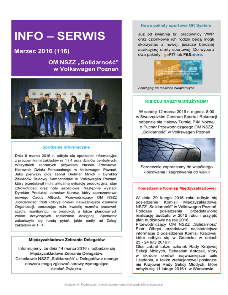 Nowe pakiety sportowe OK System INFO – SERWIS Marzec 2016 (116) Już od kwietnia br. pracownicy VWP oraz członkowie ich rodzin będą mogli skorzystać z nowej, jeszcze bardziej atrakcyjnej oferty sportowej. Do wyboru dwa pakiety: goFIT lub Fit&more. OM NSZZ „Solidarność” w Volkswagen Poznań Szczegóły na tablicach związkowych. KIBICUJ NASZYM DRUŻYNOM! W sobotę 12 marca 2016 r. o godz. 8:00 w Swarzędzkim Centrum Sportu i Rekreacji odbędzie się Halowy Turniej Piłki Nożnej o Puchar Przewodniczącego OM NSZZ „Solidarność” w Volkswagen Poznań. Spotkanie informacyjne Dnia 8 marca 2016 r. odbyło się spotkanie informacyjne z pracownikami zakładów nr 1 i 4 oraz działów centralnych. Wszystkich zebranych przywitała Nassia Zdravkova, Kierownik Działu Personalnego w Volkswagen Poznań. Jako pierwszy głos zabrał Dietmar Mnich - Dyrektor Zakładów Budowy Samochodów w Volkswagen Poznań, który przedstawił m.in. aktualną sytuację produkcyjną, stan zdrowotności oraz noty jakościowe. Następnie wystąpił Dyrektor Produkcji Jarosław Kurosz, który zaprezentował nowego Caddy Alltrack. Przewodniczący OM NSZZ „Solidarność” Piotr Olbryś omówił najważniejsze działania Organizacji, poruszając m.in. kwestię rozmów pracowniczych, monitoringu na produkcji, a także planowanych zmian dotyczących rozliczania delegacji. Spotkanie zakończyło się rundą pytań, jakie padły od Załogi zakładów nr 1 i 4. Międzyzakładowe Zebranie Delegatów Informujemy, że dnia 14 marca 2016 r. odbędzie się Międzyzakładowe Zebranie Delegatów. Członkowie NSZZ „Solidarność” u Delegatów z danego obszaru mogą zgłaszać sprawy wymagające działań Związku. Serdecznie zapraszamy do wspólnego kibicowania i zagrzewania do walki! Posiedzenie Komisji Międzyzakładowej W dniu 29 lutego 2016 roku odbyło się posiedzenie Komisji Międzyzakładowej NSZZ „Solidarność” w Volkswagen Poznań. Podczas posiedzenia przedstawiono realizację budżetu w 2015 roku i przyjęto plan budżetowy na rok 2016. Przewodniczący OM NSZZ „Solidarność” Piotr Olbryś przedstawił najistotniejsze informacje z posiedzenia Komisji Krajowej, które odbyło się w Gdańsku w dniach 23 - 24 luty 2016 r. Głos zabrał także członek Rady Krajowej Sekcji Młodych, Sebastian Antczak, który w skrócie omówił najważniejsze cele i zadania, a także zrelacjonował posiedzenie Krajowej Rady Sekcji Młodych, które odbyło się 11 lutego 2016 r. w Warszawie. Kontakt: M. Frydryszak, e-mail: [email protected]