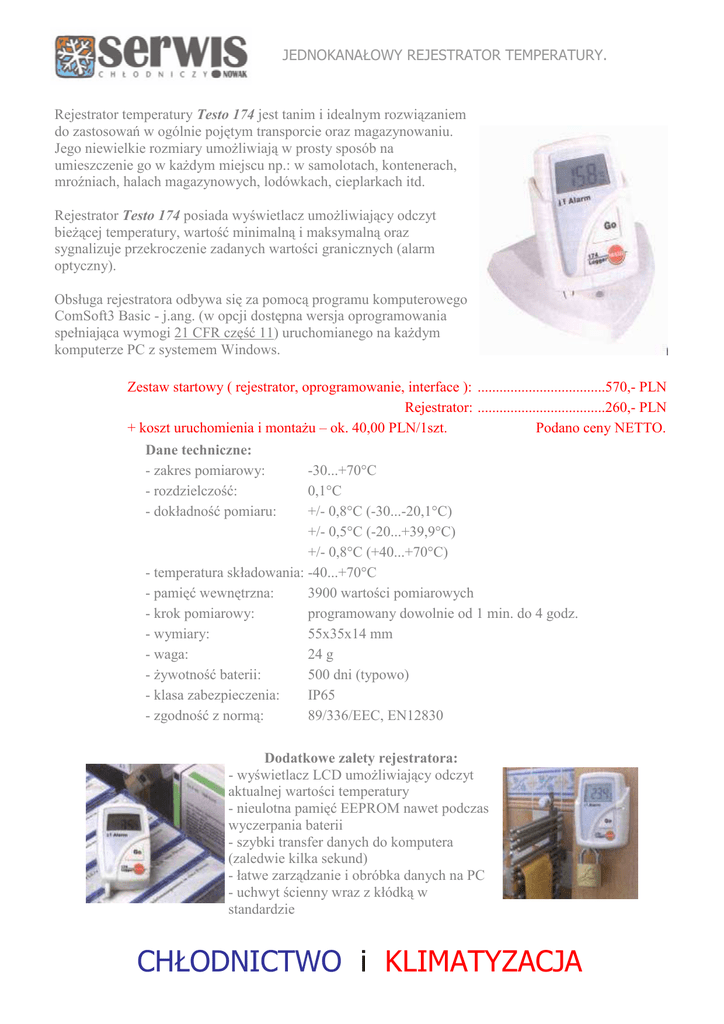 JEDNOKANAŁOWY REJESTRATOR TEMPERATURY. Rejestrator temperatury Testo 174 jest tanim i idealnym rozwiązaniem do zastosowań w ogólnie pojętym transporcie oraz magazynowaniu. Jego niewielkie rozmiary umoŜliwiają w prosty sposób na umieszczenie go w kaŜdym miejscu np.: w samolotach, kontenerach, mroźniach, halach magazynowych, lodówkach, cieplarkach itd. Rejestrator Testo 174 posiada wyświetlacz umoŜliwiający odczyt bieŜącej temperatury, wartość minimalną i maksymalną oraz sygnalizuje przekroczenie zadanych wartości granicznych (alarm optyczny). Obsługa rejestratora odbywa się za pomocą programu komputerowego ComSoft3 Basic - j.ang. (w opcji dostępna wersja oprogramowania spełniająca wymogi 21 CFR część 11) uruchomianego na kaŜdym komputerze PC z systemem Windows. Zestaw startowy ( rejestrator, oprogramowanie, interface ): ...................................570,- PLN Rejestrator: ...................................260,- PLN + koszt uruchomienia i montaŜu – ok. 40,00 PLN/1szt. Podano ceny NETTO. Dane techniczne: - zakres pomiarowy: - rozdzielczość: - dokładność pomiaru: -30...+70°C 0,1°C +/- 0,8°C (-30...-20,1°C) +/- 0,5°C (-20...+39,9°C) +/- 0,8°C (+40...+70°C) - temperatura składowania: -40...+70°C - pamięć wewnętrzna: 3900 wartości pomiarowych - krok pomiarowy: programowany dowolnie od 1 min. do 4 godz. - wymiary: 55x35x14 mm - waga: 24 g 500 dni (typowo) - Ŝywotność baterii: - klasa zabezpieczenia: IP65 - zgodność z normą: 89/336/EEC, EN12830 Dodatkowe zalety rejestratora: - wyświetlacz LCD umoŜliwiający odczyt aktualnej wartości temperatury - nieulotna pamięć EEPROM nawet podczas wyczerpania baterii - szybki transfer danych do komputera (zaledwie kilka sekund) - łatwe zarządzanie i obróbka danych na PC - uchwyt ścienny wraz z kłódką w standardzie CHŁODNICTWO i KLIMATYZACJA