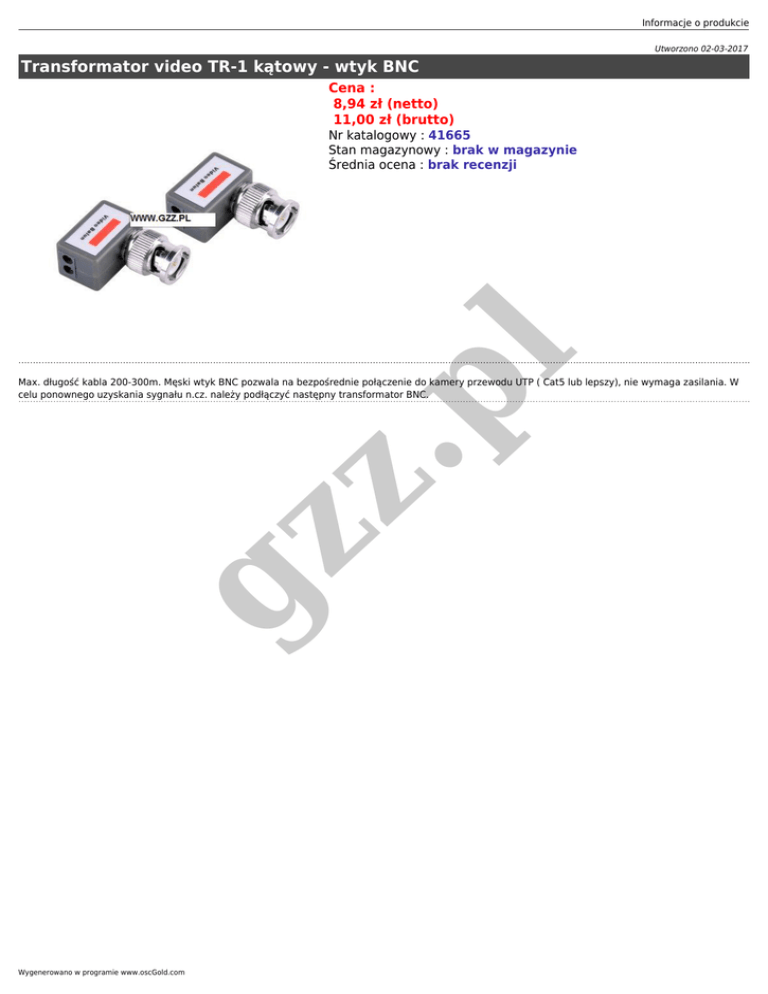 Informacje o produkcie Utworzono 02-03-2017 Transformator video TR-1 kątowy - wtyk BNC Cena : 8,94 zł (netto) 11,00 zł (brutto) .p l Nr katalogowy : 41665 Stan magazynowy : brak w magazynie Średnia ocena : brak recenzji gz z Max. długość kabla 200-300m. Męski wtyk BNC pozwala na bezpośrednie połączenie do kamery przewodu UTP ( Cat5 lub lepszy), nie wymaga zasilania. W celu ponownego uzyskania sygnału n.cz. należy podłączyć następny transformator BNC. Wygenerowano w programie www.oscGold.com