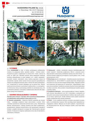 URZĄDZENIA DO PIELĘGNACJI TERENÓW ZIELENI U TRZYMAN IE O B IEKTÓW, SYSTE M Y N AWA D N I A JĄC E, O DWO D N I E N I A HUSQVARNA POLAND Sp. z o.o. ul. Wysockiego 15B, 03-371 Warszawa tel. 22 330 96 00 www.husqvarna.pl e-mail: [email protected] O FIRMIE Firma HUSQVARNA to lider w branży produkującej profesjonalne Wykaszarki – solidne, niezawodne maszyny charakteryzujące się maszyny do pielęgnacji lasów, ogrodów, parków – terenów zieleni. małym ciężarem i doskonałą wydajnością. Mocne i poręczne posia- Husqvarna to jedna z najstarszych na świecie firm i marek, obecna na dają specjalnie opracowaną przekładnię kątową oraz silnik X-Torq®, co rynku od 1689 roku. Aktualnie szeroka oferta katalogowa obejmuje oznacza wysokie osiągi przy zmniejszeniu zużycia paliwa o 20% i emisji produkty sklasyfikowane w wiele kategorii m.in.: pilarki, wykaszarki, zanieczyszczeń o 60%. wycinarki, kosiarki, odśnieżarki, ridery, traktory ogrodowe, nożyce do Dmuchawy (ręczne i plecakowe) – charakteryzują się nowoczesnymi żywopłotów, osprzęt, odzież i sprzęt ochronny oraz inne specjalistyczne rozwiązaniami np.: silnik E-TECH® II, wysoka ergonomia, dźwignia gazu maszyny do pielęgnacji terenów zieleni. Ponad 325-letnie doświadcze- mocowana na rurze oraz technologia niskiego hałasu. Regularna opieka nie i nowatorstwo to czynniki składające się na sukces firmy. Równie nad maszynami jest gwarancją ich sprawności, maksymalizacji czasu ważna jest koncentracja na potrzebach użytkowników, a w szczególno- pracy bez przestojów i dodatkowo pozwala utrzymać koszty eksploatacji ści fachowców, którzy wykorzystują produkty do zawodowej pracy. Ich na stałym poziomie. Znika problem niespodziewanych kosztów napraw oczekiwania związane z oszczędną i wydajną pracą stanowią siłę napę- i wymiany części. dową rozwoju firmy Husqvarna. Urządzenia bateryjne – seria wysokowydajnych maszyn napędzanych mocnym akumulatorem Li-on 36 V. Akumulator w połączeniu ze ZAKRES DZIAŁALNOŚCI I OFERTA specjalnie opracowanym bezszczotkowym silnikiem daje wyniki podob- Szeroka gama maszyn i osprzętu, które pozwolą profesjonalistom ne do maszyn spalinowych. Źródło zasilania można szybko wymieniać na maksymalne wykorzystanie czasu pracy to m.in.: między urządzeniami aby uniknąć przestojów. Kosiarki samojezdne – klasyczne traktorki ogrodowe jak również Pilarki – w tym urządzenia z górnym uchwytem oraz pilarki na wysię- ridery – posiadają urządzenie tnące zamocowane z przodu, które gniku, to profesjonalne maszyny, które sprostają nawet najbardziej wy- umożliwia operatorowi doskonałą kontrolę terenu pracy. Niezrównana magającemu zadaniu. Maszyny są nie tylko wydajnie i ergonomicznie, łatwość manewrowania i obsługi uzyskana jest dzięki wyjątkowemu, ale skonstruowane tak, aby przy mniejszym wysiłku, praca była łatwa przegubowemu układowi kierowniczemu oraz zgrupowaniu wszystkich i przyjemna. dźwigni i urządzeń sterujących w zasięgu ręki. Szeroka gama osprzętu sprawia, iż maszyny te mogą być użytkowane przez cały rok (sprzątanie, odśnieżanie, transport). 2 2015 husqvarna.ibiss.pl
