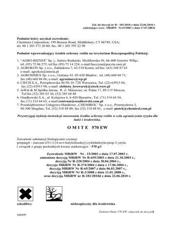 Zał. do decyzji nr R - 181/2010 z dnia 22.06.2010 r. zmieniające zezw. MRiRW Nr15/2003 z dnia 17.07.2003r Podmiot który uzyskał zezwolenie: Chemtura Corporation, 199 Benson Road, Middlebury, CT 06749, USA; tel. 00 1 203 573 20 00; fax: 00 1 203 393 22 90 Podmiot wprowadzający środek ochrony roślin na terytorium Rzeczpospolitej Polskiej: 1. “AGRO-BIZNES” Sp. j., Sulorz-Rudnicki, Myśliborska 56, 66-400 Gorzów Wlkp., tel. (95) 72 06 275; tel/fax (95) 73 14 224; e-mail:[email protected] 2. AGROKON Sp. z o.o., Zakładowa 7, 62-510 Konin, tel/fax: (63) 248 87 63 e-mail: [email protected] 3. AGROSIMEX Sp. z o.o., Goliany 43, 05-620 Błędów; tel. (48) 668 04 71; fax (48) 668 04 86; e-mail: [email protected] 4. CIECH S.A., Powązkowska 46/50, 01-728 Warszawa, Tel. (22) 63915 84, fax (22) 63915 98; e-mail: [email protected] 5. JaWal & M Spółka Jawna, R. Z. Murawiec, ul. Polna 17, 89-115 Mrocza, Tel/fax (52) 385 63 36; (52) 385 68 88 6. Osadkowski S.A., ul. Kolejowa 6, 6-420 Bierutów, Tel. (71) 314 64 54; fax (71) 314 64 65; e-mail:[email protected] 7. Przedsiębiorstwo Usługowo-Handlowe „CHEMIROL” Sp. z o.o., Przemysłowa 3, 88-300 Mogilno, Tel. (52) 318 88 00; fax (52) 318 88 01; e-mail: [email protected] Przestrzegaj etykiety-instrukcji stosowania środka ochrony roślin w celu ograniczenia ryzyka dla ludzi i środowiska. O M I T E 570 EW Zawartość substancji biologicznie czynnej: propargit - siarczan (IV) 2-[4-tert-butylofenoksy]-cykloheksylu-prop-2-ynylu ( związek z grupy pochodnych kwasu siarkawego) – 570 g/l Zezwolenie MRiRW Nr . 15/2003 z dnia 17.07.2003 r. zmienione decyzją MRiRW Nr R-655/2003 z dnia 21.10.2003 r., decyzją Nr R-220/2004 z dnia 30.04.2004 r., decyzja MRiRW Nr R-274/2004 z dnia z 17.06.2004 r., decyzją MRiRW Nr R-65/2007 z dnia 06.03.2007 r., decyzją MRiRW Nr R-2/2008 z dnia 11.01.2008 r., oraz decyzją MRiRW nr R-181/2010d z dnia 22.06.2010 r. szkodliwy MRiRW niebezpieczny dla środowiska Etykieta Omite 570 EW, załącznik do decyzji1 Działa szkodliwie po połknięciu Działa drażniąco na oczy i skórę Ograniczone dowody działania rakotwórczego Może powodować uczulenie w kontakcie ze skórą Działa bardzo toksycznie na organizmy wodne, może powodować długo utrzymujące się niekorzystne zmiany w środowisku wodnym. Uwaga! 1. Zabrania się stosowania środka w strefie bezpośredniej ochrony ujęć wody oraz na terenie uzdrowisk, otulin parków narodowych i rezerwatów. 2. Nie zanieczyszczać wód środkiem ochrony roślin lub jego opakowaniem I OPIS DZIAŁANIA Środek roztoczobójczy w formie emulsji (olej w wodzie) do sporządzania wodnej emulsji oleju w wodzie, o działaniu kontaktowym i gazowym, przeznaczony do zwalczania ruchomych form przędziorków, pordzewiaczy oraz roztocza truskawkowca w roślinach sadowniczych. Środka nie stosować do ochrony gruszy, gdyż może uszkadzać liście i owoce. Na roślinie działa powierzchniowo. II ZAKRES STOSOWANIA, TERMINY I DAWKI Środek stosować p r z e m i e n n i e ze środkami należącymi do innych grup chemicznych. Rośliny sadownicze a) jabłoń, śliwa -przędziorek owocowiec, przędziorek chmielowiec oraz inne przędziorki, pordzewiacz jabłoniowy Zalecana dawka: 1,5-2 l/ha Zabieg wykonać po kwitnieniu. Wyższą z zalecanych dawek stosować w przypadku dużego nasilenia szkodnika. b) śliwa - pordzewiacz śliwowy Zalecana dawka: 2 l/ha Zabieg wykonać po kwitnieniu w fazie wzrostu zawiązków. c) porzeczka - przędziorek chmielowiec. Zalecana dawka: 1,5 l/ha. Stosować po zbiorze owoców. MRiRW Etykieta Omite 570 EW, załącznik do decyzji2 d) truskawka - przędziorek chmielowiec Zalecana dawka: 1,5-2 l/ha Środek stosować po zbiorze owoców. Wyższą z zalecanych dawek stosować w przypadku dużego nasilenia szkodnika. - roztocz truskawkowiec Zalecana dawka: 2 l/ha Opryskiwać bezpośrednio po zbiorze i powtórzyć zabieg po 7 dniach. Zalecana ilość wody: drzewa owocowe - 500-750 l/ha, rośliny jagodowe - 500-900 l/ha. UWAGI: 1. Środek działa najskuteczniej w temperaturze powyżej 20°C. 2. Na niektórych odmianach śliw (Prezydent, Cacanska Rana, Amers) mogą wystąpić objawy fitotoksyczności w specyficznych warunkach pogodowych (wysoka wilgotność, stosunkowo niska temperatura). III OKRES KARENCJI: okres od dnia ostatniego zabiegu do dnia zbioru i przeznaczenia do konsumpcji jabłoń, śliwa - 7 dni czarna porzeczka, truskawka (stosowany tylko po zbiorze) – nie dotyczy IV OKRES PREWENCJI DLA PSZCZÓŁ, LUDZI I ZWIERZĄT: okres zapobiegający zatruciu: NIE DOTYCZY V SPORZĄDZANIE CIECZY UŻYTKOWEJ Przed przystąpieniem do sporządzania cieczy użytkowej dokładnie ustalić potrzebną jej ilość. Odmierzoną ilość środka wlać do zbiornika opryskiwacza napełnionego częściowo wodą (z włączonym mieszadłem) i uzupełnić wodą do potrzebnej ilości. Po wlaniu środka do zbiornika opryskiwacza nie wyposażonego w mieszadło hydrauliczne ciecz w zbiorniku mechanicznie wymieszać. Opróżnione opakowania przepłukać trzykrotnie wodą, a popłuczyny wlać do zbiornika opryskiwacza z cieczą użytkową. Po pracy aparaturę dokładnie wymyć. VI PRZECHOWYWANIE Przechowywać wyłącznie w oryginalnym opakowaniu w chłodnym, dobrze wentylowanym miejscu. Przechowywać z dala od źródeł ciepła Nie przechowywać razem z żywnością, napojami i paszami dla zwierząt. Przechowywać pod zamknięciem i chronić przed dziećmi VII WARUNKI BEZPIECZNEGO STOSOWANIA ŚRODKA Nie jeść i nie pić oraz nie palić tytoniu podczas stosowania środka. Unikać zanieczyszczenia skóry i oczu. Nie wdychać rozpylonej cieczy użytkowej. W przypadku zanieczyszczenia oczu przemyć je natychmiast dużą ilością wody z mydłem. Nosić odpowiednią odzież ochronną, odpowiednie rękawice ochronne i okulary lub ochronę MRiRW Etykieta Omite 570 EW, załącznik do decyzji3 twarzy. W przypadku niedostatecznej wentylacji stosować odpowiednie indywidualne środki ochrony dróg oddechowyc