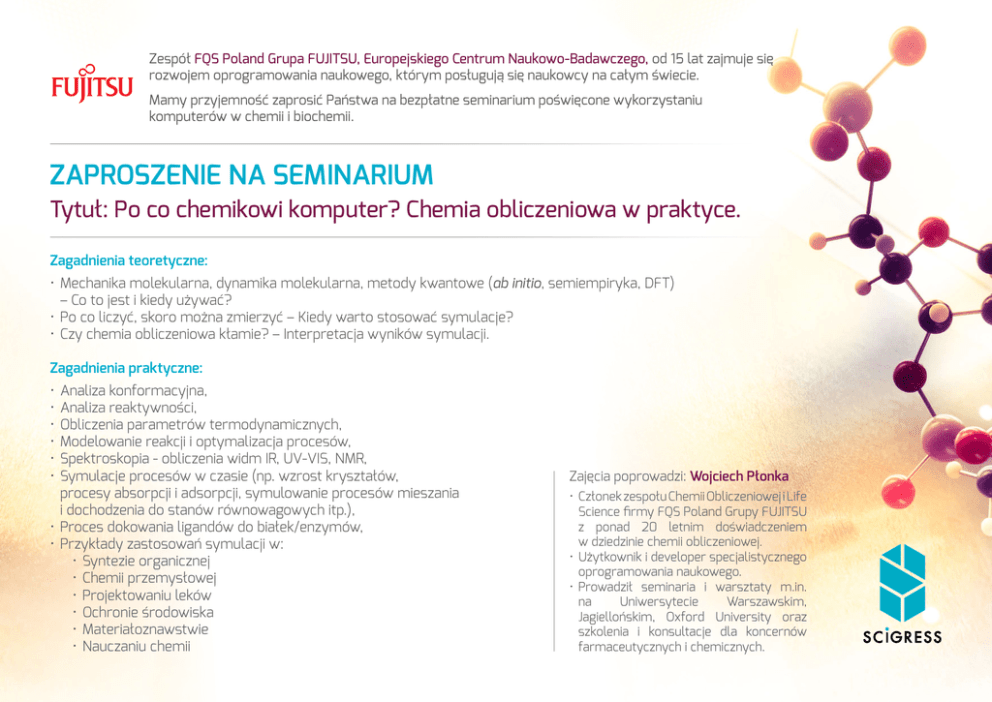 Zespół FQS Poland Grupa FUJITSU, Europejskiego Centrum Naukowo-Badawczego, od 15 lat zajmuje się rozwojem oprogramowania naukowego, którym posługują się naukowcy na całym świecie. Mamy przyjemność zaprosić Państwa na bezpłatne seminarium poświęcone wykorzystaniu komputerów w chemii i biochemii. ZAPROSZENIE NA SEMINARIUM Tytuł: Po co chemikowi komputer? Chemia obliczeniowa w praktyce. Zagadnienia teoretyczne: • Mechanika molekularna, dynamika molekularna, metody kwantowe (ab initio, semiempiryka, DFT) – Co to jest i kiedy używać? • Po co liczyć, skoro można zmierzyć – Kiedy warto stosować symulacje? • Czy chemia obliczeniowa kłamie? – Interpretacja wyników symulacji. Zagadnienia praktyczne: • Analiza konformacyjna, • Analiza reaktywności, • Obliczenia parametrów termodynamicznych, • Modelowanie reakcji i optymalizacja procesów, • Spektroskopia - obliczenia widm IR, UV-VIS, NMR, • Symulacje procesów w czasie (np. wzrost kryształów, procesy absorpcji i adsorpcji, symulowanie procesów mieszania i dochodzenia do stanów równowagowych itp.), • Proces dokowania ligandów do białek/enzymów, • Przykłady zastosowań symulacji w: • Syntezie organicznej • Chemii przemysłowej • Projektowaniu leków • Ochronie środowiska • Materiałoznawstwie • Nauczaniu chemii Zajęcia poprowadzi: Wojciech Płonka • Członek zespołu Chemii Obliczeniowej i Life Science firmy FQS Poland Grupy FUJITSU z ponad 20 letnim doświadczeniem w dziedzinie chemii obliczeniowej. • Użytkownik i developer specjalistycznego oprogramowania naukowego. • Prowadził seminaria i warsztaty m.in. na Uniwersytecie Warszawskim, Jagiellońskim, Oxford University oraz szkolenia i konsultacje dla koncernów farmaceutycznych i chemicznych.