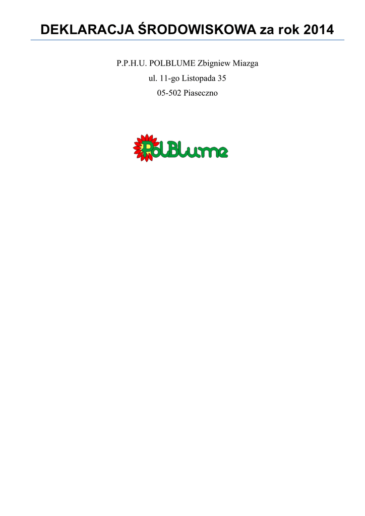 DEKLARACJA ŚRODOWISKOWA za rok 2014 P.P.H.U. POLBLUME Zbigniew Miazga ul. 11-go Listopada 35 05-502 Piaseczno Deklaracja Środowiskowa P.P.H.U. POLBLUME Zbigniew Miazga za 2014 rok Spis treści 1.P.P.H.U. POLBLUME Zbigniew Miazga - działalność, produkty i usługi.........................................3 1.1.Zakres działania.............................................................................................................................3 2.Polityka środowiskowa oraz opis systemu zarządzania środowiskowego..........................................3 2.1.Polityka środowiskowa P.P.H.U. POLBLUME Zbigniew Miazga..............................................3 2.2.System zarządzania środowiskowego w P.P.H.U. POLBLUME Zbigniew Miazga....................5 3.Aspekty środowiskowe bezpośrednie i pośrednie...............................................................................6 3.1.Bezpośrednie aspekty środowiskowe............................................................................................9 3.2.Pośrednie aspekty środowiskowe................................................................................................12 4.Cele i zadania środowiskowe.............................................................................................................13 5.Kluczowe wskaźniki efektywności środowiskowej P.P.H.U. POLBLUME Zbigniew Miazga.......14 5.1.Efektywność energetyczna..........................................................................................................14 5.2.Wykorzystywanie materiałów.....................................................................................................14 5.3.Gospodarka wodno-ściekowa.....................................................................................................15 5.4.Gospodarka odpadami.................................................................................................................15 5.5.Różnorodność biologiczna..........................................................................................................16 5.6.Wskaźniki emisji do powietrza...................................................................................................16 6.Zgodność z wymaganiami prawnymi i innymi dotyczącymi ochrony środowiska ..........................18 Wydanie 2 z dnia: 15.06.2015 r. Strona 2 z 18 Deklaracja Środowiskowa P.P.H.U. POLBLUME Zbigniew Miazga za 2014 rok 1. P.P.H.U. POLBLUME Zbigniew Miazga - działalność, produkty i usługi. 1.1. Zakres działania. Firma P.P.H.U. POLBLUME Zbigniew Miazga istnieje na rynku od roku 1989. Jest to firma prywatna posiadająca status Zakładu Pracy Chronionej. Dotychczas działalność przedsiębiorstwa obejmowała swym zakresem produkcję opakowań tekturowych oraz handel artykułami biurowymi. W wyniku restrukturyzacji w 2009 roku firma została Zakładem Przetwarzania Zużytego Sprzętu Elektrycznego i Elektronicznego i Recyklingu Odpadów, która zapewnia kompleksową obsługę polegającą na odbiorze, transporcie i zagospodarowaniu odpadów oraz poddawaniu ich procesom odzysku. Firma obsługuje zarówno firmy jak i osoby fizyczne oraz jest wpisana w rejestrze Przedsiębiorców i Organizacji Odzysku Sprzętu Elektrycznego i Elektronicznego prowadzonego przez Główny Inspektorat Ochrony Środowiska pod numerem E0010352ZPR. Firma P.P.H.U. POLBLUME Zbigniew Miazga jest aktywnym członkiem następujących organizacji branżowych: - Stowarzyszenie Grupa Polskich Przedsiębiorców Ekologia (GPP Ekologia) - Klaster Gospodarki Odpadowej i Recyklingu Podstawowym celem firmy Polblume jest jak najlepsze zagospodarowanie odpadów zgodnie z najnowszymi dostępnymi technologiami. Posiadając wymagane w tego typu działalności zezwolenia Firma zapewnia zgodne z Prawem Ochrony Środowiska postępowanie z odpadami, co przyczynia się do zmniejszenia zanieczyszczenia otaczającego nas środowiska. 2. Polityka środowiskowa oraz opis systemu zarządzania środowiskowego. 2.1. Polityka środowiskowa P.P.H.U. POLBLUME Zbigniew Miazga. Polityka środowiskowa jest udostępniona w miejscu ogólnodostępnym dla pracowników oraz gości P.P.H.U. POLBLUME Zbigniew Miazga, a także przesyłana na wniosek zainteresowanych stron. Wydanie 2 z dnia: 15.06.2015 r. Strona 3 z 18 Deklaracja Środowiskowa P.P.H.U. POLBLUME Zbigniew Miazga za 2014 rok Wydanie 2 z dnia: 15.06.2015 r. Strona 4 z 18 Deklaracja Środowiskowa P.P.H.U. POLBLUME Zbigniew Miazga za 2014 rok 2.2. System zarządzania środowiskowego w P.P.H.U. POLBLUME Zbigniew Miazga. System Zarządzania Środowiskowego został ustanowiony i obejmuje odbiór, transport i zagospodarowanie odpadów oraz poddawanie ich procesom odzysku. System zarządzania obejmuje biuro zlokalizowane w Piasecznie przy ul. 11 Listopada 35 oraz zakład przetwarzania zlokalizowany w Górze Kalwarii przy ul. Adamowicza 4. Kierownictwo P.P.H.U. POLBLUME Zbigniew Miazga przyjęło pełną odpowiedzialność za ustalenie, wdrożenie, rozwój i ciągłe doskonalenie systemu ekozarządzania i audytu zgodnego z wymaganiami rozporządzenia EMAS. Zaangażowanie kierownictwa dla wspierania powyższych działań jest realizowane poprzez: - ustanowienie Polityki Środowiskowej, - zapewnienie niezbędnych zasobów do ustanowienia, wdrożenia, utrzymania i doskonalenia systemu zarządzania środowiskowego, - zorganizowanie i prowadzenie komunikacji z pracownikami oraz zainteresowanymi stronami, - zapewnienie, że ustanowione są cele i zadania, - przeprowadzanie przeglądów zarządzania. Odpowiedzialność za system ekozarządzania i audytu zgodnego z wymaganiami rozporządzenia EMAS spoczywa w rękach Prezesa Zarządu. Natomiast za koordynację funkcjonowania systemu ekozarządzania zgodnego z wymaganiami EMAS odpowiada Pełnomocnik ds. SZŚ. Jednocześnie pełnomocnik jest osobą uprawnioną do prowadzenia dialogu dotyczącego działań środowiskowych wynikających z systemu EMAS z zainteresowany
