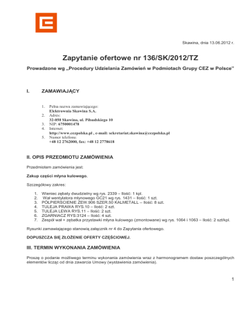 Skawina, dnia 13.06.2012 r. Zapytanie ofertowe nr 136/SK/2012/TZ Prowadzone wg „Procedury Udzielania Zamówień w Podmiotach Grupy CEZ w Polsce” I. ZAMAWIAJĄCY 1. 2. 3. 4. 5. Pełna nazwa zamawiającego: Elektrownia Skawina S.A. Adres: 32-050 Skawina, ul. Piłsudskiego 10 NIP: 6750001478 Internet: http://www.cezpolska.pl , e-mail: [email protected] Numer telefonu: +48 12 2762000, fax: +48 12 2778618 II. OPIS PRZEDMIOTU ZAMÓWIENIA Przedmiotem zamówienia jest: Zakup części młyna kulowego. Szczegółowy zakres: 1. 2. 3. 4. 5. 6. 7. Wieniec zębaty dwudzielny wg rys. 2339 – Ilość: 1 kpl. Wał wentylatora młynowego GC21 wg rys. 1431 – Ilość: 1 szt. PÓŁPIERSCIENIE ZEW.906 SZER.50 KALMETALL – Ilość: 8 szt. TULEJA PRAWA RYS.10 – Ilość: 2 szt. TULEJA LEWA RYS.11 – Ilość: 2 szt. ZGARNIACZ RYS:3124 – Ilość: 4 szt. Zespół wał + zębatka przystawki młyna kulowego (zmontowane) wg rys. 1064 i 1063 – Ilość: 2 szt/kpl. Rysunki zamawiającego stanowią załącznik nr 4 do Zapytania ofertowego. DOPUSZCZA SIĘ ZŁOŻENIE OFERTY CZĘŚCIOWEJ. III. TERMIN WYKONANIA ZAMÓWIENIA Proszę o podanie możliwego terminu wykonania zamówienia wraz z harmonogramem dostaw poszczególnych elementów licząc od dnia zawarcia Umowy (wystawienia zamówienia). 1 IV. SPOSÓB PRZYGOTOWANIA OFERTY 1. Oferta powinna składać się z dwóch oddzielnych części: technicznej i handlowej, w oddzielnych zapieczętowanych kopertach z właściwym dopiskiem na kopertach: „Część techniczna oferty – nr postępowania”, „Część handlowa oferty – nr postępowania”. Koperty z częściami techniczną i handlową powinny być właściwie opisane. 2. Część techniczna oferty powinna zawierać następujące informacje: a. Dokumenty wymienione w pkt. nr V niniejszego zapytania. 3. Część handlowa oferty powinna zawierać następujące informacje: a. Dokumenty wymienione w pkt. nr VI niniejszego zapytania. 4. Każdy oferent może złożyć tylko jedną ofertę. 5. Sposób przygotowania oferty: a. Oferta powinna być napisana czytelnie w języku polskim, b. Wszystkie strony oferty wraz z załącznikami powinny być podpisane przez osobę (osoby) uprawnioną do występowania w imieniu oferenta, c. Wszystkie strony oferty wraz z załącznikami powinny być spięte w sposób zapobiegający jej dekompletacji, d. Wszelkie poprawki lub zmiany w tekście oferty muszą być parafowane i datowane własnoręcznie przez osobę podpisującą ofertę lub przez osobę upoważnioną. 6. Opakowanie i oznakowanie ofert: Ofertę należy złożyć w zamkniętym opakowaniu w miejscu wskazanym w pkt. VIII. 7. Zamawiający nie bierze odpowiedzialności za skutki braku zachowania powyższych warunków przez Oferenta. Nie spełnienie wymagań j/w spowoduje odrzucenie oferty. 8. Oferent poniesie wszelkie koszty związane z przygotowaniem i złożeniem oferty. 9. Płyta CD (opisana: nazwa firmy + dopisek: „Zapytanie – „136/SK/2012/TZ” ze wszystkimi dokumentami i załącznikami wymienionymi w pkt V i VI załączona w części technicznej oferty). Dokumenty składane są w wersji papierowej w oryginale lub kserokopii poświadczonej za zgodność z oryginałem. Wszelkie dokumenty wymienione w powyższych punktach oprócz tego, że powinny zostać złożone w wersji papierowej, muszą zostać przesłane również w wersji elektronicznej na nośniku CD. 2 V. INFORMACJE O DOKUMENTACH, JAKIE MAJĄ DOSTARCZYĆ DOSTAWCY W CZĘŚCI TECHNICZNEJ OFERTY: 1. Opis proponowanych rozwiązań umożliwiający ocenę zgodności oferowanych rozwiązań z zakresem merytorycznym zawartym w punkcie nr II niniejszego zlecenia. Oferowane rozwiązanie musi być zgodne z zakresem rzeczowym. Odstępstwo od zakresu nie jest dopuszczalne. 2. Dokumentację techniczną wraz ze wszystkimi niezbędnymi certyfikatami. 3. Harmonogram realizacji prac. 4. Dokument gwarancji. (okres i warunki) VI. INFORMACJE O DOKUMENTACH, JAKIE MAJĄ DOSTARCZYĆ DOSTAWCY W CZĘŚCI HANDLOWEJ OFERTY: 1. Aktualny odpis z właściwego rejestru albo aktualne zaświadczenie o wpisie do ewidencji działalności gospodarczej, jeżeli odrębne przepisy wymagają wpisu do rejestru lub zgłoszenia do ewidencji działalności gospodarczej, wystawiony nie wcześniej niż 6 miesięcy przed upływem terminu składania ofert. (lub dokument potwierdzony w tym terminie przez organ wydający), 2. Pełnomocnictwo, jeżeli ofertę podpisują inne osoby niż uprawnione do zaciągania zobowiązań w imieniu oferenta, 3. Oświadczenie oferenta, że nie podlega wykluczeniu z następujących powodów stanowiące załącznik nr 1 do niniejszego zapytania: nie wywiązanie się wobec Zamawiającego z należytą starannością choćby z jednej umowy, nie jest objęty postępowaniem układowym bądź innymi postępowaniami związanymi z restrukturyzacja zadłużenia, wszczęcie postępowania upadłościowego, ogłoszenie upadłości lub będących w trakcie prowadzenia likwidacji. 4. Wypełniony załącznik nr 2 „ First Assesment.xls” do niniejszego zapytania ofertowego (w przypadku firm, które składały ten załącznik w 2012 roku nie wymagamy przedstawienia tego dokumentu, o ile nie zaszły żadne istotne zmiany w zakresie w nim ujętym). 5. Dane kontaktowe osoby upoważnionej ze strony Oferenta do kontaktu z Zamawiającym. 6. Cenę netto w PLN i warunki płatności. Cena winna zawierać wszystkie składniki związane z wykonaniem dostaw opisanych w punkcie nr II niniejszego Zapytania. 7. Oświadczenie oferenta związane z wymaganiami w stosunku do wykonawstwa: A. Akceptacja terminu płatności wynoszącego 30 dni liczonych od daty otrzymania faktury przez Zamawiającego. B. Oświadczenie akceptujące postanowienia Ogólnych Warunków Realizacji Zamówień stanowiące załącznik nr 3 do niniejszego zapytania. 3 VII. TERMIN DO KTÓREGO DOSTAWCA BĘDZIE ZWIĄZANY ZŁOŻONĄ OFERTĄ: Dostawca będzie związany złożoną ofertą do dnia 20.07.2012. VIII. MIEJSCE ORAZ TERMIN SKŁ