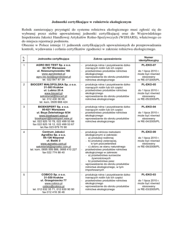 Jednostki certyfikujące w rolnictwie ekologicznym Rolnik zamierzający przystąpić do systemu rolnictwa ekologicznego musi zgłosić się do wybranej przez siebie upoważnionej jednostki certyfikującej oraz do Wojewódzkiego Inspektoratu Jakości Handlowej Artykułów Rolno-Spożywczych (WIJHARS), właściwego co do miejsca rejestracji podmiotu. Obecnie w Polsce istnieje 11 jednostek certyfikujących upoważnionych do przeprowadzania kontroli, wydawania i cofania certyfikatów zgodności w zakresie rolnictwa ekologicznego. L. p. 1 2 3 4 Jednostka certyfikująca Zakres upoważnienia AGRO BIO TEST Sp. z o.o. 02-787 Warszawa ul. Nowoursynowska 166 www.agrobiotest.pl [email protected] tel. 022 847 87 39 – BIOCERT MAŁOPOLSKA Sp. z o.o. 31-503 Kraków ul. Lubicz 25 A www.biocert.pl [email protected] tel. 012 430 36 06 tel. kom. 0509 668 424 – BIOEKSPERT Sp. z o.o. 00-621 Warszawa ul. Boya Żeleńskiego 6/34 www.bioekspert.waw.pl [email protected] tel. 022 825 10 78, 022 499 53 66 fax 022 825 18 12, 022 499 53 67 tel./fax 023 679 70 90 – Centrum Jakości AgroEko Sp. z o.o. 05-126 Nieporęt ul. Baśki 2 www.agroeko.com.pl [email protected] tel. kom. 0695 599 886, 0668 410 227 fax 022 774 88 40 – – – – – – – – – 5 COBICO Sp. z o.o. 31-559 Kraków ul. Grzegórzecka 77 www.cobico.pl [email protected] tel. 012 632 35 71, 012 630 90 90 fax 012 416 36 46 – – – produkcja rolna i pozyskiwanie dziko rosnących roślin lub ich części przetwórstwo produktów rolnictwa ekologicznego wprowadzanie do obrotu produktów rolnictwa ekologicznego produkcja rolna i pozyskiwanie dziko rosnących roślin lub ich części przetwórstwo produktów rolnictwa ekologicznego wprowadzanie do obrotu produktów rolnictwa ekologicznego produkcja rolna i pozyskiwanie dziko rosnących roślin lub ich części przetwórstwo produktów rolnictwa ekologicznego wprowadzanie do obrotu produktów rolnictwa ekologicznego produkcja rolnicza metodami ekologicznymi w zakresie: – a) produkcji roślinnej – b) produkcji zwierzęcej, w tym pszczelarstwa – c) zbioru ze stanu naturalnego przetwórstwo produktów rolnictwa ekologicznego w zakresie: – a) przetwórstwa surowców żywnościowych – b) przetwórstwa pasz wprowadzanie do obrotu produktów rolnictwa ekologicznego, w tym importowanych produkcja rolna i pozyskiwanie dziko rosnących roślin lub ich części przetwórstwo produktów rolnictwa ekologicznego wprowadzanie do obrotu produktów rolnictwa ekologicznego Numer identyfikacyjny PL-EKO-07 do 1 lipca 2010 r. może być również stosowany nr RE-07/2005/PL PL-EKO-05 do 1 lipca 2010 r. może być również stosowany nr RE-05/2005/PL PL-EKO-04 do 1 lipca 2010 r. może być również stosowany nr RE-04/2005/PL PL-EKO-09 do 1 lipca 2010 r. może być również stosowany nr RE-09/2008/PL PL-EKO-03 do 1 lipca 2010 r. może być również stosowany nr RE-03/2005/PL 6 7 8 9 10 Control Union Poland – Sp. z o.o. 70-535 Szczecin ul. Wielka Odrzańska 31/2 – www.controlunion.com – [email protected] tel. 022 640 28 50 tel. kom. 0502 586 328 fax 022 640 28 51 EKOGWARANCJA PTRE Sp. z o.o. 21-008 Tomaszowice Dąbrowica 185 P www.ekogwarancja.pl [email protected] tel. 081 742 68 64 fax 081 742 83 14 tel. kom. 0601 252 506 – PNG Sp. z o.o. Jednostka Certyfikująca PNG w Zajączkowie 26-065 Piekoszów www.png.ecofarm.pl [email protected] tel. 041 306 40 00 tel. kom. 0607 373 695, 0609 725 591 fax 041 306 48 13 – Polskie Centrum Badań i Certyfikacji SA 02-699 Warszawa ul. Kłobucka 23 A www.pcbc.gov.pl [email protected] tel. 067 213 87 00 fax 067 213 83 84 – SGS Polska Sp. z o.o. 01-233 Warszawa ul. Bema 83 www.pl.sgs.com [email protected] [email protected] tel. 022 329 22 22, 022 329 22 03 fax 022 329 22 20 – – – – – – – – – – 11 TÜV Rheinland Polska Sp. z o.o. 02-146 Warszawa ul. 17 Stycznia 56 www.tuv.pl [email protected] tel. 022 846 79 99, 022 846 51 63 fax 022 868 37 42 – – – – produkcja roślinna, w tym: a) produkcja rolna b) zbiór ze stanu naturalnego produkcja zwierzęca wprowadzanie do obrotu produktów rolnictwa ekologicznego importowanych z krajów trzecich PL-EKO-11 produkcja rolna i pozyskiwanie dziko rosnących roślin lub ich części przetwórstwo produktów rolnictwa ekologicznego wprowadzanie do obrotu produktów rolnictwa ekologicznego PL-EKO-01 produkcja rolna i pozyskiwanie dziko rosnących roślin lub ich części przetwórstwo produktów rolnictwa ekologicznego wprowadzanie do obrotu produktów rolnictwa ekologicznego produkcja rolna i pozyskiwanie dziko rosnących roślin lub ich części przetwórstwo produktów rolnictwa ekologicznego wprowadzanie do obrotu produktów rolnictwa ekologicznego do 1 lipca 2010 r. może być również stosowany nr RE-01/2005/PL PL-EKO-02 do 1 lipca 2010 r. może być również stosowany nr RE-02/2005/PL PL-EKO-06 do 1 lipca 2010 r. może być również stosowany nr RE-06/2005/PL produkcja roślinna, w tym: a) produkcja rolnej b) zbiór ze stanu naturalnego produkcja zwierzęca, z wyłączeniem pszczelarstwa przetwórstwo produktów rolnictwa ekologicznego, w tym: a) przetwórstwo surowców żywnościowych b) przetwórstwo pasz wprowadzanie do obrotu produktów rolnictwa ekologicznego importowanych z krajów trzecich PL-EKO-10 produkcja rolna w zakresie: a) produkcji roślinnej b) produkcji zwierzęcej, w tym pszczelarstwa, c) zbioru ze stanu naturalnego przetwórstwo surowców żywnościowych przetwórstwo pasz wprowadzenie do obrotu produktów rolnictwa ekologicznego, w tym importowanych PL-EKO-08 źródło: http://www.bip.minrol.gov.pl do 1 lipca 2010 r. może być również stosowany nr RE-08/2008/PL